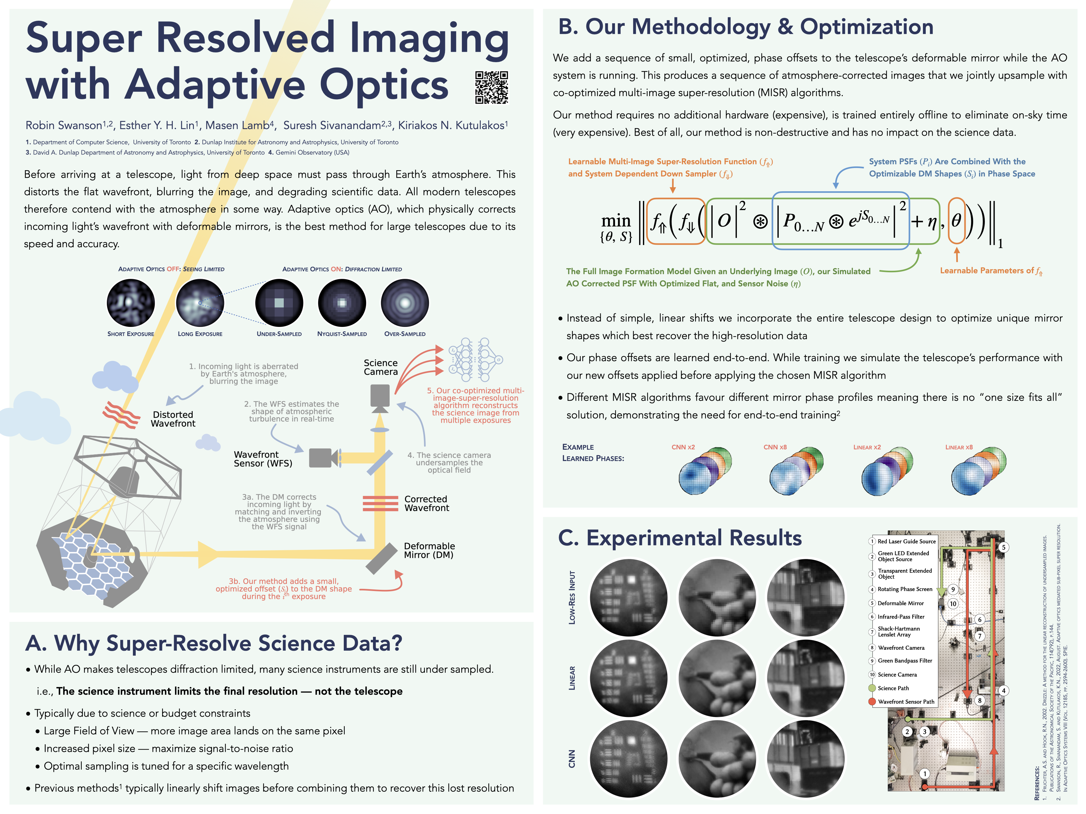 Astronomical telescopes suffer from a tradeoff between field-of-view (FoV) and image resolution: increasing the FoV leads to an optical field that is under-sampled by the science camera. This work presents a novel computational imaging approach to overcome this tradeoff by leveraging the existing adaptive optics (AO) systems in modern ground-based telescopes. Our key idea is to use the AO system’s deformable mirror to apply a series of learned, precisely controlled distortions to the optical wavefront, producing a sequence of images that exhibit distinct, high-frequency, sub-pixel shifts. These images can then be jointly upsampled to yield the final super-resolved image. Crucially, we show this can be done while simultaneously maintaining the core AO operation --- correcting for the unknown and rapidly changing wavefront distortions caused by Earth's atmosphere. To achieve this, we incorporate end-to-end optimization of both the induced mirror distortions and the upsampling algorithm, such that telescope-specific optics and temporal statistics of atmospheric wavefront distortions are accounted for. Our experimental results with a hardware prototype, as well as simulations, demonstrate significant SNR improvements of up to 12 dB over non-AO super-resolution baselines, using only existing telescope optics and no hardware modifications. Moreover, by using a precise bench-top replica of a complete telescope and AO system, we show that our methodology can be readily transferred to an operational telescope.
