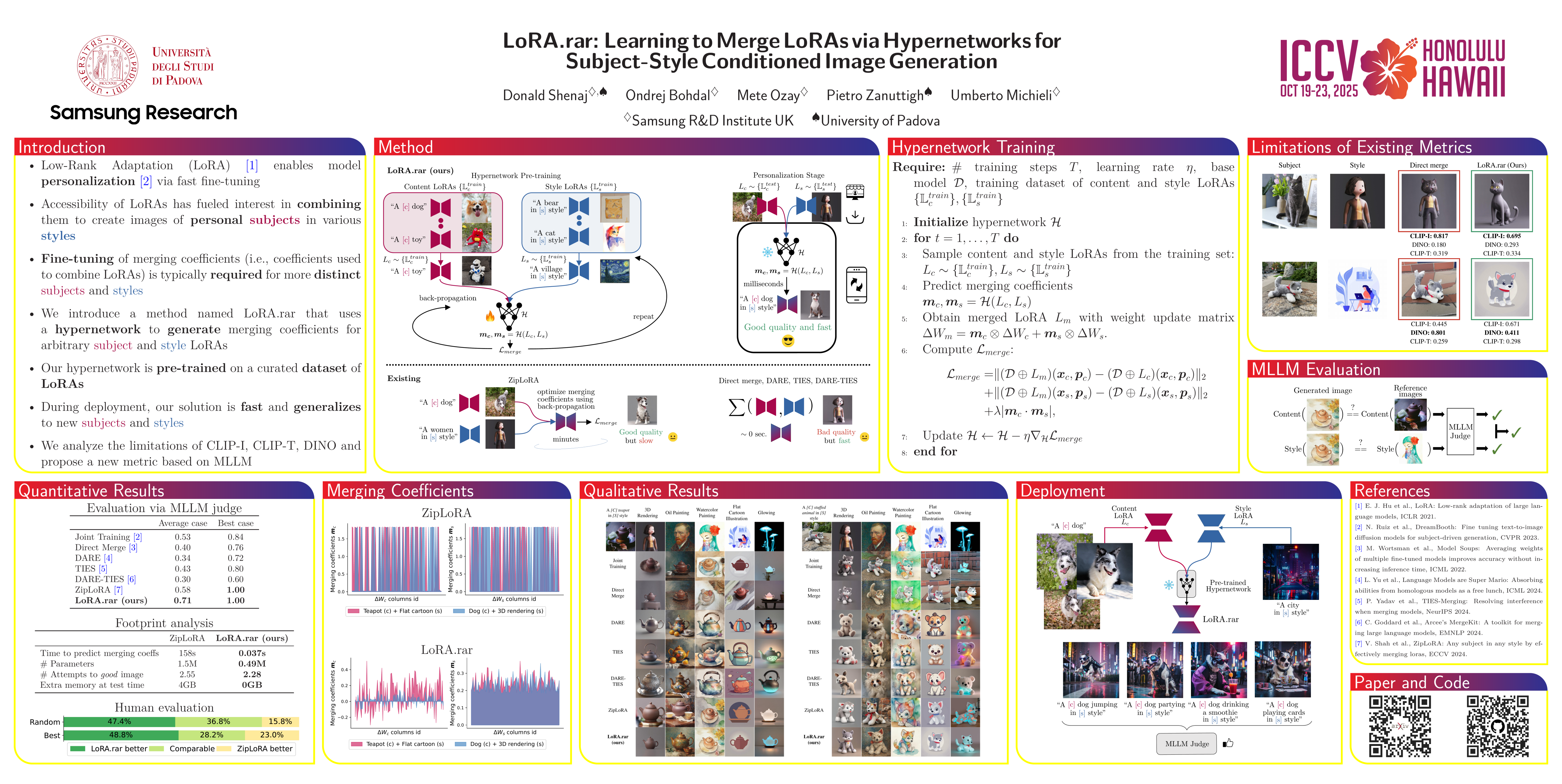 Recent advancements in image generation models have enabled personalized image creation with both user-defined subjects (content) and styles. Prior works achieved personalization by merging corresponding low-rank adapters (LoRAs) through optimization-based methods, which are computationally demanding and unsuitable for real-time use on resource-constrained devices like smartphones. To address this, we introduce LoRA.rar, a method that not only improves image quality but also achieves a remarkable speedup of over $4000\times$ in the merging process. We collect a dataset of style and subject LoRAs and pre-train a hypernetwork on a diverse set of content-style LoRA pairs, learning an efficient merging strategy that generalizes to new, unseen content-style pairs, enabling fast, high-quality personalization. Moreover, we identify limitations in existing evaluation metrics for content-style quality and propose a new protocol using multimodal large language models (MLLMs) for more accurate assessment. Our method significantly outperforms the current state of the art in both content and style fidelity, as validated by MLLM assessments and human evaluations.
