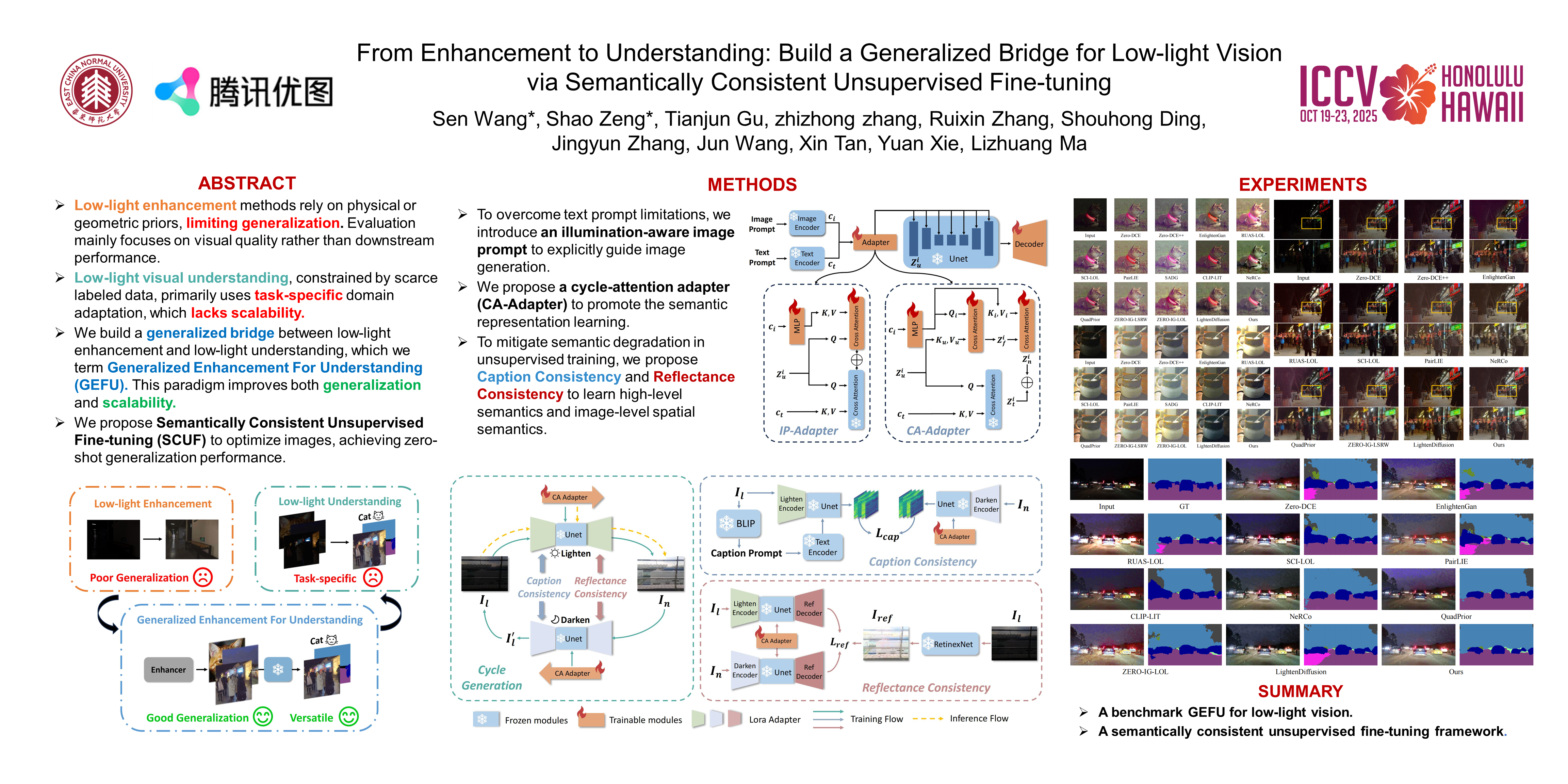 Low-level enhancement and high-level visual understanding in low-light vision have traditionally been treated separately. Low-light enhancement improves image quality for downstream tasks, but existing methods rely on physical or geometric priors, limiting generalization. Evaluation mainly focuses on visual quality rather than downstream performance. Low-light visual understanding, constrained by scarce labeled data, primarily uses task-specific domain adaptation, which lacks scalability. To address these challenges, we build a generalized bridge between low-light enhancement and low-light understanding, which we term Generalized Enhancement For Understanding (GEFU). This paradigm improves both generalization and scalability. To address the diverse causes of low-light degradation, we leverage pretrained generative diffusion models to optimize images, achieving zero-shot generalization performance. Building on this, we propose Semantically Consistent Unsupervised Fine-tuning (SCUF). Specifically, to overcome text prompt limitations, we introduce an illumination-aware image prompt to explicitly guide image generation and propose a cycle-attention adapter to maximize its semantic potential. To mitigate semantic degradation in unsupervised training, we propose caption and reflectance consistency to learn high-level semantics and image-level spatial semantics. Extensive experiments demonstrate that our proposed method outperforms current state-of-the-art methods in traditional image quality and GEFU tasks including classification, detection, and semantic segmentation.
