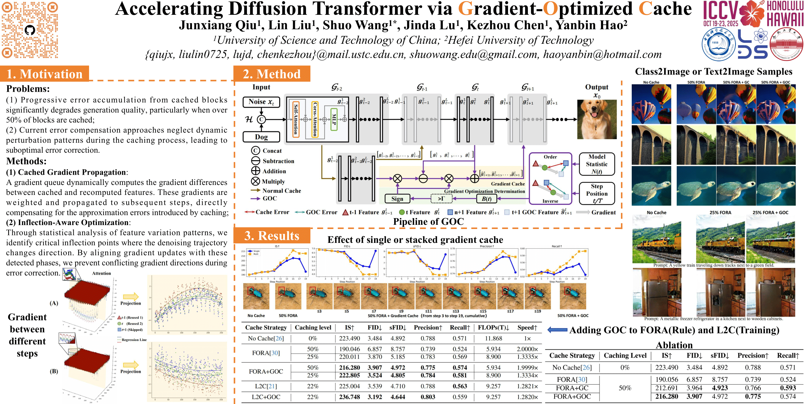 Feature caching has emerged as an effective strategy to accelerate diffusion transformer (DiT) sampling through temporal feature reuse. It is a challenging problem since (1) Progressive error accumulation from cached blocks significantly degrades generation quality, particularly when over 50\% of blocks are cached; (2) Current error compensation approaches neglect dynamic perturbation patterns during the caching process, leading to suboptimal error correction. To solve these problems, we propose the Gradient-Optimized Cache (GOC) with two key innovations: (1) Cached Gradient Propagation: A gradient queue dynamically computes the gradient differences between cached and recomputed features. These gradients are weighted and propagated to subsequent steps, directly compensating for the approximation errors introduced by caching. (2) Inflection-Aware Optimization: Through statistical analysis of feature variation patterns, we identify critical inflection points where the denoising trajectory changes direction. By aligning gradient updates with these detected phases, we prevent conflicting gradient directions during error correction. Extensive evaluations on ImageNet demonstrate GOC's superior trade-off between efficiency and quality. With 50\% cached blocks, GOC achieves IS 216.28 (26.3\%↑) and FID 3.907 (43\%↓) compared to baseline DiT, while maintaining identical computational costs. These improvements persist across various cache ratios, demonstrating robust adaptability to different acceleration requirements. The code is availableat Supplementary Material.