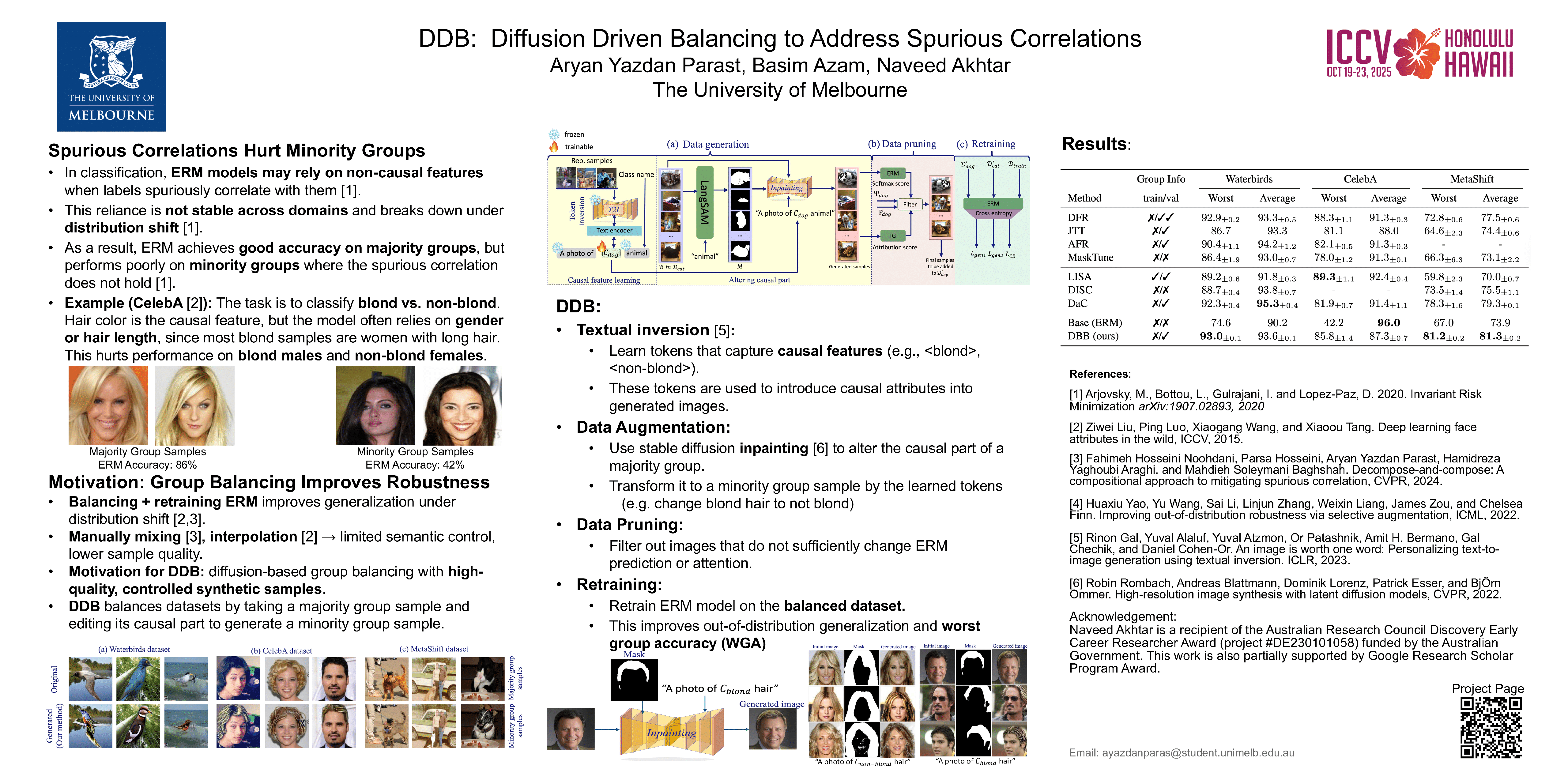 Deep neural networks trained with Empirical Risk Minimization (ERM) perform well when both training and test data come from the same domain, but they often fail to generalize to out-of-distribution samples. In image classification, these models may rely on spurious correlations that often exist between labels and irrelevant features of images, making predictions unreliable when those features do not exist. We propose a Diffusion Driven Balancing (DDB) technique to generate training samples with text-to-image diffusion models for addressing the spurious correlation problem. First, we compute the best describing token for the visual features pertaining to the causal components of samples by a textual inversion mechanism. Then, leveraging a language segmentation method and a diffusion model, we generate new samples by combining the causal component with the elements from other classes. We also meticulously prune the generated samples based on the prediction probabilities and attribution scores of the ERM model to ensure their correct composition for our objective. Finally, we retrain the ERM model on our augmented dataset. This process reduces the model’s reliance on spurious correlations by learning from carefully crafted samples for in which this correlation does not exist. Our experiments show that across different benchmarks, our technique achieves better worst-group accuracy than the existing state-of-the-art methods.