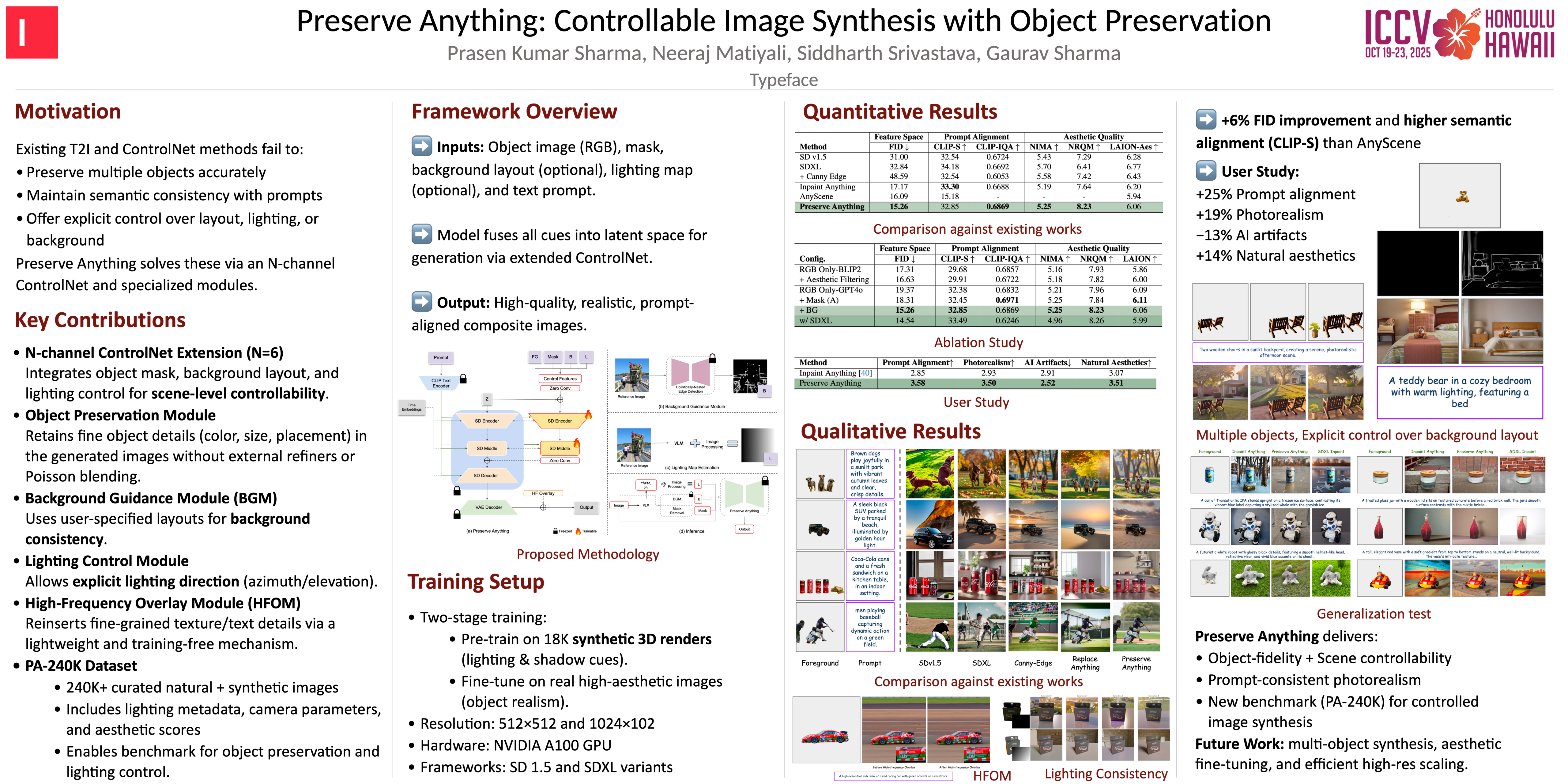 We introduce Preserve Anything, a novel method for con-trolled image synthesis that addresses key limitations in ob-ject preservation and semantic consistency in text-to-image(T2I) generation. Existing approaches often fail (i) to pre-serve multiple objects with fidelity, (ii) maintain semanticalignment with prompts, or (iii) provide explicit control overscene composition. To overcome these challenges, the pro-posed method employs an N-channel ControlNet that inte-grates (i) object preservation with size and placement ag-nosticism, color and detail retention, and artifact elimi-nation, (ii) high-resolution, semantically consistent back-grounds with accurate shadows, lighting, and prompt ad-herence, and (iii) explicit user control over background lay-outs and lighting conditions. Key components of our frame-work include object preservation and background guid-ance modules, enforcing lighting consistency and a high-frequency overlay module to retain fine details while mit-igating unwanted artifacts. We introduce a benchmarkdataset consisting of 240K natural images filtered for aes-thetic quality and 18K 3D-rendered synthetic images withmetadata such as lighting, camera angles, and object rela-tionships. This dataset addresses the deficiencies of existingbenchmarks and allows a complete evaluation. Empiricalresults demonstrate that our method achieves state-of-the-art performance, significantly improving feature-space fi-delity (FID 15.26) and semantic alignment (CLIP-S 32.85)while maintaining competitive aesthetic quality. We alsoconducted a user study to demonstrate the efficacy of theproposed work on unseen benchmark and observed a re-markable improvement of∼ 25%,∼ 19%,∼ 13%, and∼ 14% in terms of prompt alignment, photorealism, thepresence of AI artifacts, and natural aesthetics over existingworks.