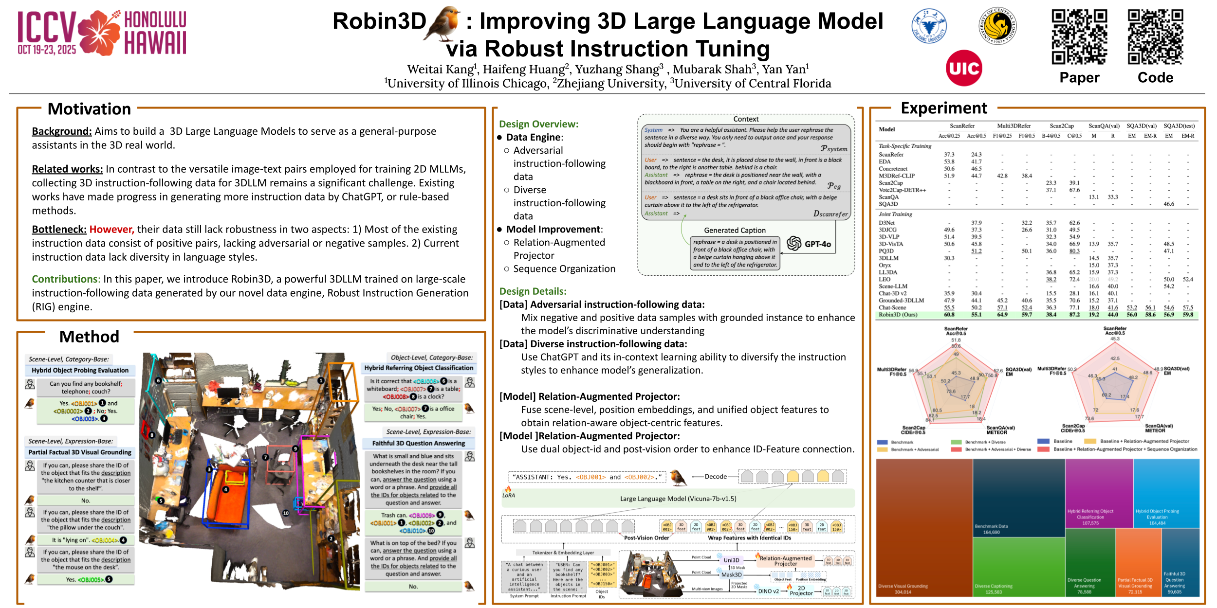 Recent advancements in 3D Large Language Models (3DLLMs) show their potential to build general-purpose agents in the 3D real world, yet challenges remain due to the lack of high-quality robust instruction-following data, leading to limited discriminative power and generalization of 3DLLMs. In this paper, we introduce Robin3D, a powerful 3DLLM trained on large-scale instruction-following data generated by our novel data engine, Robust Instruction Generation (RIG) engine. RIG generates two key instruction data: 1) the Adversarial Instruction-following data, which features mixed negative and positive samples to enhance the model's discriminative understanding. 2) the Diverse Instruction-following data, which contains various instruction styles to enhance model's generalization. As a result, we construct 1 million instruction-following data, consisting of 344K Adversarial samples, 508K Diverse samples, and 165K benchmark training set samples. To better handle these complex instructions, Robin3D further integrates an improved vision projector and enhanced sequence organization. Notably, we achieve a 7.8% improvement in the grounding task (Multi3DRefer) and a 6.9% improvement in the captioning task (Scan2Cap).