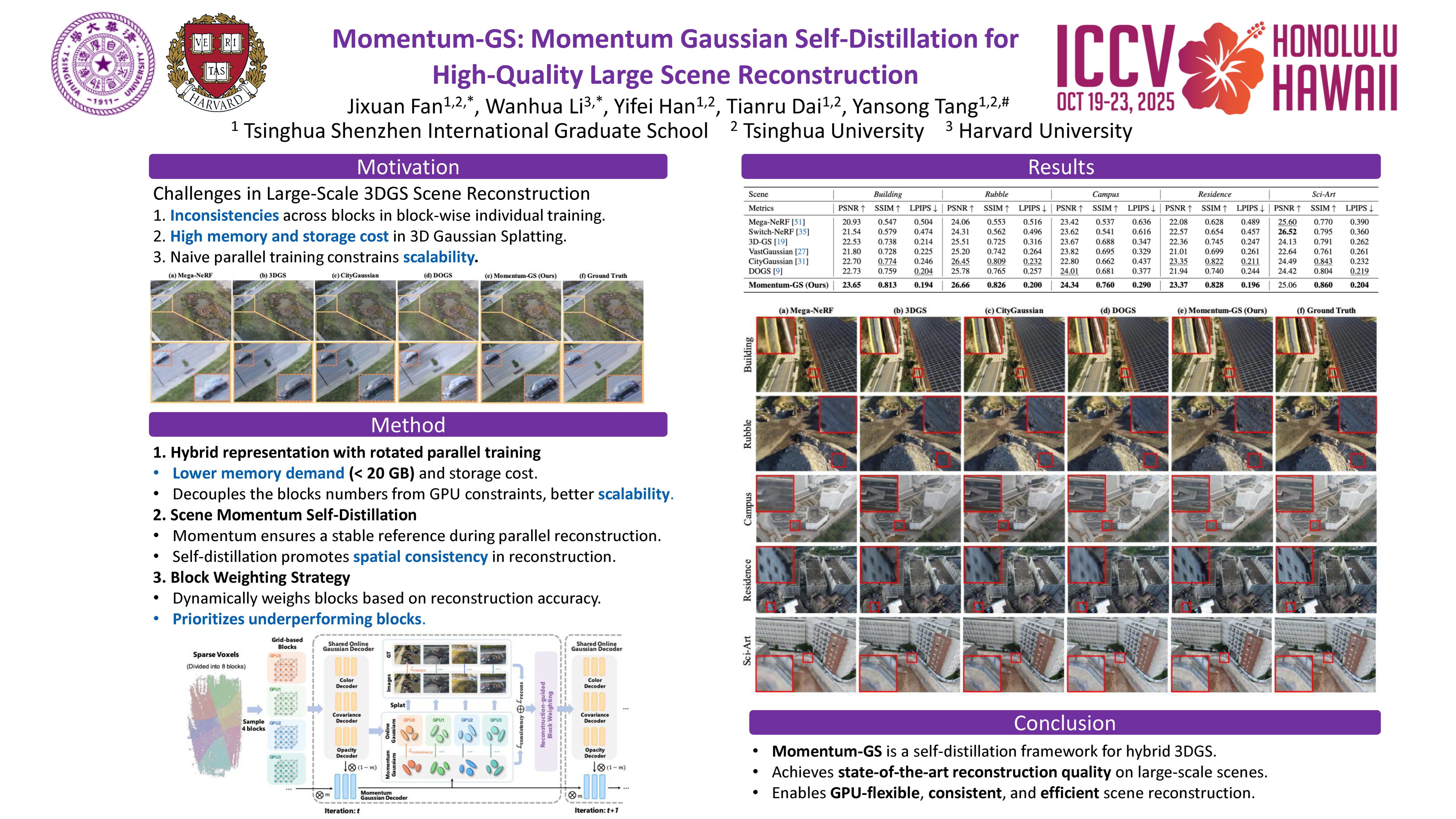 3D Gaussian Splatting has demonstrated notable success in large-scale scene reconstruction, but challenges persist due to high training memory consumption and storage overhead. Hybrid representations that integrate implicit and explicit features offer a way to mitigate these limitations. However, when applied in parallelized block-wise training, two critical issues arise since reconstruction accuracy deteriorates due to reduced data diversity when training each block independently, and parallel training restricts the number of divided blocks to the available number of GPUs. To address these issues, we propose Momentum-GS, a novel approach that leverages momentum-based self-distillation to promote consistency and accuracy across the blocks while decoupling the number of blocks from the physical GPU count. Our method maintains a teacher Gaussian decoder updated with momentum, ensuring a stable reference during training. This teacher provides each block with global guidance in a self-distillation manner, promoting spatial consistency in reconstruction.To further ensure consistency across the blocks, we incorporate block weighting, dynamically adjusting each block’s weight according to its reconstruction accuracy. Extensive experiments on large-scale scenes show that our method consistently outperforms existing techniques, achieving a 18.7% improvement in LPIPS over CityGaussian with much fewer divided blocks and establishing a new state of the art.