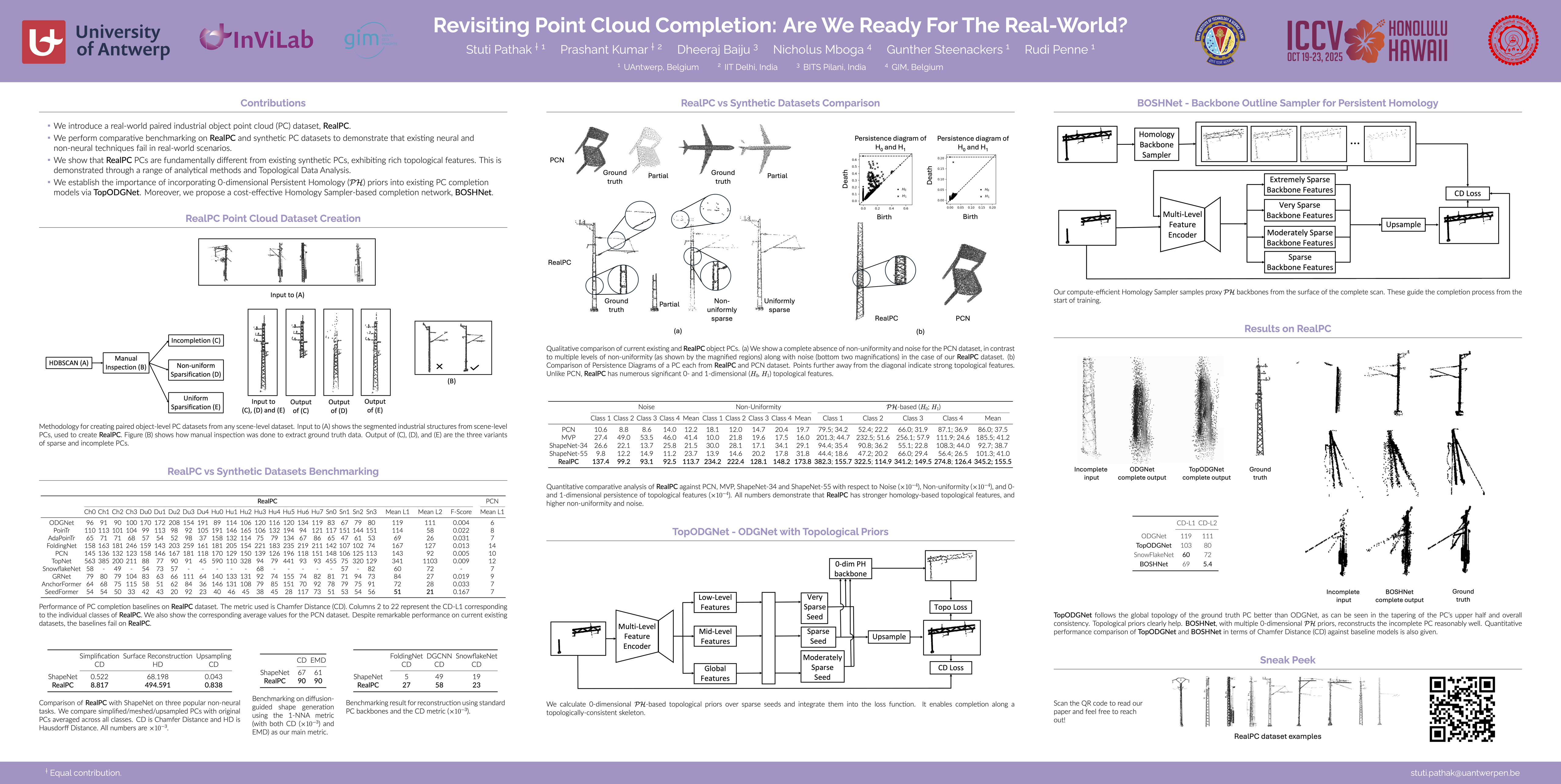 Point clouds acquired in constrained, challenging, uncontrolled, and multi-sensor real-world settings are noisy, incomplete, and non-uniformly sparse. This presents acute challenges for the vital task of point cloud completion. Using tools from Algebraic Topology and Persistent Homology ($\mathcal{PH}$), we demonstrate that current benchmark object point clouds lack rich topological features that are integral part of point clouds captured in realistic environments. To facilitate research in this direction, we contribute the first real-world industrial dataset for point cloud completion, RealPC - a diverse, rich and varied set of point clouds. It consists of $\sim$ 40,000 pairs across 21 categories of industrial structures in railway establishments. Benchmark results on several strong baselines reveal that existing methods fail in real-world scenarios. We discover a striking observation - unlike current datasets, RealPC consists of multiple 0- and 1-dimensional $\mathcal{PH}$-based topological features. We prove that integrating these topological priors into existing works helps improve completion. We present how 0-dimensional $\mathcal{PH}$ priors extract the global topology of a complete shape in the form of a 3D skeleton and assist a model in generating topologically consistent complete shapes. Since computing Homology is expensive, we present a simple, yet effective Homology Sampler guided network, BOSHNet that bypasses the Homology computation by sampling proxy backbones akin to 0-dim $\mathcal{PH}$. These backbones provide similar benefits of 0-dim $\mathcal{PH}$ right from the start of the training, unlike similar methods where accurate backbones are obtained only during later phases of the training.