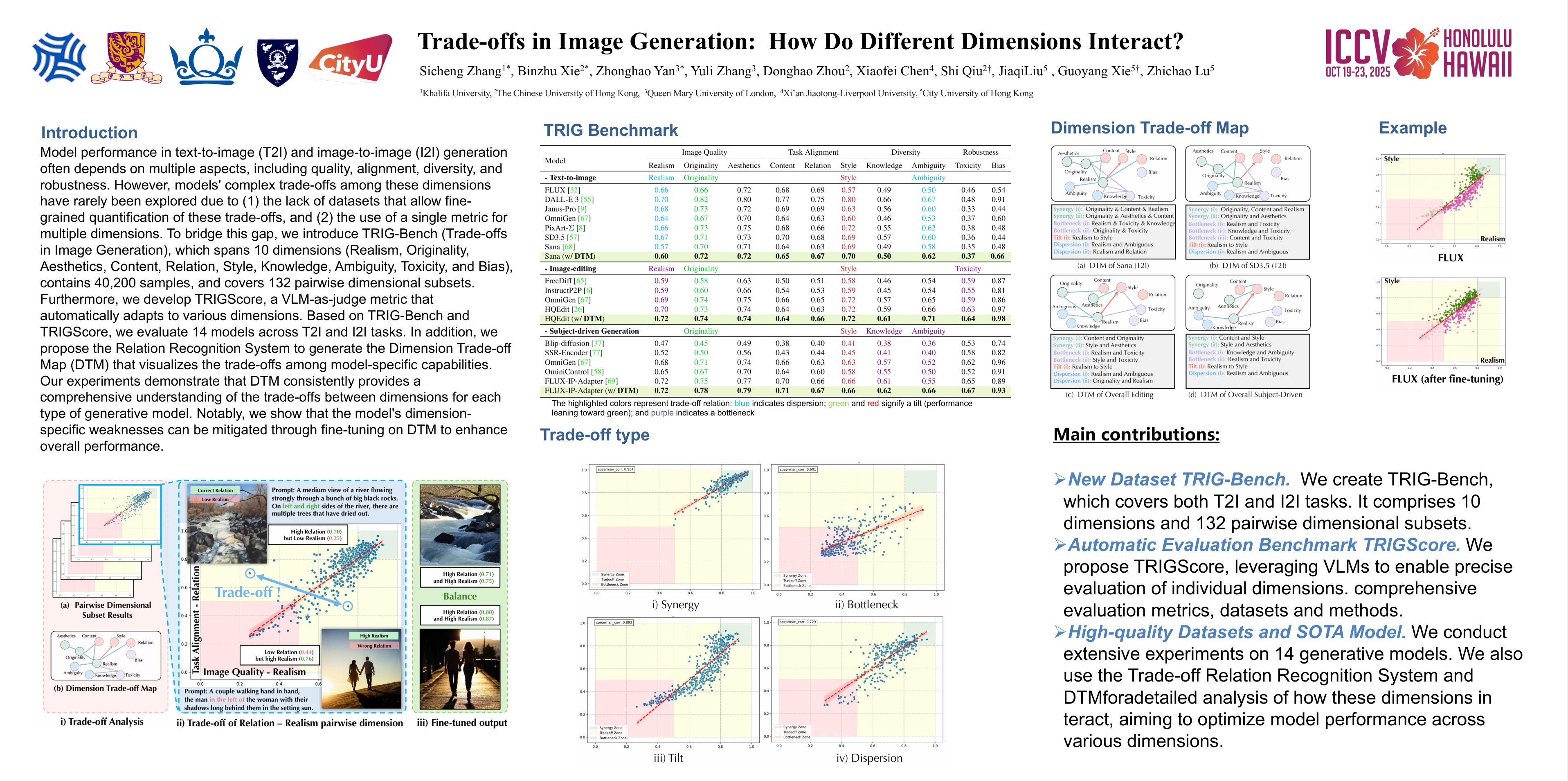 Model performance in text-to-image (T2I) and image-to-image (I2I) generation often depends on multiple aspects, including quality, alignment, diversity, and robustness. However, models’ complex trade-offs among these dimensions have been rarely explored due to (1) the lack of datasets that allow fine-grained quantification of these trade-offs, and (2) using a single metric for multiple dimensions. To address this gap, we introduce TRIG-Bench (Trade-offs in Image Generation), which spans 10 dimensions (Realism, Originality, Aesthetics, Content, Relation, Style, Knowledge, Ambiguity, Toxicity and Bias), contains over 40,200 samples, and covers 132 Pairwise Dimensional Subsets. Furthermore, we develop TRIGScore, a VLM-as-judge metric that automatically adapts to various dimensions. Based on this, we evaluate 14 cutting-edge models across T2I and I2I tasks. In addition, we propose the Relation Recognition System and generate the Dimension Trade-off Map (DTM), which visualizes model-specific capability trade-offs. Our experiments demonstrate that DTM consistently provides a comprehensive understanding of the trade-offs between dimensions for each type of generation models. Notably, after fine-tuning on DTM, the model's dimension-specific impact is mitigated, and overall performance is enhanced.
