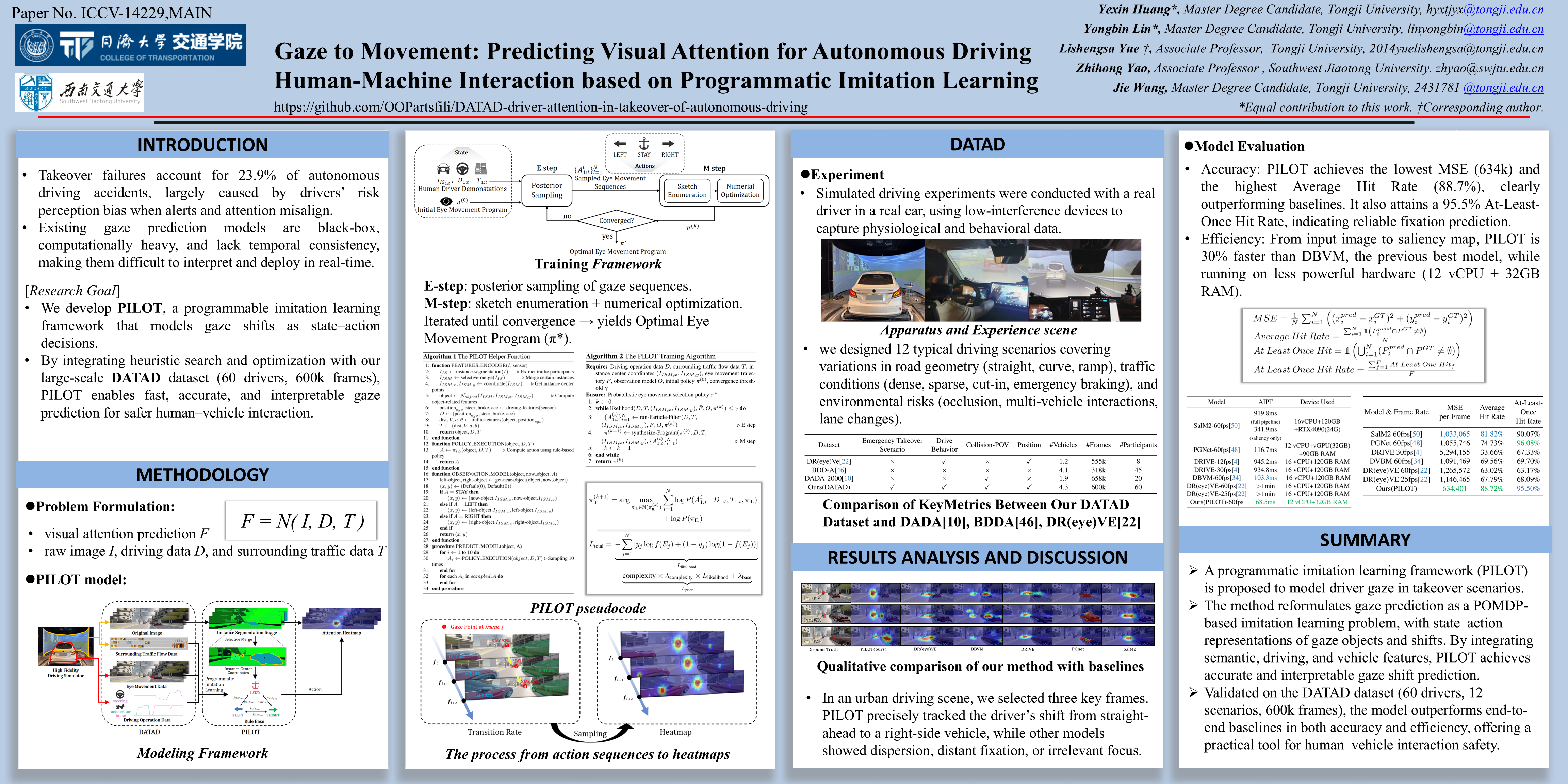Human-machine interaction technology requires not only the distribution of human visual attention but also the prediction of the gaze point trajectory. We introduce $\textbf{PILOT}$, a programmatic imitation learning approach that predicts a driver’s eye movements based on a set of rule-based conditions. These conditions—derived from driving operations and traffic flow characteristics—define how gaze shifts occur. They are initially identified through incremental synthesis, a heuristic search method, and then refined via L-BFGS, a numerical optimization technique. These human-readable rules enable us to understand drivers’ eye movement patterns and make efficient and explainable predictions. We also propose $\textbf{DATAD}$, a dataset that covers 12 types of autonomous driving takeover scenarios, collected from 60 participants and comprising approximately 600,000 frames of gaze point data. Compared to existing eye-tracking datasets, DATAD includes additional driving metrics and surrounding traffic flow characteristics, providing richer contextual information for modeling gaze behavior. Experimental evaluations of PILOT on DATAD demonstrate superior accuracy and faster prediction speeds compared to four baseline models. Specifically, PILOT reduces the MSE of predicted trajectories by 39.91\% to 88.02\% and improves the accuracy of gaze object predictions by 13.99\% to 55.06\%. Moreover, PILOT achieves these gains with approximately 30\% lower prediction time, offering both more accurate and more efficient eye movement prediction.