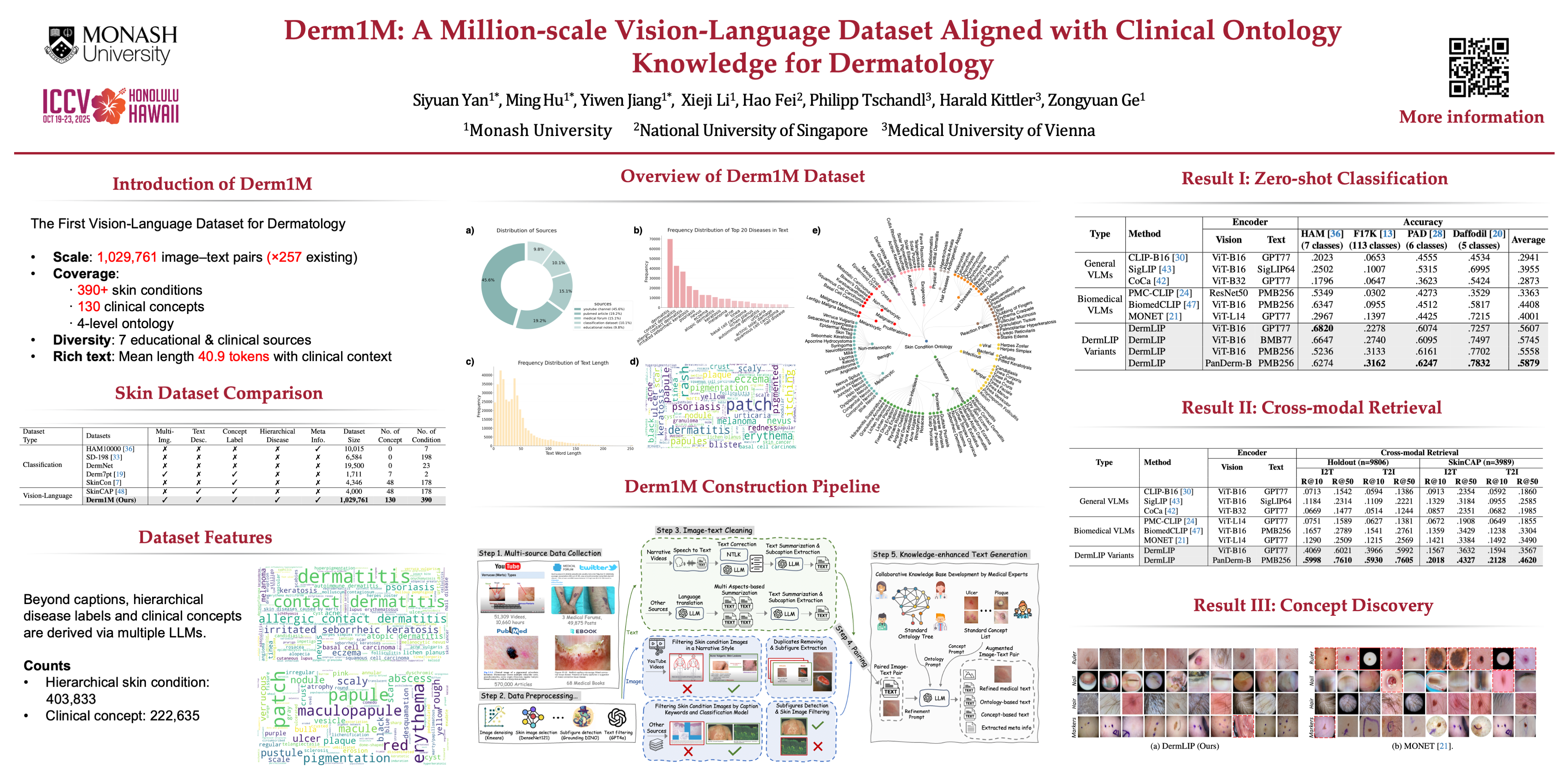 The emergence of vision-language models has transformed medical AI, enabling unprecedented advances in diagnostic capability and clinical applications. However, progress in dermatology has lagged behind other medical domains due to the lack of standard image-text pairs. Existing dermatological datasets are limited in both scale and depth, offering only single-label annotations across a narrow range of diseases instead of rich textual descriptions, and lacking the crucial clinical context needed for real-world applications. To address these limitations, we present Derm1M, the first large-scale vision-language dataset for dermatology, comprising 1,029,761 image-text pairs. Built from diverse educational resources and structured around a standard ontology collaboratively developed by experts, Derm1M provides comprehensive coverage for over 390 skin conditions across four hierarchical levels and 130 clinical concepts with rich contextual information such as medical history, symptoms, and skin tone. To demonstrate Derm1M’s potential in advancing both AI research and clinical application, we pretrained a series of CLIP-like models, collectively called DermLIP, on this dataset. The DermLIP family significantly outperforms state-of-the-art foundation models on eight diverse datasets across multiple tasks, including zero-shot skin disease classification, clinical and artifacts concept identification, few-shot/full-shot learning, and cross-modal retrieval. Our dataset and code will be public.