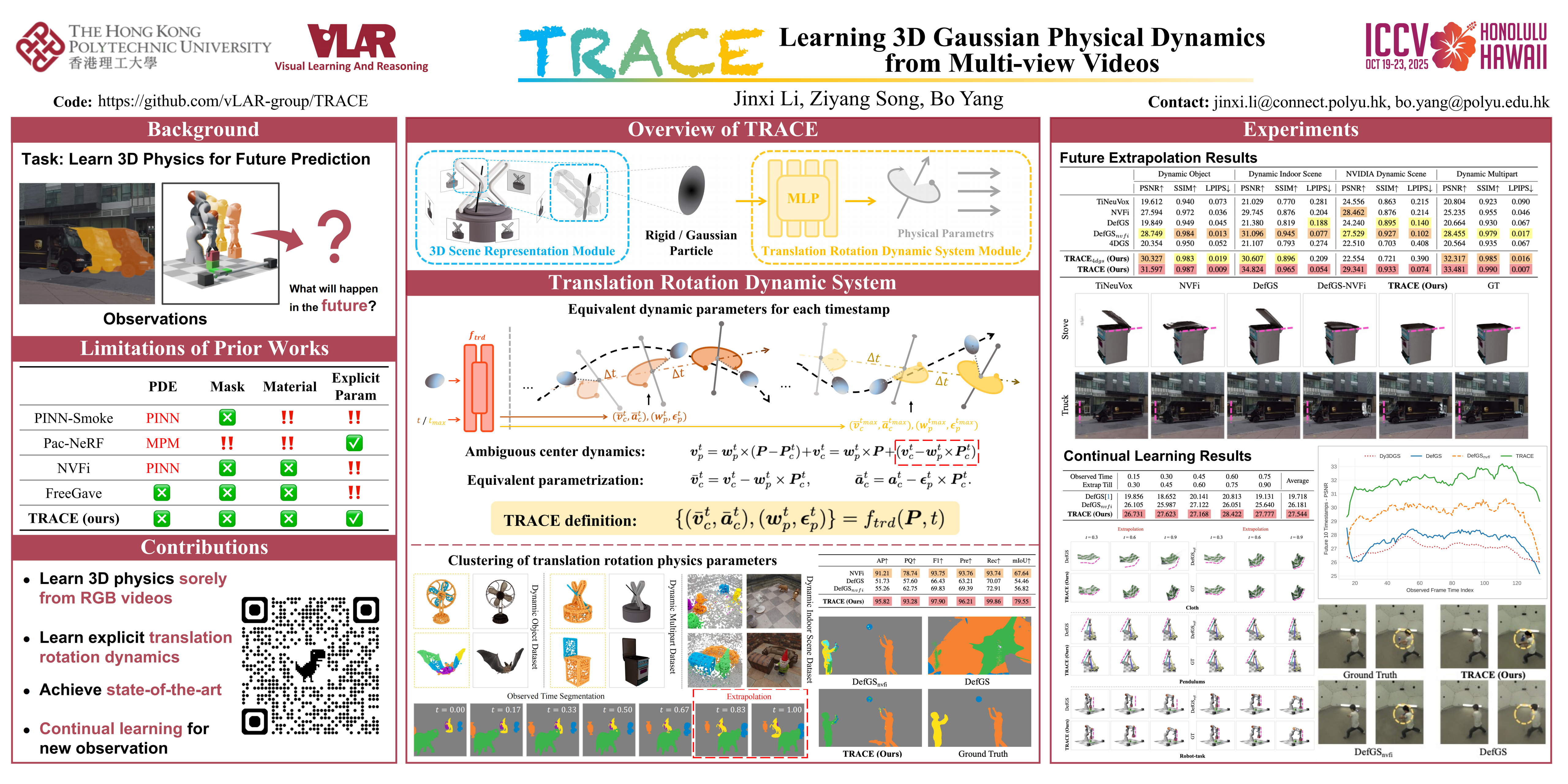In this paper, we aim to model 3D scene geometry, appearance, and physical information just from dynamic multi-view videos in the absence of any human labels. By leveraging physics-informed losses as soft constraints or integrating simple physics models into neural networks, existing works often fail to learn complex motion physics, or doing so requires additional labels such as object types or masks. In this paper, we propose a new framework named TRACE to model the motion physics of complex dynamic 3D scenes. The key novelty of our approach is that, by formulating each 3D point as a rigid particle with size and orientation in space, we choose to directly learn a translation rotation dynamics system for each particle, explicitly estimating a complete set of physical parameters to govern the particle's motion over time. Extensive experiments on three existing dynamic datasets and one newly created challenging synthetic datasets demonstrate the extraordinary performance of our method over baselines in the task of future frame extrapolation. A nice property of our framework is that multiple objects or parts can be easily segmented just by clustering the learned physical parameters. Our datasets and code will be released at https://github.com/.