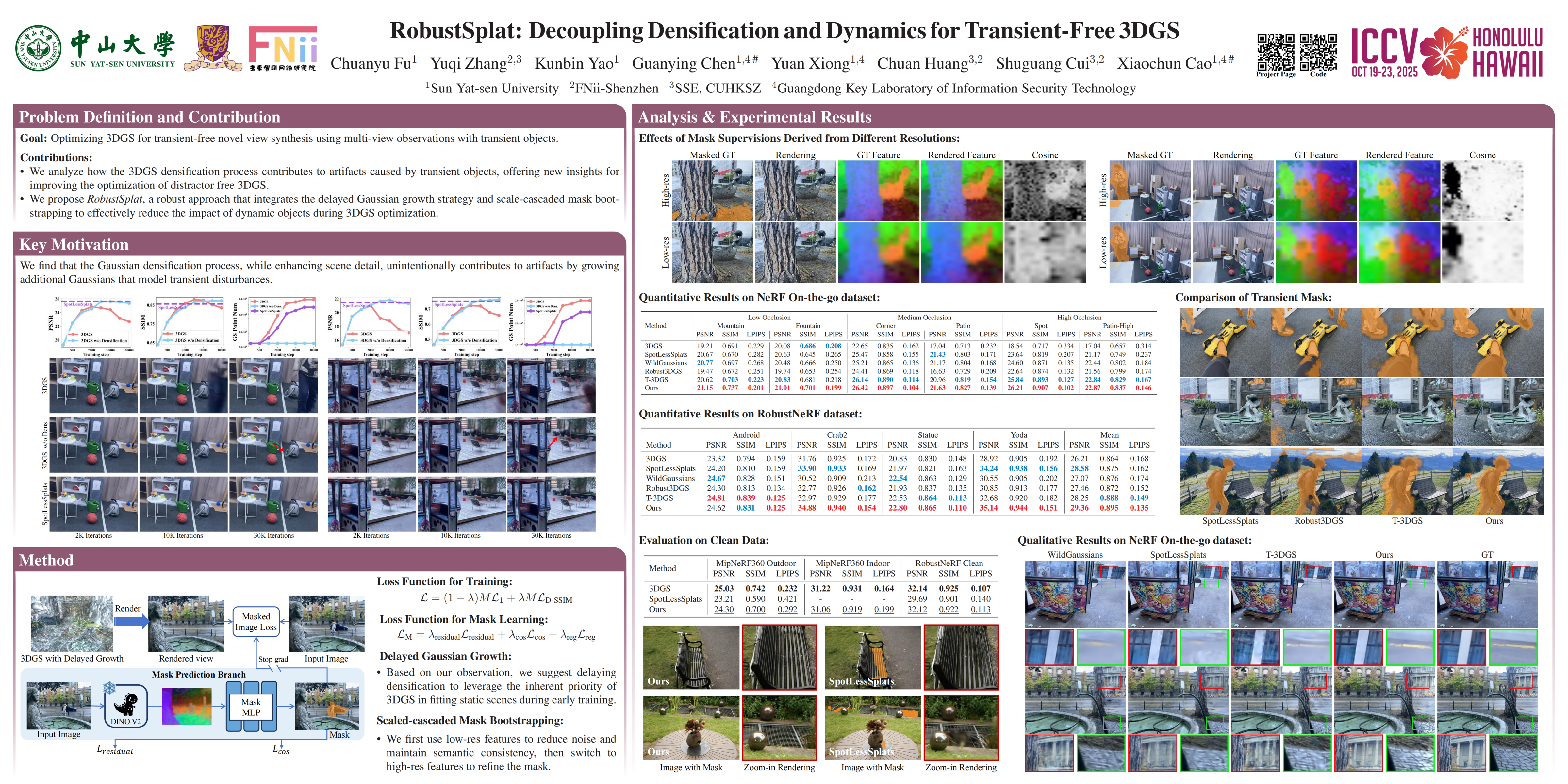 3D Gaussian Splatting (3DGS) has gained significant attention for its real-time, photo-realistic rendering in novel-view synthesis and 3D modeling. However, existing methods struggle with accurately modeling scenes affected by transient objects, leading to artifacts in the rendered images. We identify that the Gaussian densification process, while enhancing scene detail capture, unintentionally contributes to these artifacts by growing additional Gaussians that model transient disturbances. To address this, we propose RobustSplat, a robust solution based on two critical designs. First, we introduce a delayed Gaussian growth strategy that prioritizes optimizing static scene structure before allowing Gaussian splitting/cloning, mitigating overfitting to transient objects in early optimization. Second, we design a scale-cascaded mask bootstrapping approach that first leverages lower-resolution feature similarity supervision for reliable initial transient mask estimation, taking advantage of its stronger semantic consistency and robustness to noise, and then progresses to high-resolution supervision to achieve more precise mask prediction. Extensive experiments on multiple challenging datasets show that our method outperforms existing methods, clearly demonstrating the robustness and effectiveness of our method. Our code will be made publicly available.