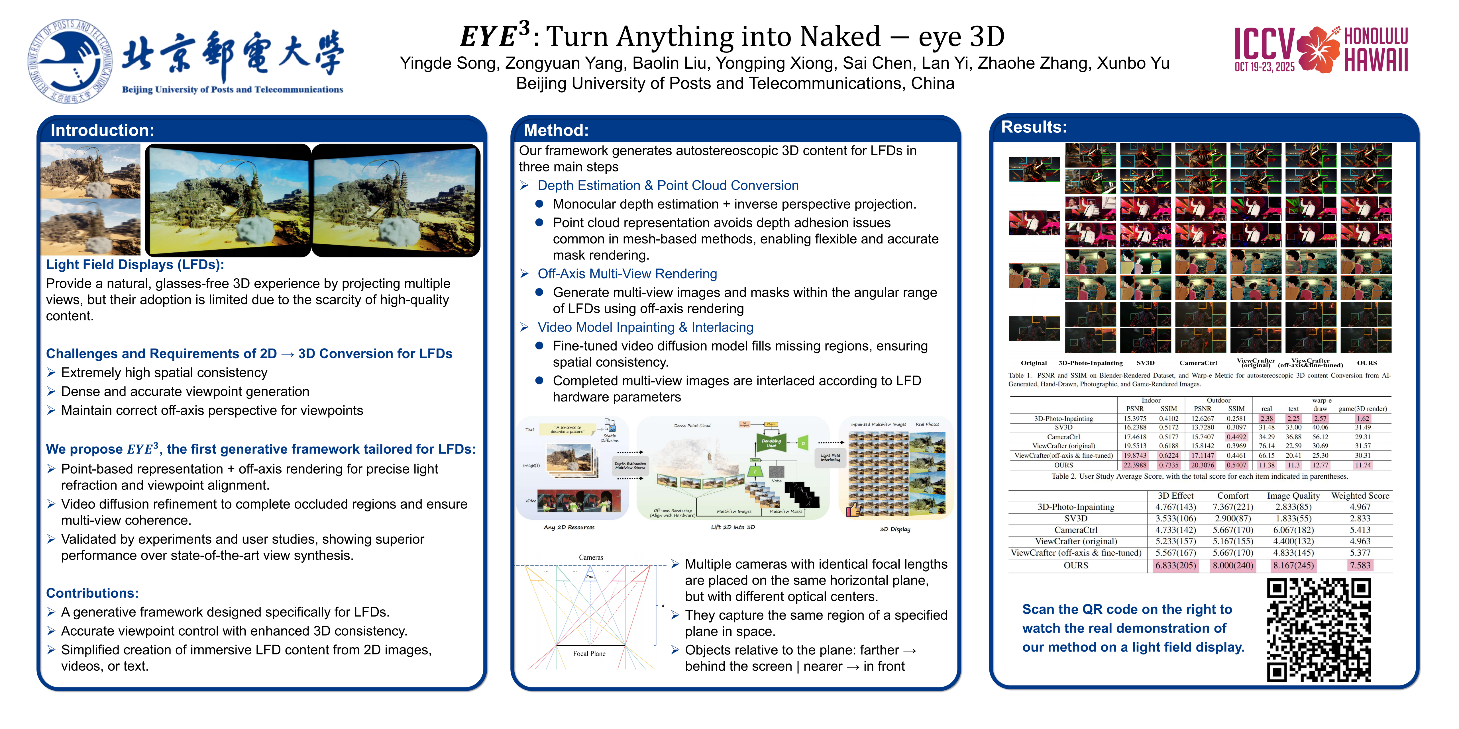 Light Field Displays (LFDs), despite significant advances in hardware technology supporting larger fields of view and multiple viewpoints, still face a critical challenge of limited content availability. Producing autostereoscopic 3D content on these displays requires refracting multi-perspective images into different spatial angles, with strict demands for spatial consistency across views, which is technically challenging for non-experts. Existing image/video generation models and radiance field-based methods cannot directly generate display content that meets the strict requirements of light field display hardware from a single 2D resource.We introduces the first generative framework ${\rm \bf EYE}^{3}$ specifically designed for 3D light field displays, capable of converting any 2D images, videos, or texts into high-quality display content tailored for these screens. The framework employs a point-based representation rendered through off-axis perspective, ensuring precise light refraction and alignment with the hardware's optical requirements. To maintain consistent 3D coherence across multiple viewpoints, we finetune a video diffusion model to fill occluded regions based on the rendered masks.Experimental results demonstrate that our approach outperforms state-of-the-art methods, significantly simplifying content creation for LFDs. With broad potential in industries such as entertainment, advertising, and immersive display technologies, our method offers a robust solution to content scarcity and greatly enhances the visual experience on LFDs.