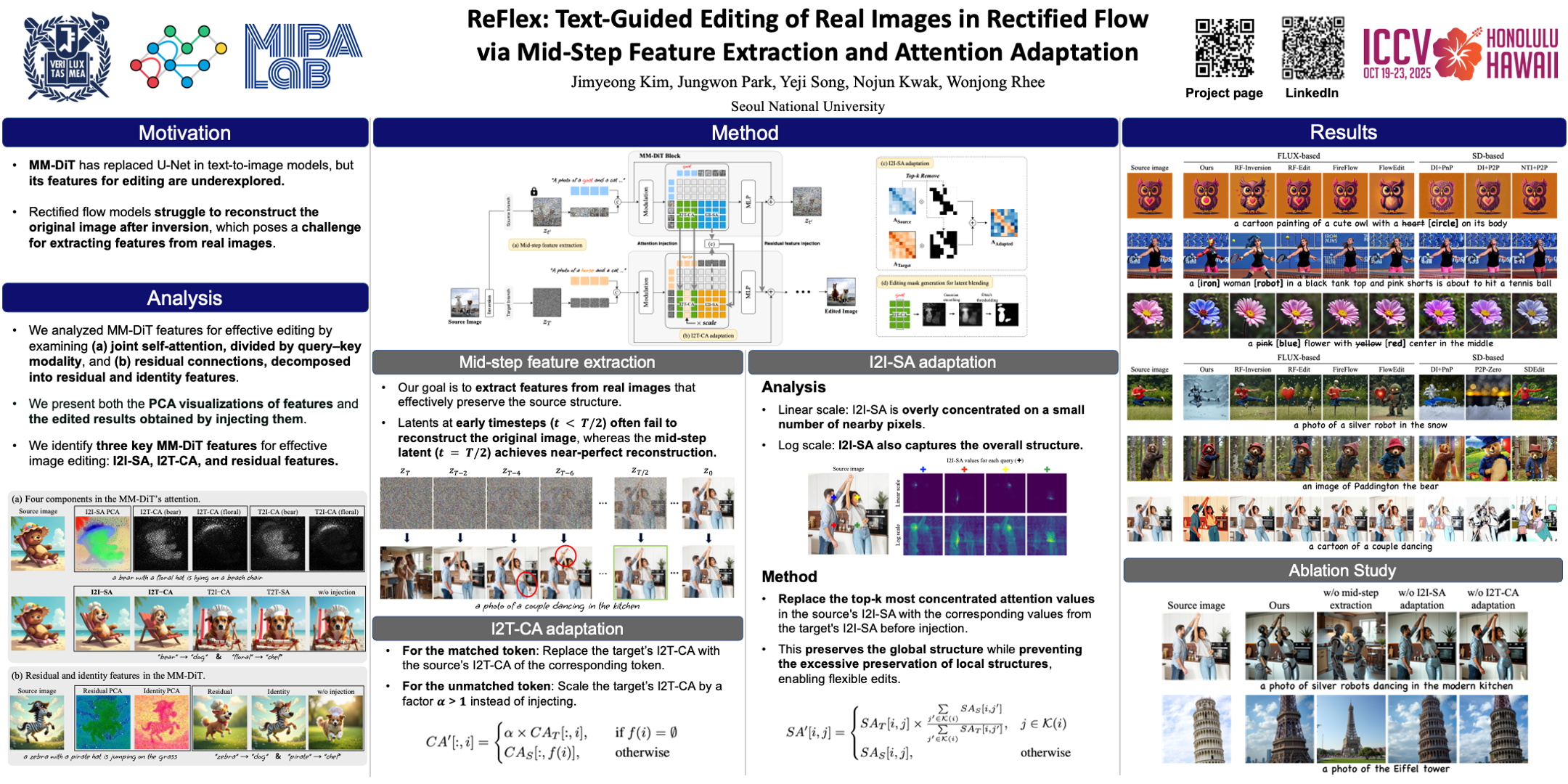Rectified Flow text-to-image models surpass diffusion models in image quality and text alignment, but adapting ReFlow for real-image editing remains challenging. We propose a new real-image editing method for ReFlow by analyzing the intermediate representations of multimodal transformer blocks and identifying three key features. To extract these features from real images with sufficient structural preservation, we leverage mid-step latent, which is inverted only up to the mid-step. We then adapt attention during injection to improve editability and enhance alignment to the target text. Our method is training-free, requires no user-provided mask, and can be applied even without a source prompt. Extensive experiments on two benchmarks with nine baselines demonstrate its superior performance over prior methods, further validated by human evaluations confirming a strong user preference for our approach.