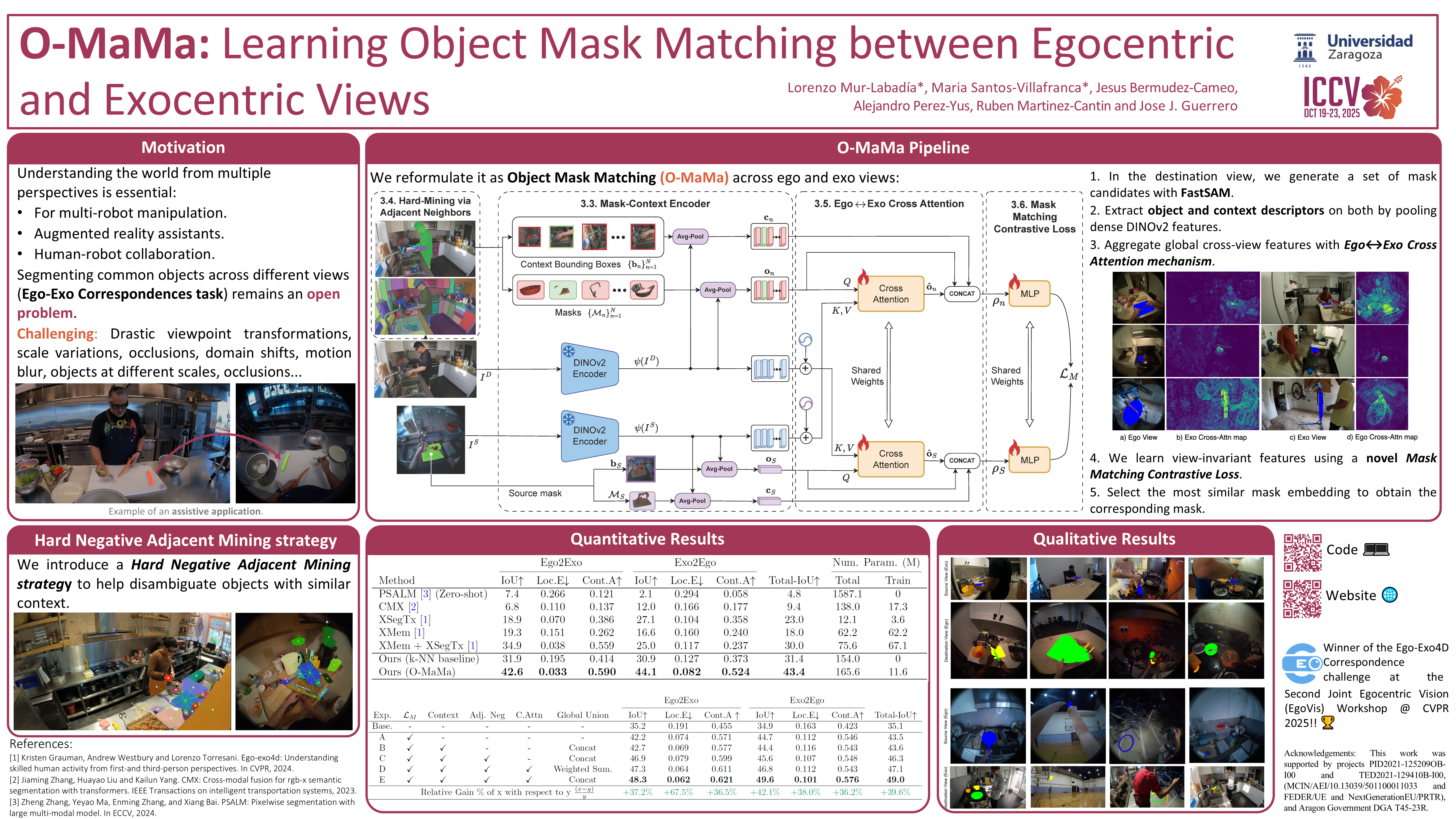 Understanding the world from multiple perspectives is essential for intelligent systems operating together, where segmenting common objects across different views remains an open problem.We introduce a new approach that re-defines cross-image segmentation by treating it as a mask matching task.Our method consists of: (1) A Mask-Context Encoder that pools dense DINOv2 semantic features to obtain discriminative object-level representations from FastSAM mask candidates, (2) a Ego↔Exo Cross-Attention that fuses multi-perspective observations, (3) a Mask Matching contrastive loss that aligns cross-view features in a shared latent space and,(4) a Hard Negative Adjacent Mining strategy to encourage the model to better differentiate between nearby objects.O-MaMa achieves the state of the art in the Ego-Exo4D Correspondences benchmark, obtaining relative gains of +31% and 94% in the Ego2Exo and Exo2Ego IoU against the official challenge baselines and a +13% and +6% compared with the SOTA with 1% of the training parameters.