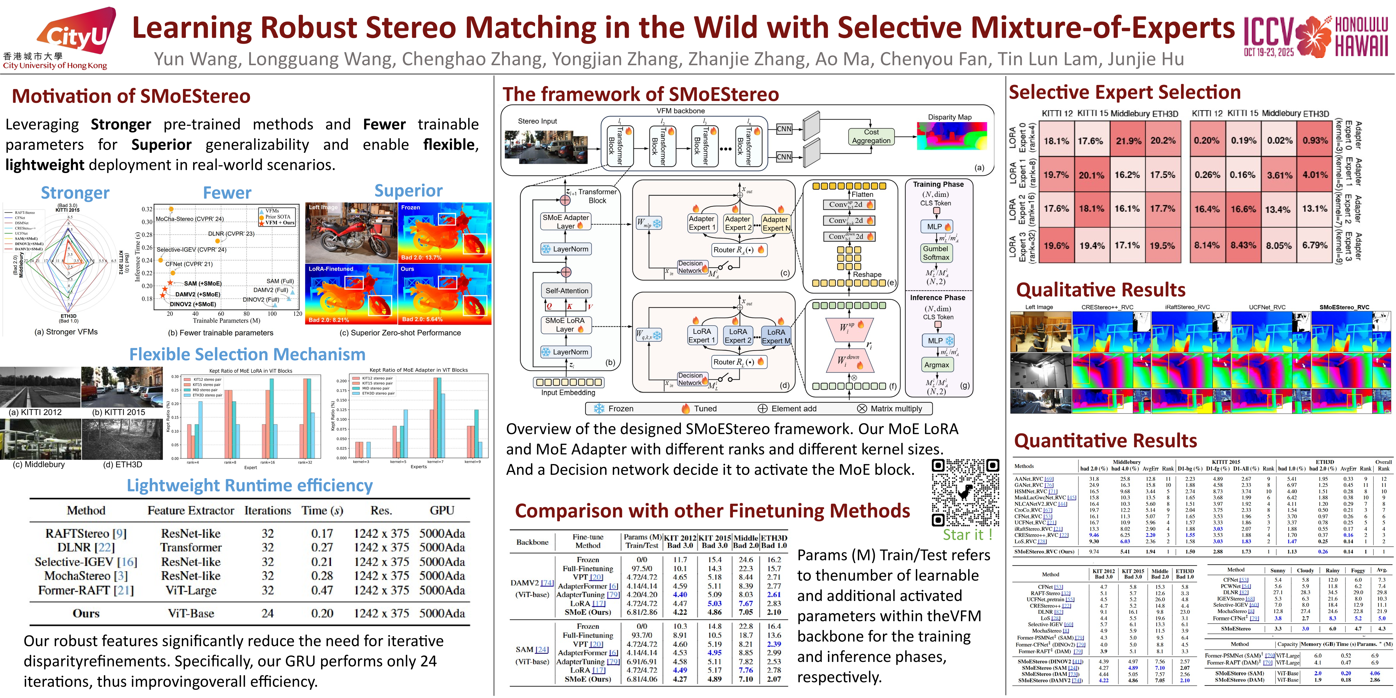 Recently, learning-based stereo matching networks have advanced significantly.However, they often lack robustness and struggle to achieve impressive cross-domain performance due to domain shifts and imbalanced disparity distributions among diverse datasets.Leveraging Vision Foundation Models (VFMs) can intuitively enhance the model's robustness, but integrating such a model into stereo matching cost-effectively to fully realize their robustness remains a key challenge.To address this, we propose SMoEStereo, a novel framework that adapts VFMs for stereo matching through a tailored, scene-specific fusion of Low-Rank Adaptation (LoRA) and Mixture-of-Experts (MoE) modules.SMoEStereo introduces MoE-LoRA with adaptive ranks and MoE-Adapter with adaptive kernel sizes. The former dynamically selects optimal experts within MoE to adapt varying scenes across domains, while the latter injects inductive bias into frozen VFMs to improve geometric feature extraction.Importantly, to mitigate computational overhead, we further propose a lightweight decision network that selectively activates MoE modules based on input complexity, balancing efficiency with accuracy. Extensive experiments demonstrate that our method exhibits state-of-the-art cross-domain and joint generalization across multiple benchmarks without dataset-specific adaptation.