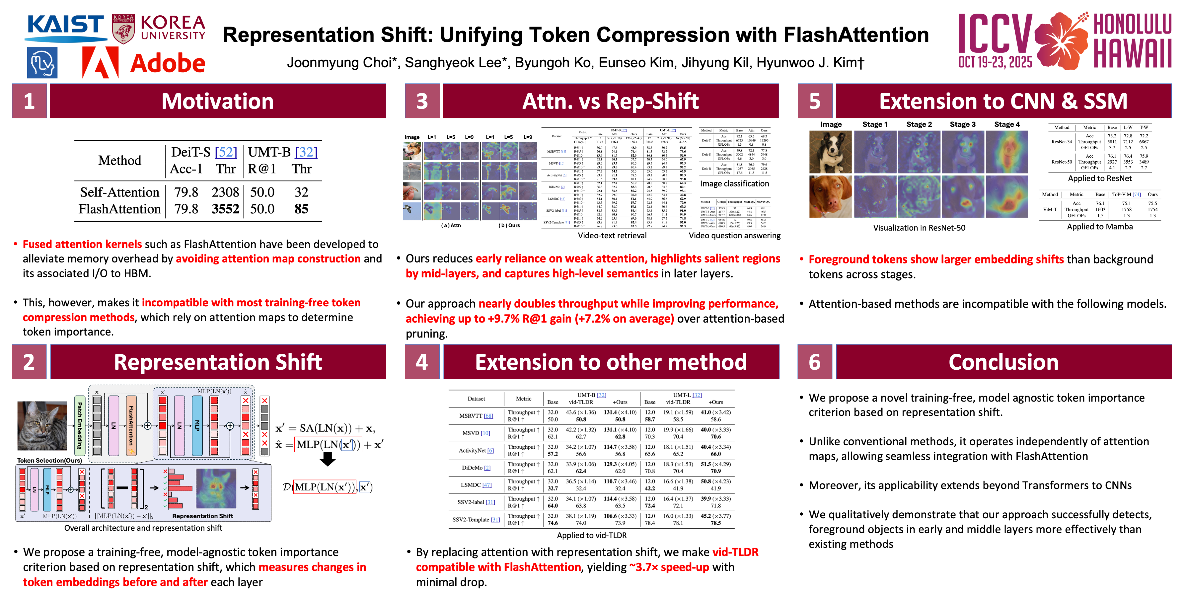 Transformers have demonstrated remarkable success across various vision tasks, yet the quadratic complexity of self-attention remains a challenge for efficient inference.To address this, previous works such as FlashAttention optimize GPU memory access, and token compression techniques have been explored to reduce computational cost by reducing the number of tokens.However, conventional token importance measures rely on additional learnable modules or attention maps, making them impractical in training-free settings and incompatible with FlashAttention due to the inaccessibility of intermediate attention maps to minimize memory access.Here, we propose a novel training-free, model-agnostic token importance criterion, representation shift, which quantifies the information injected by each operation.Combined with the proposed representation shift, we can apply token compression on FlashAttention to further boost inference speed without requiring additional training or attention maps. This method also extends naturally beyond Transformers, e.g., convolutional neural networks (CNNs).Extensive experiments demonstrate that our representation shift, allowing token compression with FlashAttention and CNNs, results in up to 5.5$\times$ speed-up in video understandings.Through quantitative and qualitative experiments, we have shown that representation shift is a more robust alternative to conventional attention-based scores.