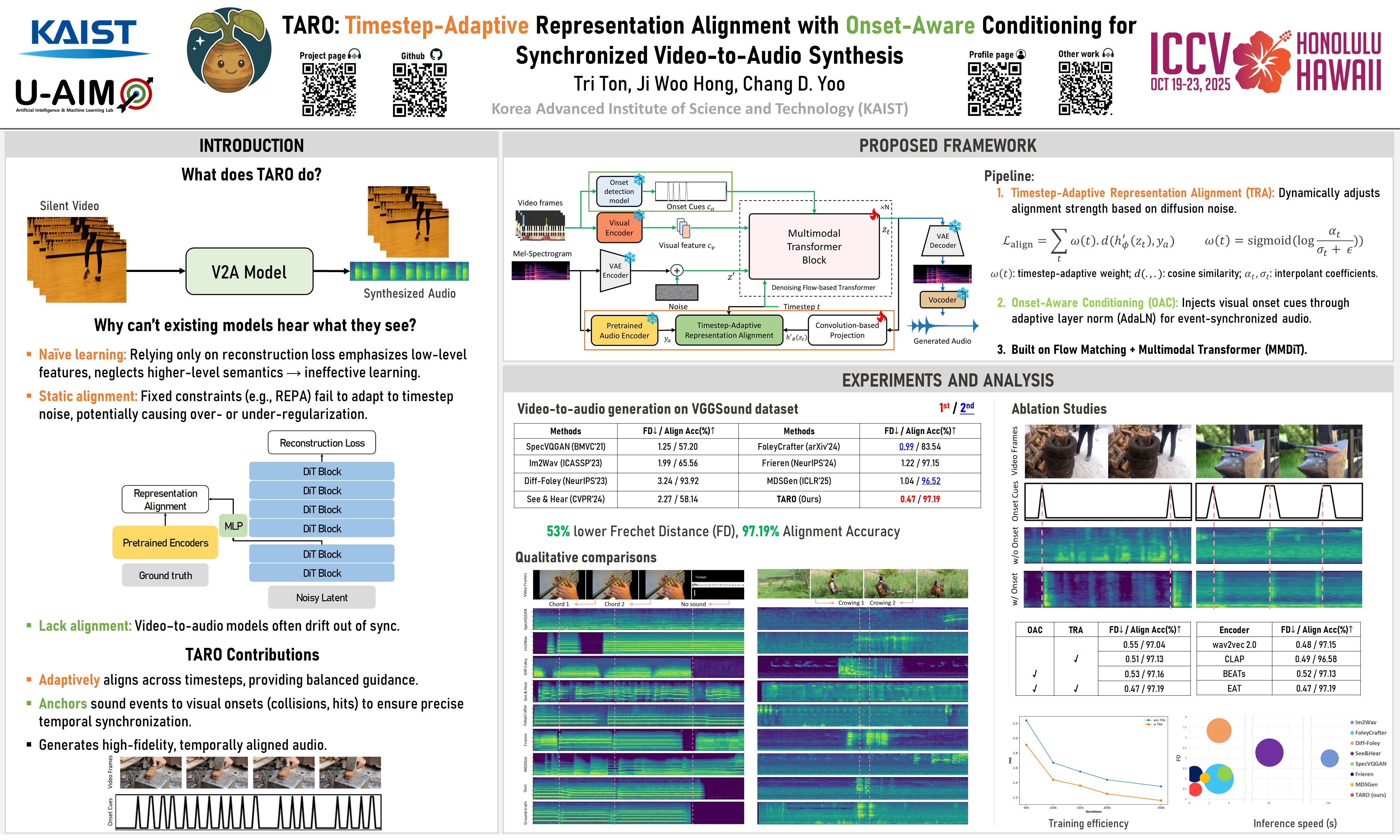 This paper introduces Timestep-Adaptive Representation Alignment with Onset-Aware Conditioning (TARO), a novel framework for high-fidelity and temporally coherent video-to-audio synthesis. Built upon flow-based transformers, which offer stable training and continuous transformations for enhanced synchronization and audio quality, TARO introduces two key innovations: (1) Timestep-Adaptive Representation Alignment (TRA), which dynamically aligns latent representations by adjusting alignment strength based on the noise schedule, ensuring smooth evolution and improved fidelity, and (2) Onset-Aware Conditioning (OAC), which integrates onset cues that serve as sharp event-driven markers of audio-relevant visual moments to enhance synchronization with dynamic visual events. Extensive experiments on the VGGSound and Landscape datasets demonstrate that TARO outperforms prior methods, achieving relatively 53\% lower Frechet Distance (FD), 29\% lower Frechet Audio Distance (FAD), and a 97.19\% Alignment Accuracy, highlighting its superior audio quality and synchronization precision.