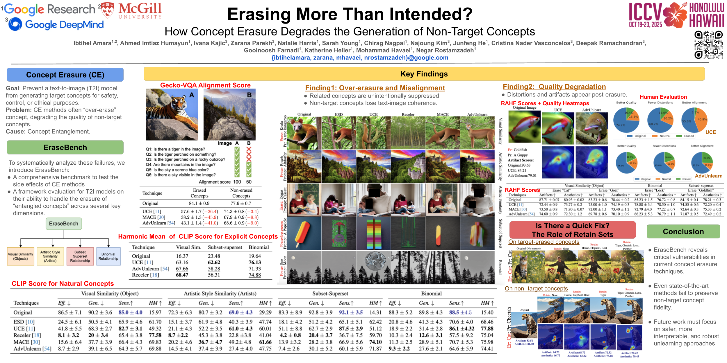 Concept erasure techniques have recently gained significant attention for their potential to remove unwanted concepts from text-to-image models. While these methods often demonstrate promising results in controlled settings, their robustness in real-world applications and suitability for deployment remain uncertain. In this work, we (1) identify a critical gap in evaluating sanitized models, particularly in assessing their performance across diverse concept dimensions, and (2) systematically analyze the failure modes of text-to-image models post-erasure. We focus on the unintended consequences of concept removal on non-target concepts across different levels of interconnected relationships including visually similar, binomial, and semantically related concepts. To enable a more comprehensive evaluation of concept erasure, we introduce EraseBench, a multidimensional framework designed to rigorously assess text-to-image models post-erasure. It encompasses over 100 diverse concepts, carefully curated seeded prompts to ensure reproducible image generation, and dedicated evaluation prompts for model-based assessment. Paired with a robust suite of evaluation metrics, our framework provides a holistic and in-depth analysis of concept erasure’s effectiveness and its long-term impact on model behaviour.Our findings reveal a phenomenon of concept entanglement, where erasure leads to unintended suppression of non-target concepts, causing spillover degradation that manifests as distortions and a decline in generation quality.