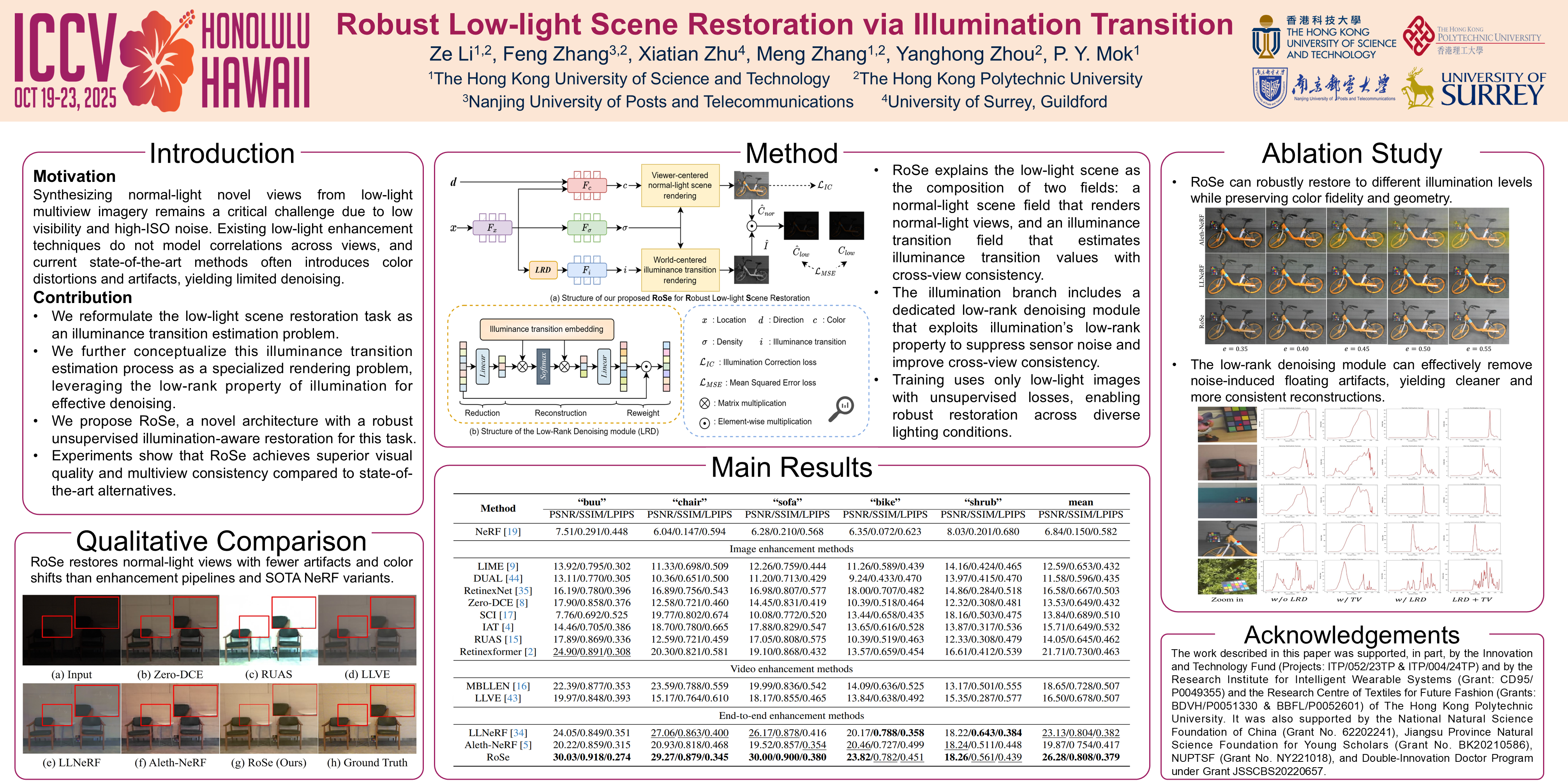 Synthesizing normal-light novel views from low-light multiview images remains a challenging yet practical task due to the low visibility and high ISO noise challenges. Existing low-light enhancement methods often struggle to preprocess these images effectively due to their inability to structurally correlate multiple views. While state-of-the-art approaches have advanced by manipulating illumination-related components during rendering, they often introduce color distortions and artifacts. Moreover, they rely solely on NeRF’s multi-view optimization, which offers limited denoising effectiveness. In this paper, we propose a novel Robust Low-light Scene Restoration framework termed (RoSe), which enables novel-view synthesis under normal lighting from low-light multiview images. Inspired by the 2D Retinex theory, we frame this task as an illuminance transition estimation problem in 3D space, further conceptualizing it as a specialized rendering task. This multiview-consistent illuminance transition field establishes a robust connection between low-light and normal-light conditions. By further exploiting the inherent low-rank property of illumination to constrain the transition representation, we achieve more effective denoising without complex 2D techniques or explicit noise modeling. To this end, we design a concise dual-branch architecture and propose a low-rank denoising module. Experiments demonstrate that RoSe significantly outperforms state-of-the-art models in both rendering quality and multiview consistency on standard benchmarks.