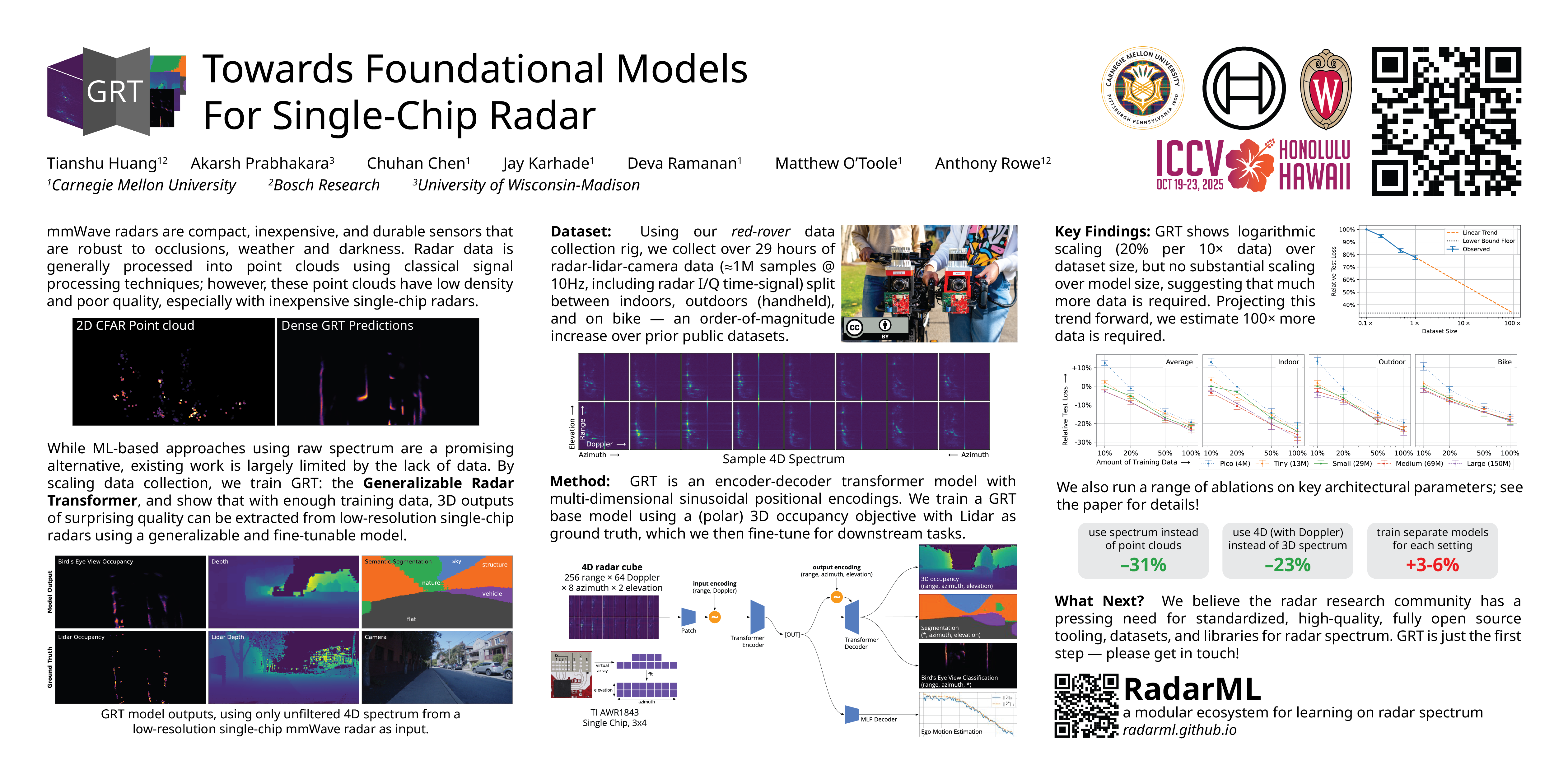 mmWave radars are compact, inexpensive, and durable sensors that are robust to occlusions and work regardless of environmental conditions, such as weather and darkness. However, this comes at the cost of poor angular resolution, especially for inexpensive single-chip radars, which are typically used in automotive and indoor sensing applications. Although many have proposed learning-based methods to mitigate this weakness, no standardized foundational models or large datasets for the mmWave radar have emerged, and practitioners have largely trained task-specific models from scratch using relatively small datasets.In this paper, we collect (to our knowledge) the largest available raw radar dataset with 1M samples (29 hours) and train a foundational model for 4D single-chip radar, which can predict 3D occupancy and semantic segmentation with quality that is typically only possible with much higher resolution sensors. We demonstrate that our Generalizable Radar Transformer (GRT) generalizes across diverse settings, can be fine-tuned for different tasks, and shows logarithmic data scaling of 20\% per $10\times$ data. We also run extensive ablations on common design decisions, and find that using raw radar data significantly outperforms widely-used lossy representations, equivalent to a $10\times$ increase in training data. Finally, we estimate a total data requirement of $\approx$100M samples (3000 hours) to fully exploit the potential of GRT.