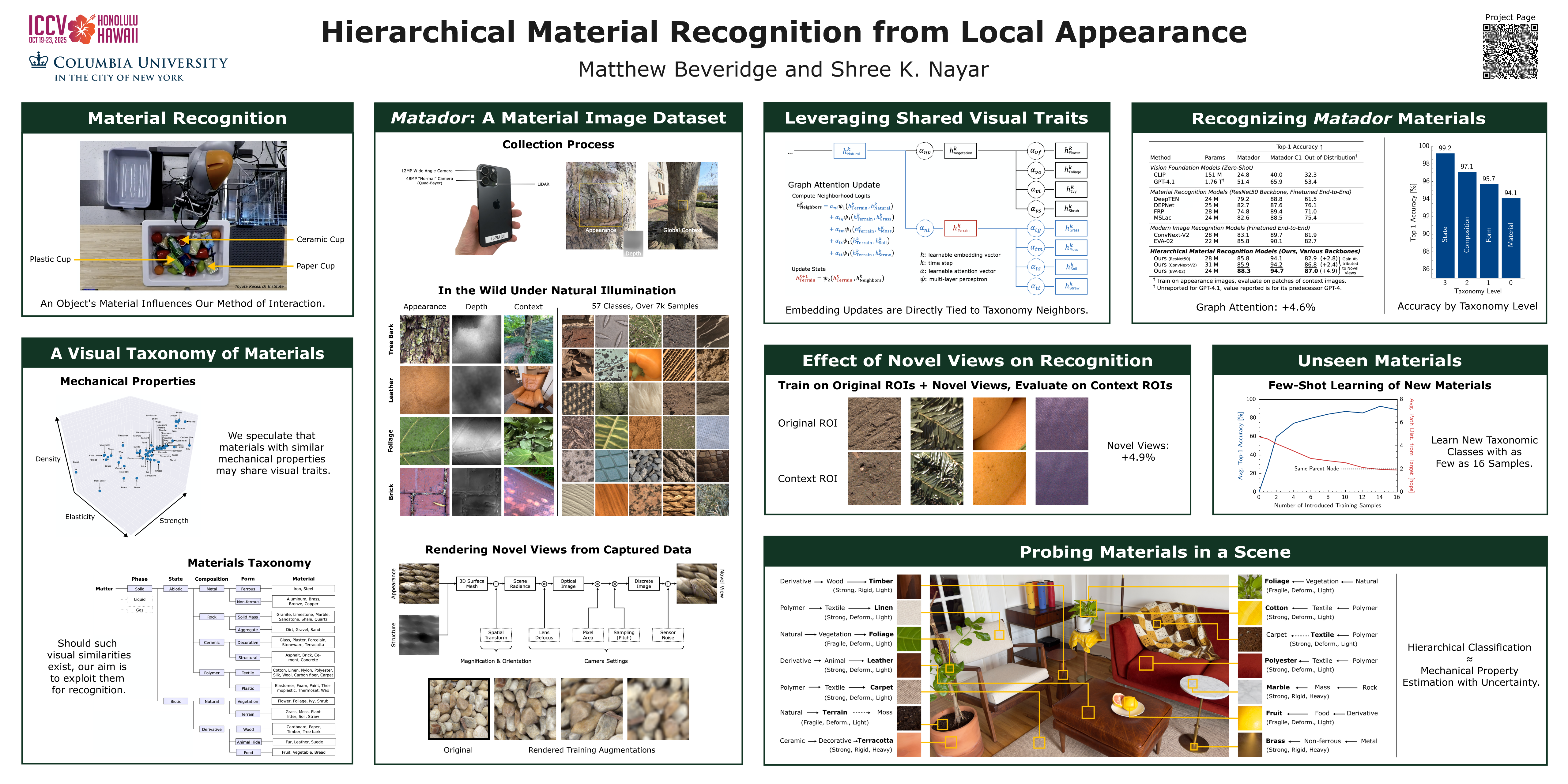 We introduce a taxonomy of solid materials for hierarchical material recognition from local appearance. Our taxonomy is motivated by vision applications, and is arranged according to the physical traits of materials. We contribute a diverse dataset of images and aligned depth maps of materials in the wild. The depth maps can be used to generate novel views to augment the dataset. Utilizing the taxonomy and dataset, we present a learning-based approach to hierarchical material recognition that uses graph neural networks. Our model leverages taxonomic proximity between material classes, and achieves state-of-the-art performance. We show that our model has the potential to generalize in few-shot learning settings. As a result, it achieves coarse classification of underrepresented materials.