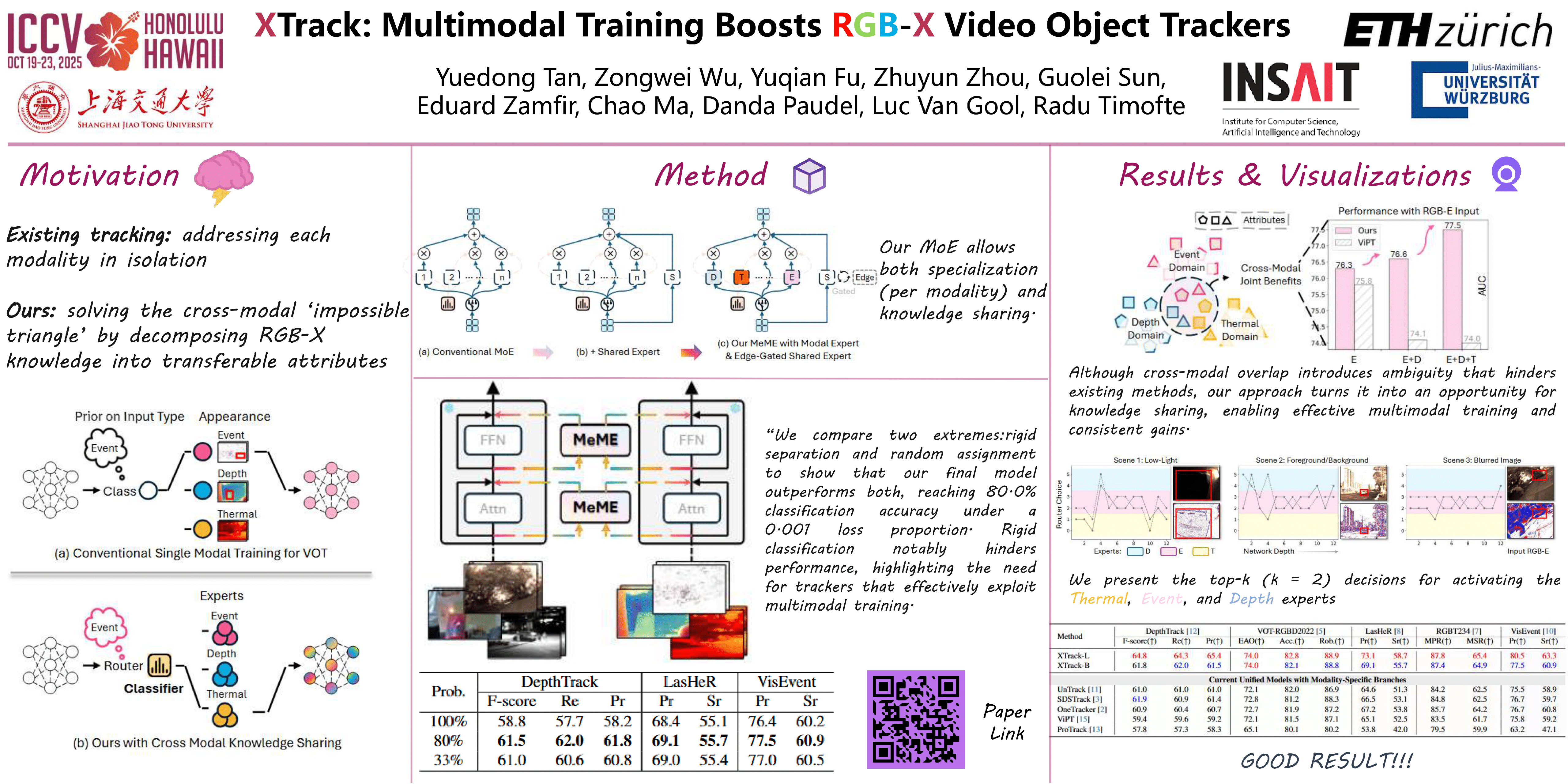 Multimodal sensing has proven valuable for visual tracking, as different sensor types offer unique strengths in handling one specific challenging scene where object appearance varies. While a generalist model capable of leveraging all modalities would be ideal, development is hindered by data sparsity, typically in practice, only one modality is available at a time. Therefore, it is crucial to ensure and achieve that knowledge gained from multimodal sensing -- such as identifying relevant features and regions -- is effectively shared, even when certain modalities are unavailable at inference. We venture with a simple assumption: similar samples across different modalities have more knowledge to share than otherwise. To implement this, we employ a classifier with weak loss tasked with distinguishing between modalities. More specifically, if the classifier "fails" to accurately identify the modality of the given sample, this signals an opportunity for cross-modal knowledge sharing. Intuitively, knowledge transfer is facilitated whenever a sample from one modality is sufficiently close and aligned with another. Technically, we achieve this by routing samples from one modality to the expert of the others, within a mixture-of-experts framework designed for multimodal video object tracking. During the inference, the expert of the respective modality is chosen, which we show to benefit from the multimodal knowledge available during training, thanks to the proposed method. Through the exhaustive experiments that use only paired RGB-E, RGB-D, and RGB-T during training, we showcase the benefit of the proposed method for RGB-X tracker during inference, with an average +3\% precision improvement over the current SOTA. Our source code will be released.