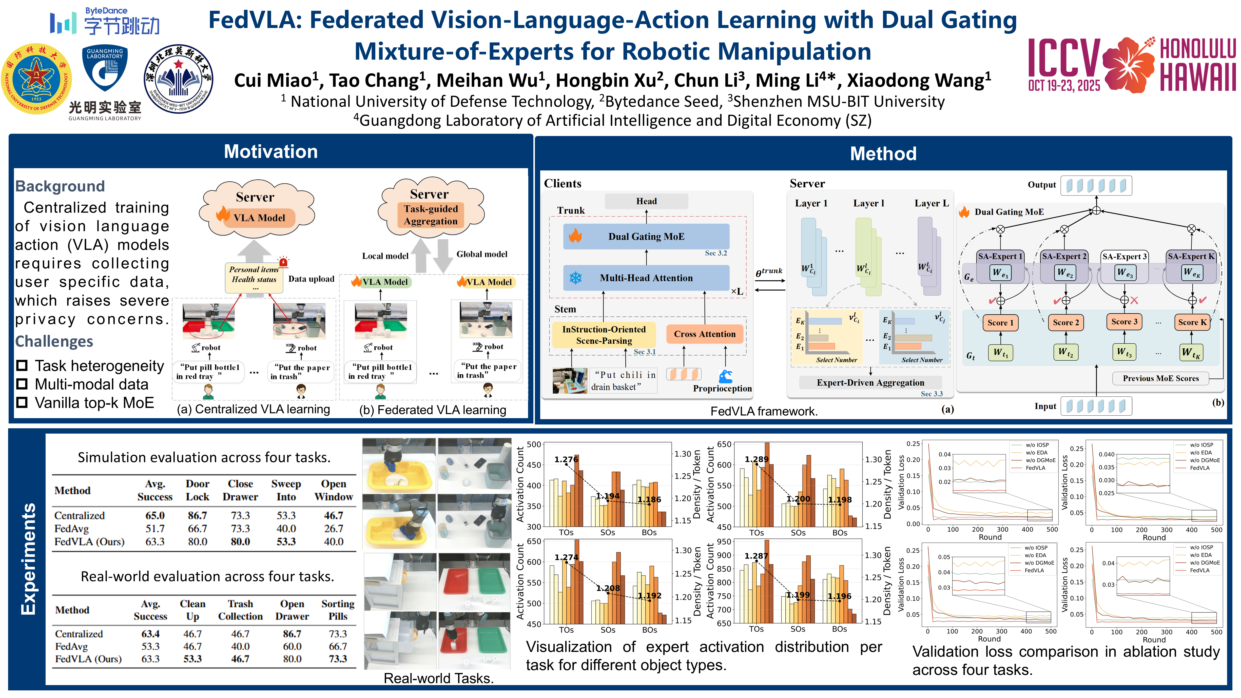 Vision-Language-Action (VLA) models have significantly advanced robotic manipulation by enabling robots to interpret language instructions for task execution. However, training these models often relies on large-scale user-specific data, raising concerns about privacy and security, which in turn limits their broader adoption. To address this, we propose \name{}, the first federated VLA learning framework, enabling distributed model training that preserves data privacy without compromising performance. Our framework integrates task-aware representation learning, adaptive expert selection, and expert-driven federated aggregation, enabling efficient and privacy-preserving training of VLA models. Specifically, we introduce an Instruction-Oriented Scene-Parsing mechanism, which decomposes and enhances object-level features based on task instructions, improving contextual understanding. To effectively learn diverse task patterns, we design a Dual Gating Mixture-of-Experts (DGMoE) mechanism, where not only input tokens but also self-aware experts adaptively decide their activation. Finally, we propose an Expert-Driven Aggregation strategy at the federated server, where model aggregation is guided by activated experts, ensuring effective cross-client knowledge transfer. Extensive simulations and real-world robotic experiments demonstrate the effectiveness of our proposals. Notably, DGMoE significantly improves computational efficiency compared to its vanilla counterpart, while FedVLA achieves task success rates comparable to centralized training, effectively preserving data privacy.