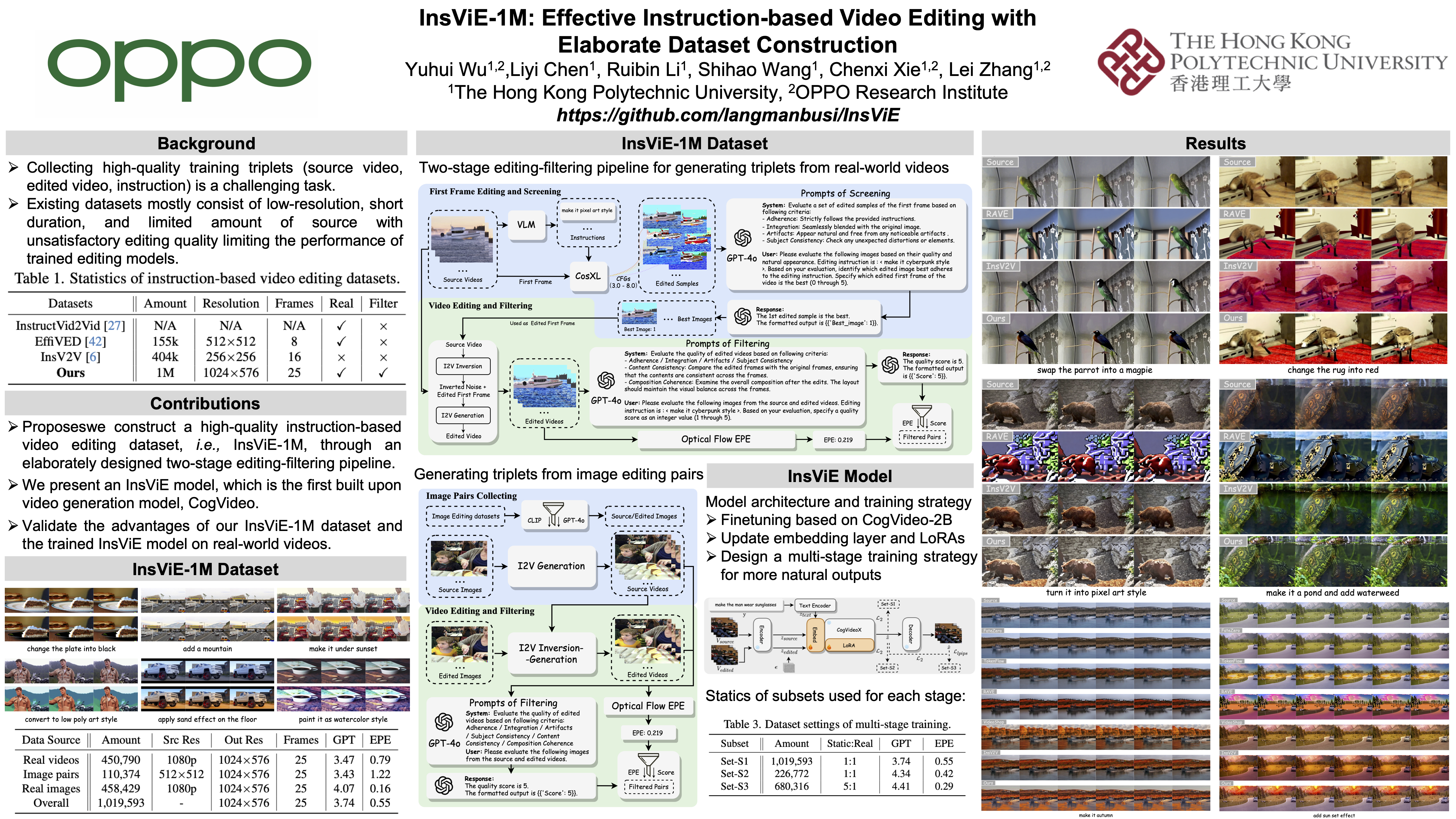 Instruction-based video editing allows effective and interactive editing of videos using only instructions without extra inputs such as masks or attributes. However, collecting high-quality training triplets (source video, edited video, instruction) is a challenging task. Existing datasets mostly consist of low-resolution, short duration, and limited amount of source videos with unsatisfactory editing quality, limiting the performance of trained editing models. In this work, we present a high-quality \textbf{Ins}truction-based \textbf{Vi}deo \textbf{E}diting dataset with \textbf{1M} triplets, namely \textbf{InsViE-1M}. We first curate high-resolution and high-quality source videos and images, then design an effective editing-filtering pipeline to construct high-quality editing triplets for model training. For a source video, we generate multiple edited samples of its first frame with different intensities of classifier-free guidance, which are automatically filtered by GPT-4o with carefully crafted guidelines. The edited first frame is propagated to subsequent frames to produce the edited video, followed by another round of filtering for frame quality and motion evaluation. We also generate and filter a variety of video editing triplets from high-quality images. With the InsViE-1M dataset, we propose a multi-stage learning strategy to train our InsViE model, progressively enhancing its instruction following and editing ability. Extensive experiments demonstrate the advantages of our InsViE-1M dataset and the trained model over state-of-the-art works. Data and code will be released.