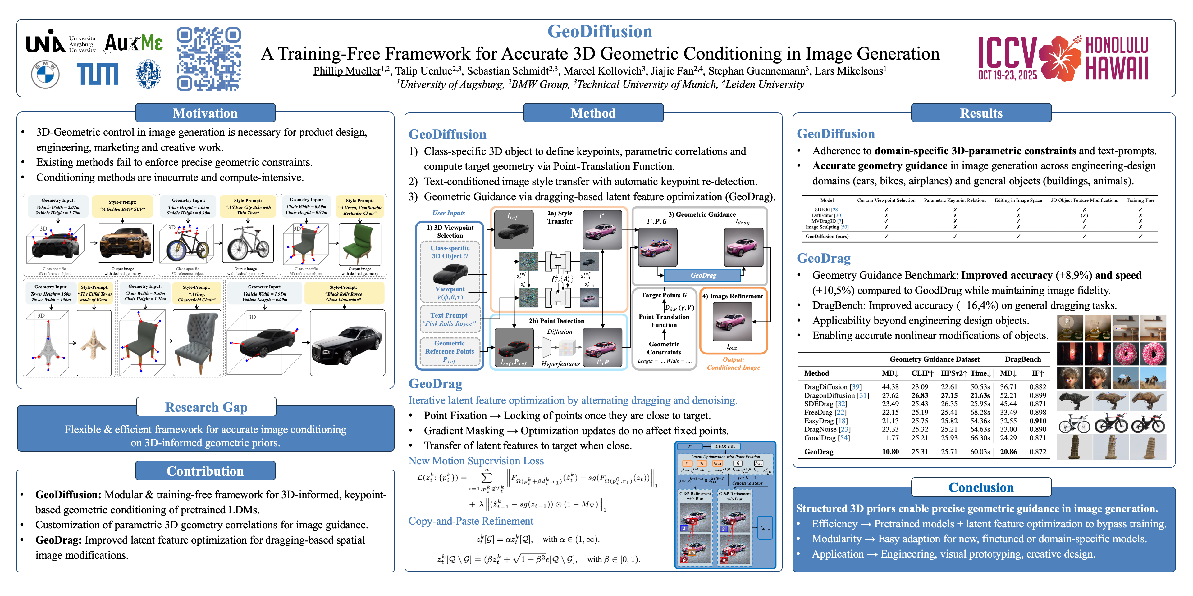 Precise geometric control in image generation is essential for fields like engineering \& product design and creative industries to control 3D object features accurately in 2D image space. Traditional 3D editing approaches are time-consuming and demand specialized skills, while current image-based generative methods lack accuracy in geometric conditioning. To address these challenges, we propose GeoDiffusion, a training-free framework for accurate and efficient geometric conditioning of 3D features in image generation. GeoDiffusion employs a class-specific 3D object as a geometric prior to define keypoints and parametric correlations in 3D space. We ensure viewpoint consistency through a rendered image of a reference 3D object, followed by style transfer to meet user-defined appearance specifications. At the core of our framework is GeoDrag, improving accuracy and speed of drag-based image editing on geometry guidance tasks and general instructions on DragBench. Our results demonstrate that GeoDiffusion enables precise geometric modifications across various iterative design workflows.