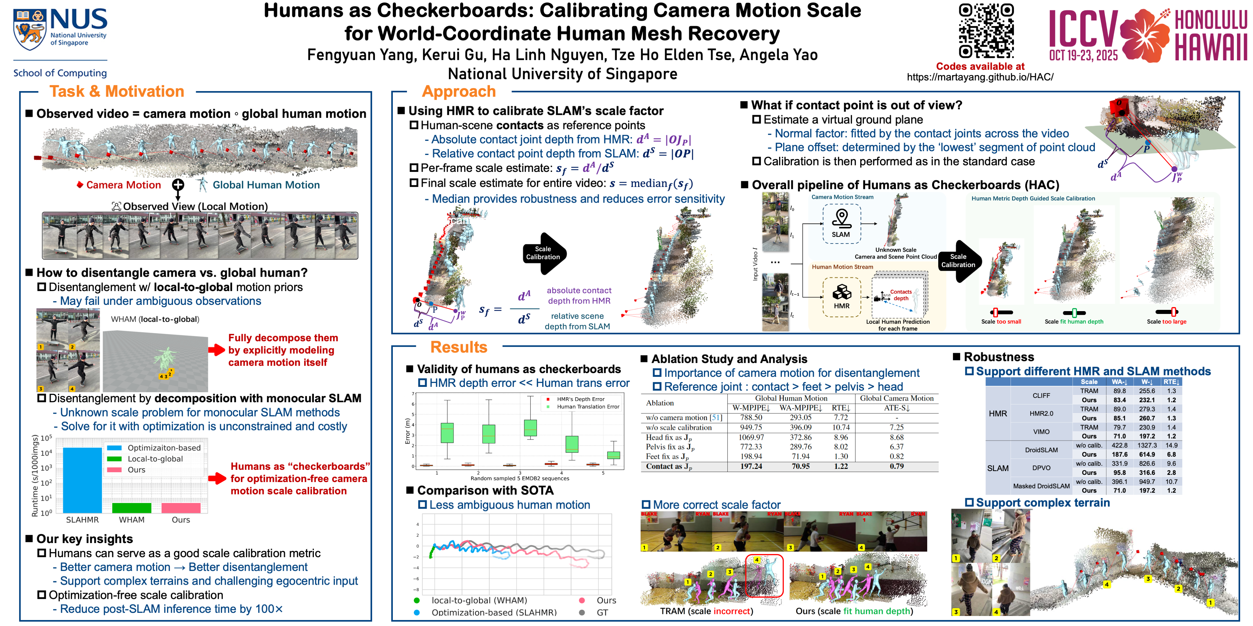 Accurate camera motion estimation is essential for recovering global human motion in world coordinates from RGB video inputs. While SLAM is widely used for estimating camera trajectory and point cloud, monocular SLAM does so only up to an unknown scale factor. Previous works estimate the scale factor through optimization, but this is unreliable and time-consuming. This paper presents an optimization-free scale calibration framework, Human as Checkerboard (HAC). HAC explicitly leverages the human body predicted by human mesh recovery model as a calibration reference. Specifically, it innovatively uses the absolute depth of human-scene contact joints as references to calibrate the corresponding relative scene depth from SLAM. HAC benefits from geometric priors encoded in human mesh recovery models to estimate the SLAM scale and achieves precise global human motion estimation. Simple yet powerful, our method sets a new state-of-the-art performance for global human mesh estimation tasks. It reduces motion errors by 50\% over prior local-to-global methods while using 100$\times$ less post-SLAM inference time than optimization-based methods. Our code will be made public.