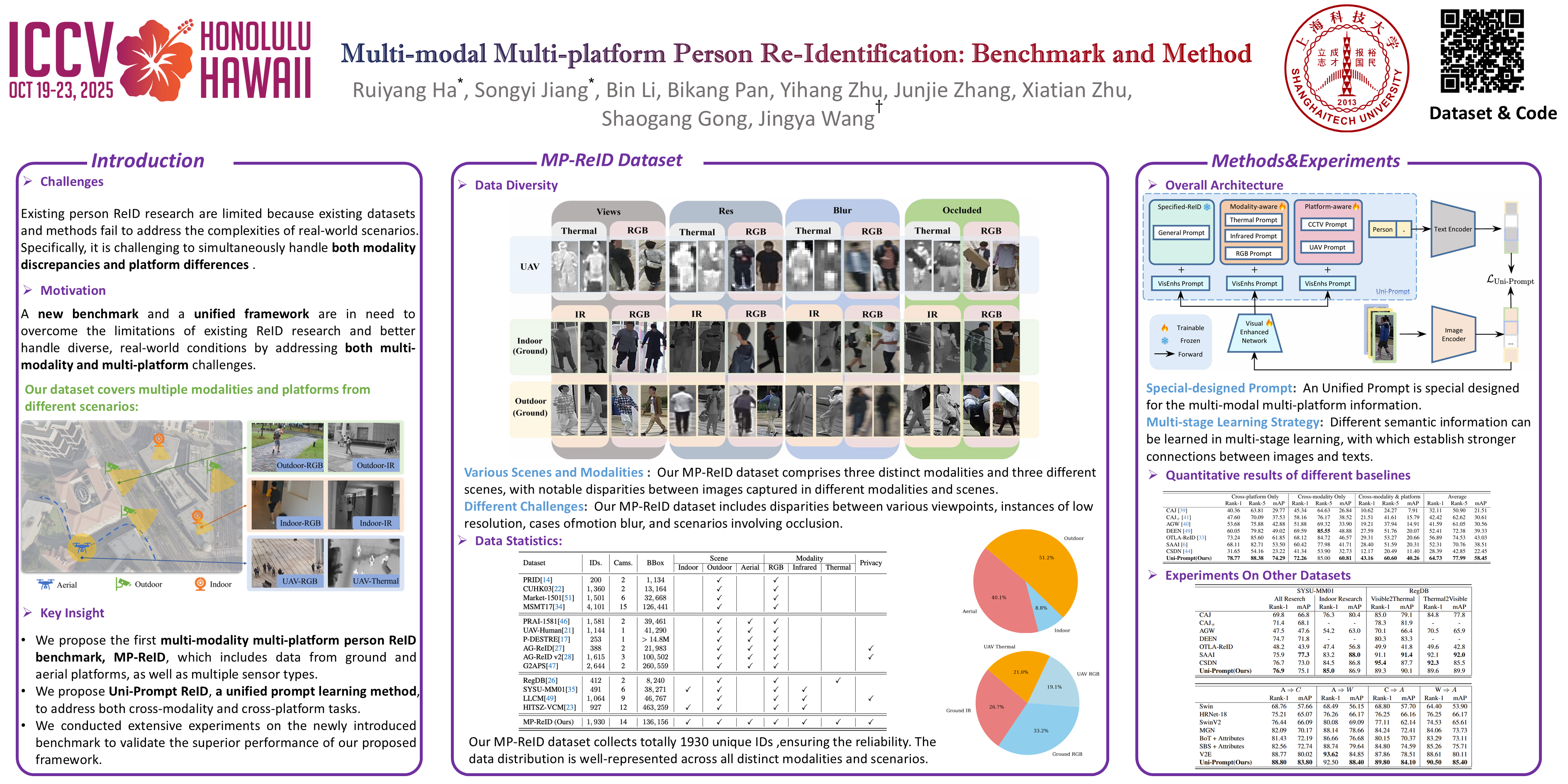 Conventional person re-identification (ReID) research is often limited to single-modality sensor data from static cameras, which fails to address the complexities of real-world scenarios where multi-modal signals are increasingly prevalent. For instance, consider an urban ReID system integrating stationary RGB cameras, nighttime infrared sensors, and UAVs equipped with dynamic tracking capabilities. Such systems face significant challenges due to variations in camera perspectives, lighting conditions, and sensor modalities, hindering effective person ReID.To address these challenges, we introduce the MP-ReID benchmark, a novel dataset designed specifically for multi-modality and multi-platform ReID. This benchmark uniquely compiles data from 1,930 identities across diverse modalities, including RGB, infrared, and thermal imaging, captured by both UAVs and ground-based cameras in indoor and outdoor environments.Building on this benchmark, we introduce Uni-Prompt ReID, a framework with specific-designed prompts, tailored for cross-modality and cross-platform scenarios. Our method consistently outperforms state-of-the-art approaches, establishing a robust foundation for future research in complex and dynamic ReID environments. Additionally, our dataset will be made publicly available to support further advancements.