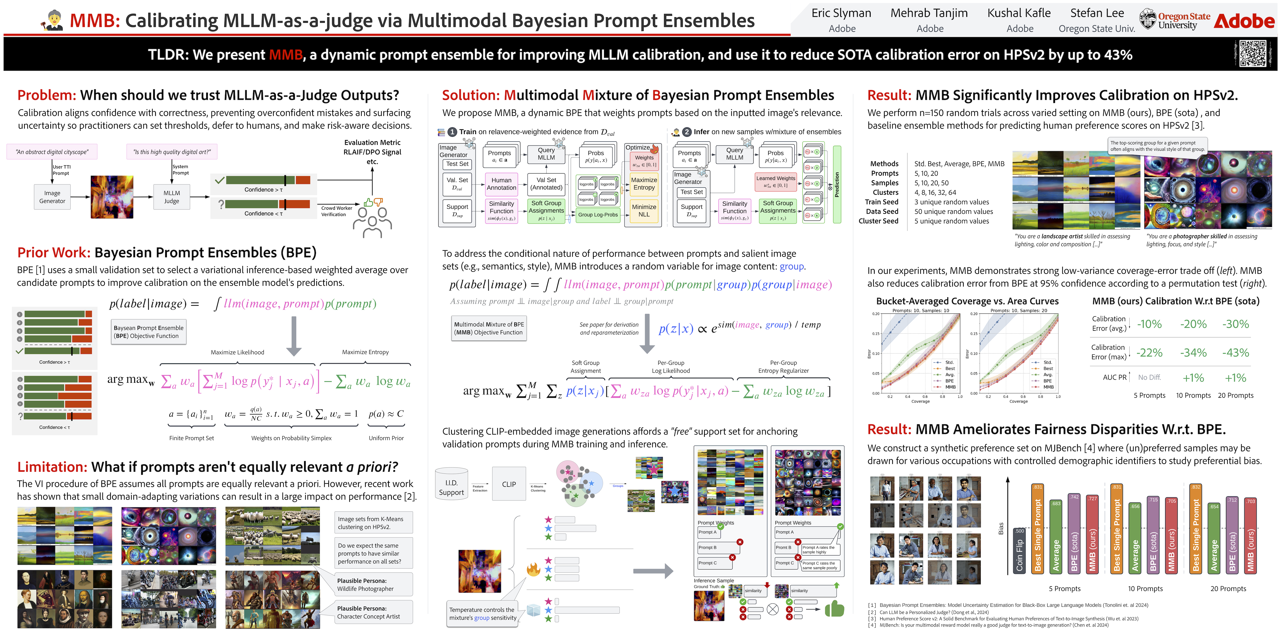 Multimodal large language models (MLLMs) are increasingly used to evaluate text-to-image (TTI) generation systems, providing automated judgments based on visual and textual context. However, these "judge" models often suffer from biases, overconfidence, and inconsistent performance across diverse image domains. While prompt ensembling has shown promise for mitigating these issues in unimodal, text-only settings, our experiments reveal that standard ensembling methods fail to generalize effectively for TTI tasks. To address these limitations, we propose a new multimodal-aware method called Multimodal Mixture-of-Bayesian Prompt Ensembles (MMB). Our approach uses a Bayesian prompt ensemble approach augmented by image clustering, allowing the judge to dynamically assign prompt weights based on the visual characteristics of each sample. We show that MMB improves accuracy in pairwise preference judgments and greatly enhances calibration, making it easier to gauge the judge’s true uncertainty. In evaluations on two TTI benchmarks, HPSv2 and MJBench, MMB outperforms existing baselines in alignment with human annotations and calibration across varied image content. Our findings highlight the importance of multimodal-specific strategies for judge calibration and suggest a promising path forward for reliable large-scale TTI evaluation.