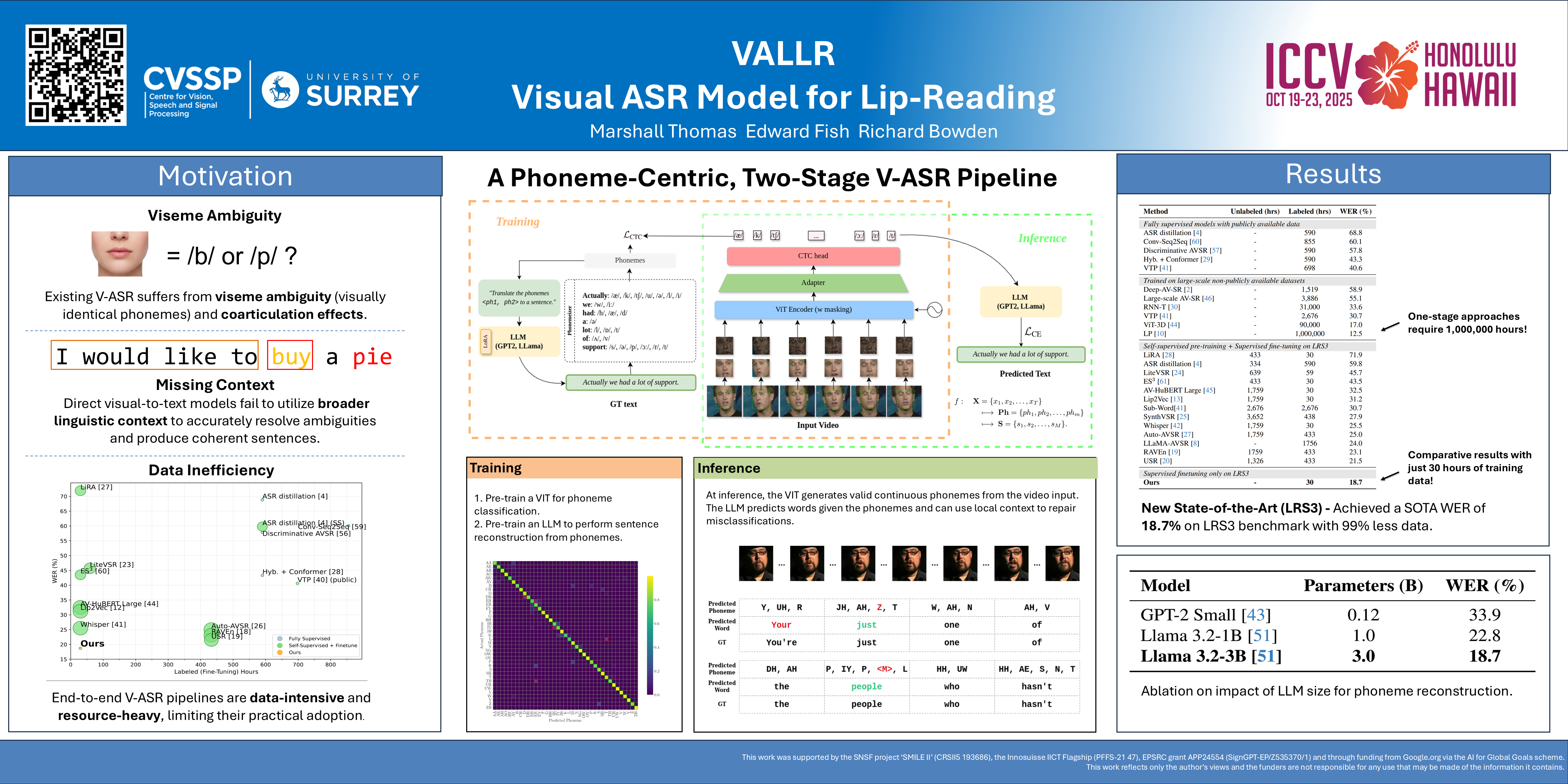 Lip Reading, or Visual Automatic Speech Recognition (V-ASR), is a complex task requiring the interpretation of spoken language exclusively from visual cues, primarily lip movements and facial expressions. This task is especially challenging due to the absence of auditory information and the inherent ambiguity when visually distinguishing phonemes that have overlapping visemes—where different phonemes appear identical on the lips. Current methods typically attempt to predict words or characters directly from these visual cues, but this approach frequently encounters high error rates due to coarticulation effects and viseme ambiguity. We propose a novel two-stage, phoneme-centric framework for Visual Automatic Speech Recognition (V-ASR) that addresses these longstanding challenges. First, our model predicts a compact sequence of phonemes from visual inputs using a Video Transformer with a CTC head, thereby reducing the task complexity and achieving robust speaker invariance. This phoneme output then serves as the input to a fine-tuned Large Language Model (LLM), which reconstructs coherent words and sentences by leveraging broader linguistic context. Unlike existing methods that either predict words directly—often faltering on visually similar phonemes—or rely on large-scale multimodal pre-training, our approach explicitly encodes intermediate linguistic structure while remaining highly data efficient. We demonstrate state-of-the-art performance on two challenging datasets, LRS2 and LRS3, where our method achieves significant reductions in Word Error Rate (WER) achieving a SOTA WER of 18.7 on LRS3 despite using 99.4% less labelled data than the next best approach. Code will be released following the review process.