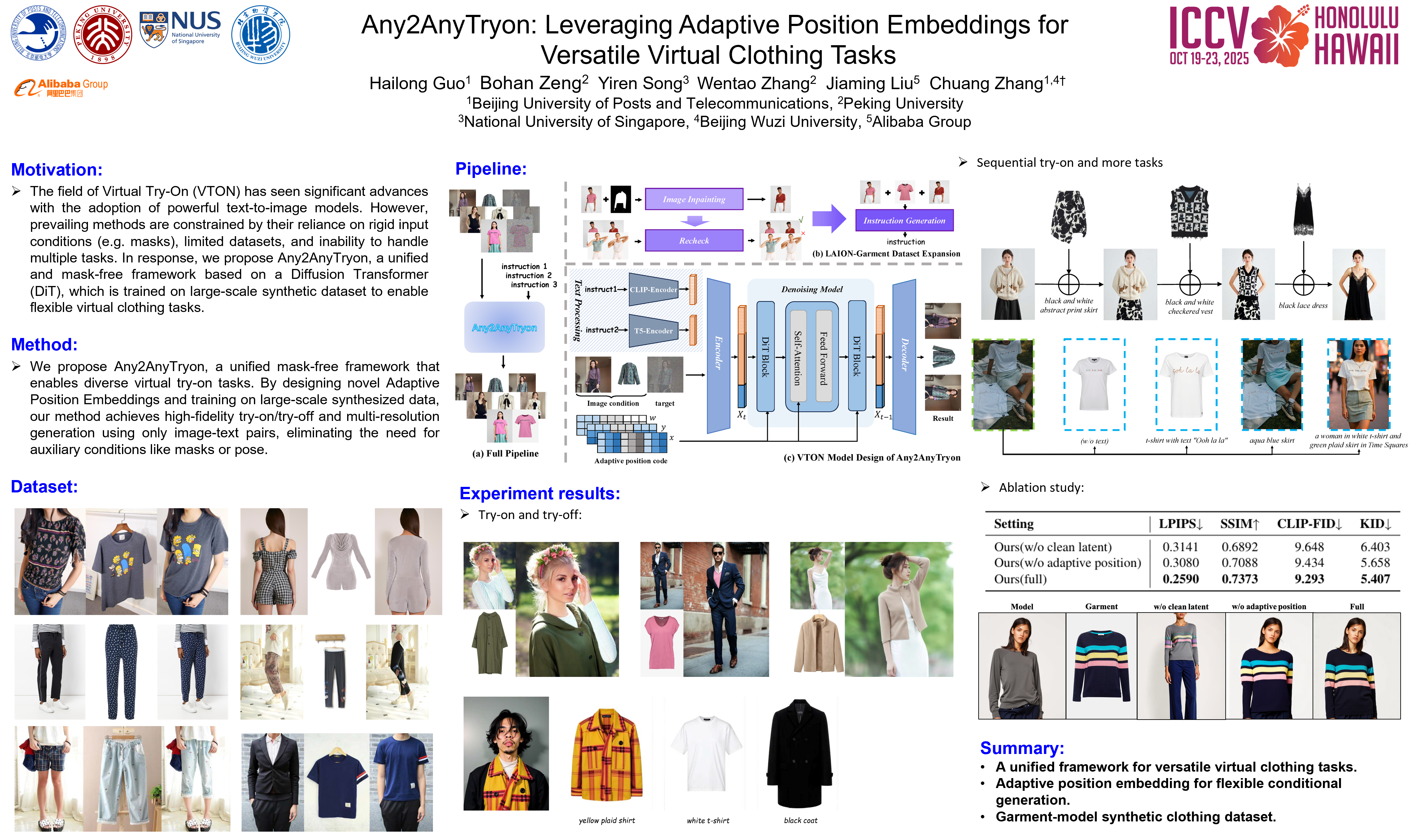 Image-based virtual try-on (VTON) aims to generate a virtual try-on result by transferring an input garment onto a target person’s image. However, the scarcity of paired garment-model data makes it challenging for existing methods to achieve high generalization and quality in VTON. Also, it limits the ability to generate mask-free try-ons. To tackle the data scarcity problem, approaches such as Stable Garment and MMTryon use a synthetic data strategy, effectively increasing the amount of paired data on the model side. However, existing methods are typically limited to performing specific try-on tasks and lack user-friendliness. To enhance the generalization and controllability of VTON generation, we propose Any2AnyTryon, which can generate try-on results based on different textual instructions and model garment images to meet various needs, eliminating the reliance on masks, poses, or other conditions. Specifically, we first construct the virtual try-on dataset LAION-Garment, the largest known open-source garment try-on dataset. Then, we introduce adaptive position embedding, which enables the model to generate satisfactory outfitted model images or garment images based on input images of different sizes and categories, significantly enhancing the generalization and controllability of VTON generation. In our experiments, we demonstrate the effectiveness of our Any2AnyTryon and compare it with existing methods. The results show that Any2AnyTryon enables flexible, controllable, and high-quality image-based virtual try-on generation.