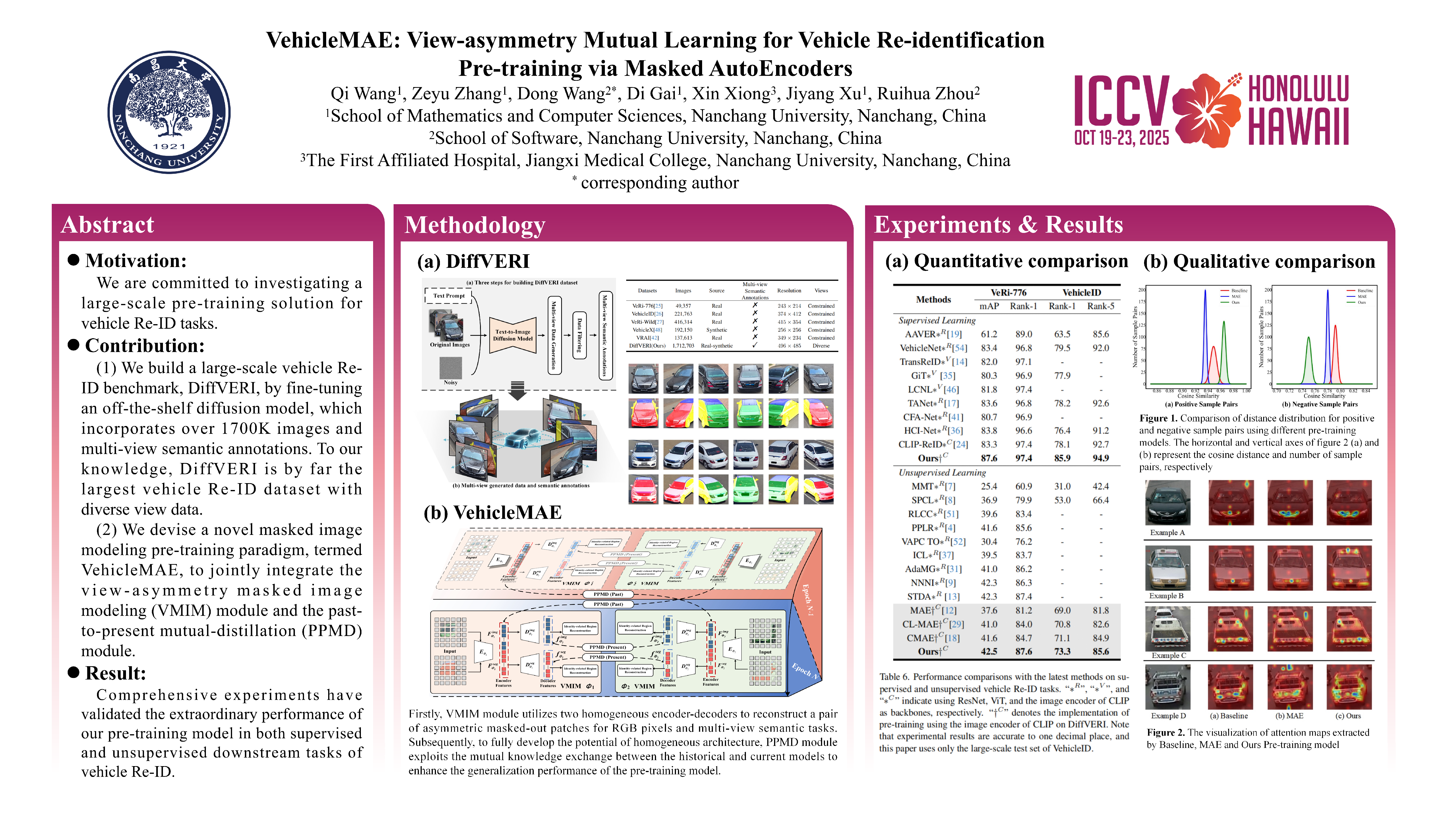 Large-scale pre-training technology has achieved remarkable performance in diversified object re-identification (Re-ID) downstream tasks. Nevertheless, to our best knowledge, the pre-training model specifically for vehicle Re-ID, which focuses on tackling the challenge of multi-view variations, has not been fully investigated. In this paper, we first leverage a diffusion model to build a large-scale vehicle Re-ID benchmark dataset, dubbed “DiffVERI”, containing over 1700K images from abundant multi-view annotations. In terms of this dataset, we further present VehicleMAE, a novel masked image modeling pre-training paradigm that learns view-invariant representations by performing mutual-distillation in a self-supervised manner. To be specific, the pipeline of VehicleMAE unfolds two core modules, i.e., view-asymmetry masked image modeling (VMIM) and past-to-present mutual-distillation (PPMD). Technically, VMIM consists of two homogeneous masked autoencoders (MAE) that simultaneously reconstruct the RGB pixels and multi-view semantic information of the specific vehicle body region via paired asymmetric mask sampling strategies. To progressively distill the knowledge of the model itself, PPMD considers the two MAEs in the current epoch and the previous one as the student models and the teacher models, respectively, which leverages the knowledge learned by the current student and the historical teacher for mutual feature-level distillation. Extensive experimental results have verified that the proposed pre-training paradigm on DiffVERI gains compelling downstream task performance for vehicle Re-ID.