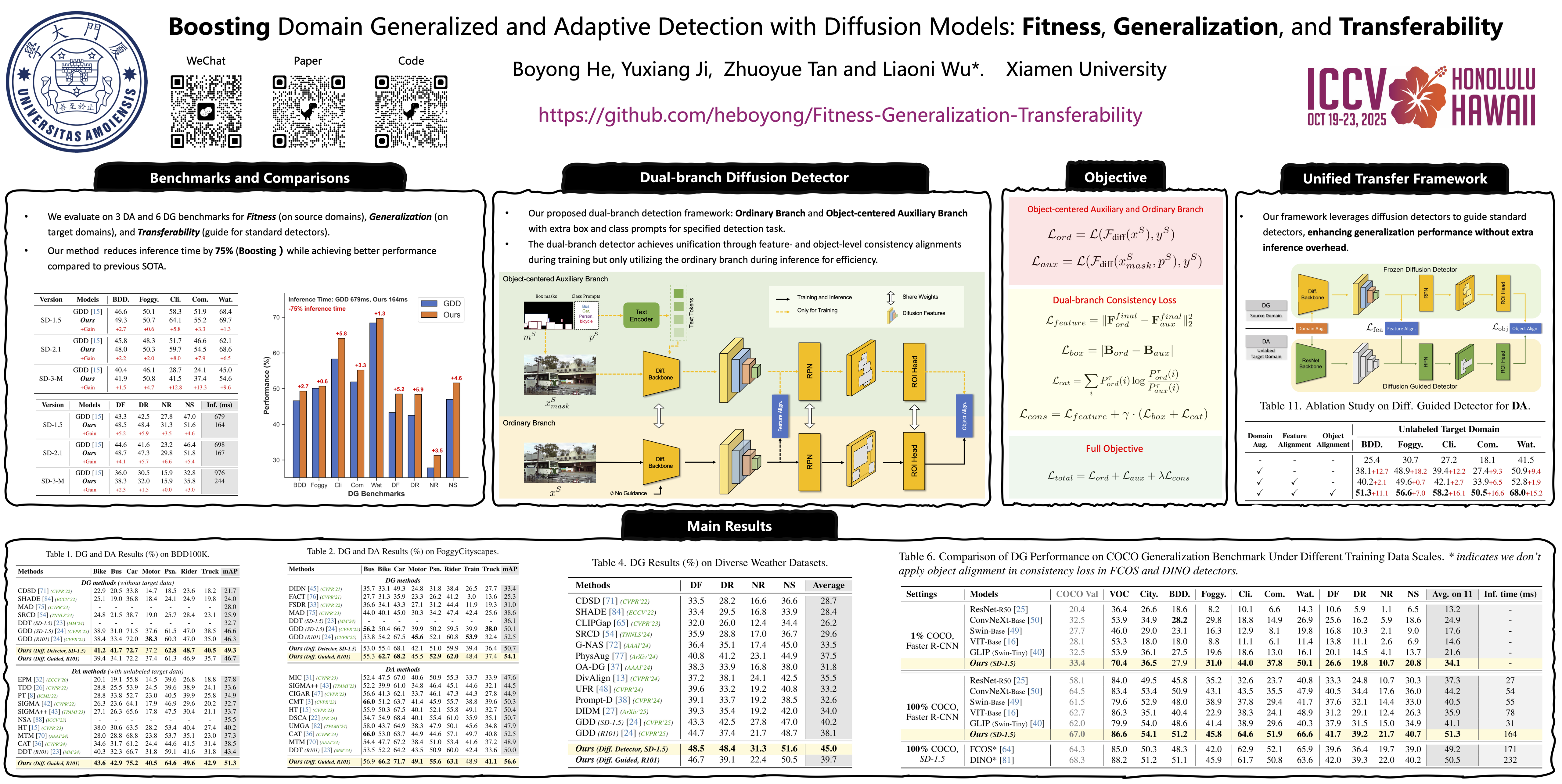 Detectors often suffer from performance drop due to domain gap between training and testing data. Recent methods explore diffusion models applied to domain generalization (DG) and adaptation (DA) tasks, but still struggle with large inference costs and have not yet fully leveraged the capabilities of diffusion models. We propose to tackle these problems by extracting intermediate features from a single-step diffusion process, improving feature collection and fusion to reduce inference time by 75% while enhancing performance on source domains (i.e., Fitness). Then, we construct an object-centered auxiliary branch by applying box-masked images with class prompts to extract robust and domain-invariant features that focus on object. We also apply consistency loss to align the auxiliary and ordinary branch, balancing fitness and generalization while preventing overfitting and improving performance on target domains (i.e., Generalization). Furthermore, within a unified framework, standard detectors are guided by diffusion detectors through feature-level and object-level alignment on source domains (for DG) and unlabeled target domains (for DA), thereby improving cross-domain detection performance (i.e., Transferability). Our method achieves competitive results on 3 DA benchmarks and 5 DG benchmarks. Additionally, experiments on COCO generalization benchmark demonstrate that our method maintains significant advantages and show remarkable efficiency in large domain shifts and low-data scenarios. Our work shows the superiority of applying diffusion models to domain generalized and adaptive detection tasks and offers valuable insights for visual perception tasks across diverse domains.