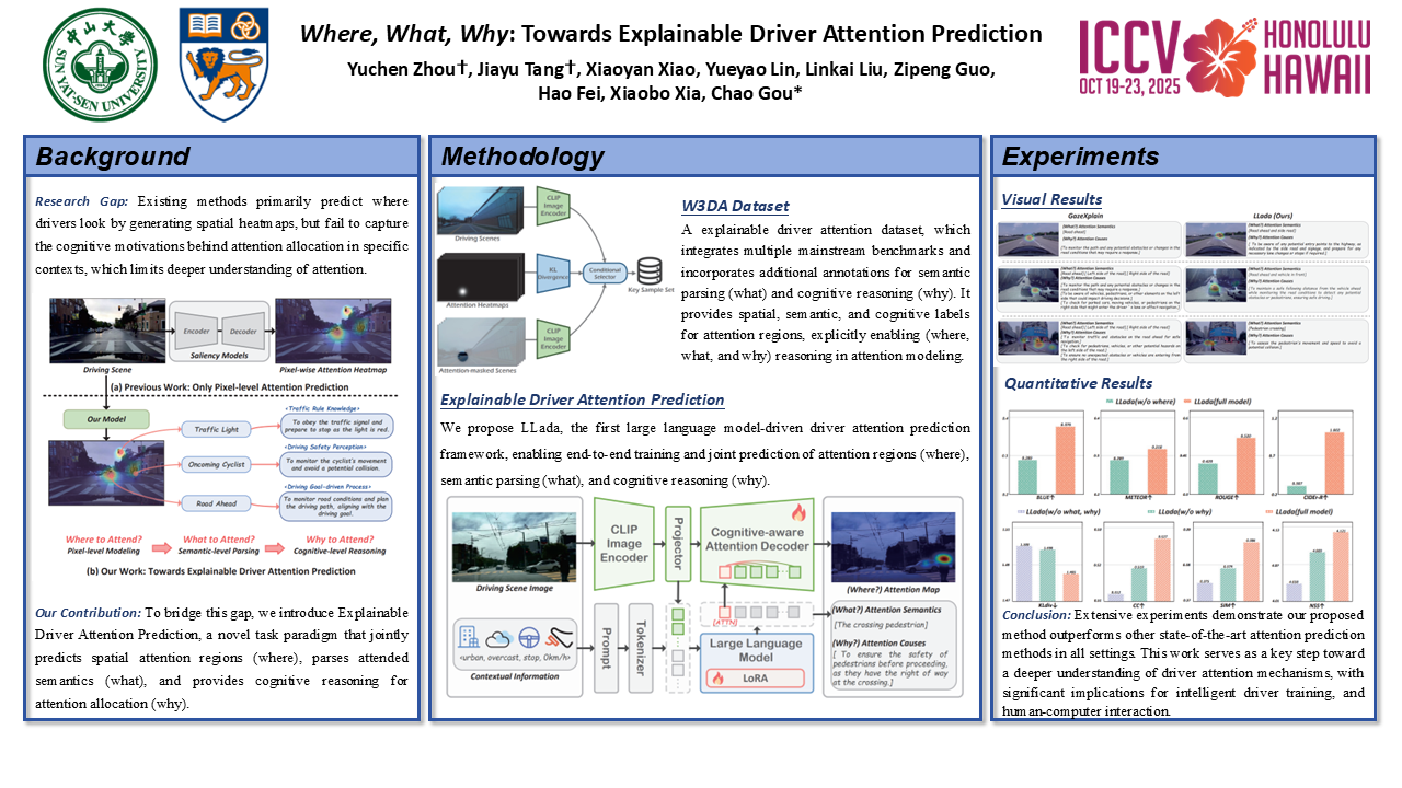 Modeling task-driven attention in driving is a fundamental challenge for both autonomous vehicles and cognitive science. Existing methods primarily predict where drivers look by generating spatial heatmaps, but fail to capture the cognitive motivations behind attention allocation in specific contexts, which limits deeper understanding of attention mechanisms. To bridge this gap, we introduce Explainable Driver Attention Prediction, a novel task paradigm that jointly predicts spatial attention regions (where), parses attended semantics (what), and provides cognitive reasoning for attention allocation (why). To support this, we present W³DA, the first large-scale explainable driver attention dataset. It enriches existing benchmarks with detailed semantic and causal annotations across diverse driving scenarios, including normal conditions, safety-critical situations, and traffic accidents. We further propose LLada, a Large Language model-driven framework for driver attention prediction, which unifies pixel modeling, semantic parsing, and cognitive reasoning within an end-to-end architecture. Extensive experiments demonstrate the effectiveness of LLada, exhibiting robust generalization across datasets and driving conditions. This work serves as a key step toward a deeper understanding of driver attention mechanisms, with significant implications for autonomous driving, intelligent driver training, and human-computer interaction. The dataset, code, and models will be released.