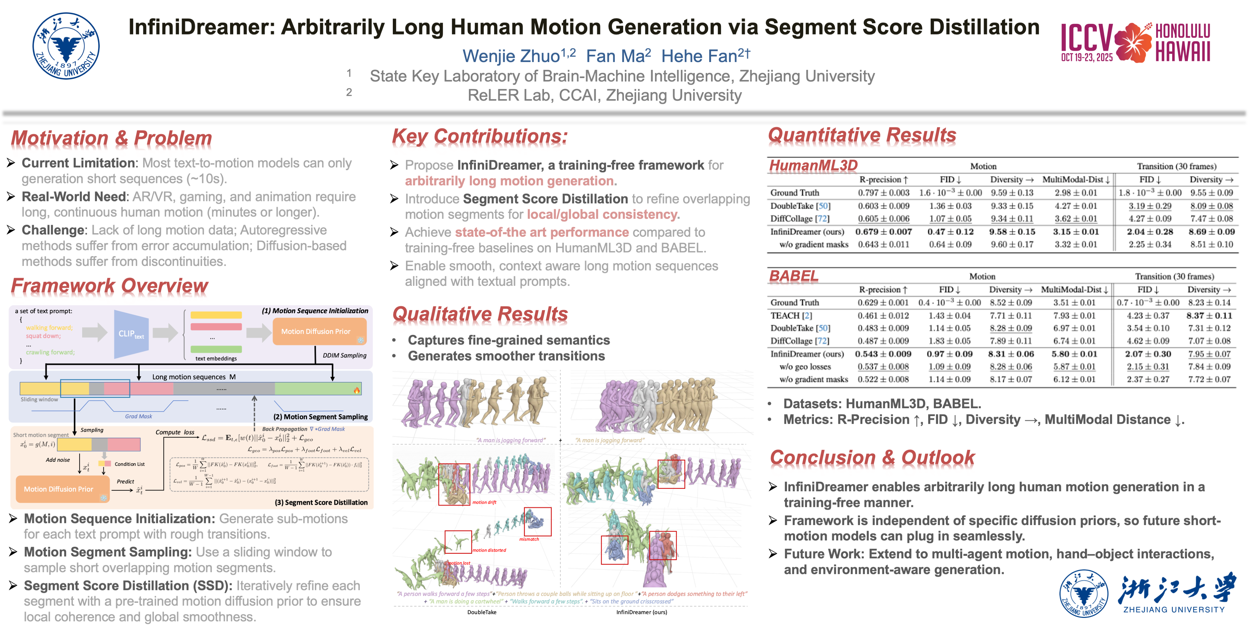 We introduce InfiniDreamer, a novel framework for arbitrarily long human motion generation. Existing motion generation methods are often constrained to short sequences due to the lack of long motion training data. To overcome this, InfiniDreamer first generates sub-motions corresponding to each textual description and assembles them into a coarse long sequence using randomly initialized transition segments. To refine the entire motion, we propose Segment Score Distillation (SSD)—an optimization-based method that leverages a motion prior trained solely on short clips, enabling long-sequence generation without additional training. Specifically, SSD iteratively refines overlapping short segments sampled from the coarsely extended long motion sequence, progressively aligning them with the pre-trained motion diffusion prior. This process ensures local coherence within each segment, while the refined transitions between segments maintain global consistency across the entire sequence. Extensive qualitative and quantitative experiments validate the superiority of our framework, showcasing its ability to generate coherent, contextually aware motion sequences of arbitrary length.
