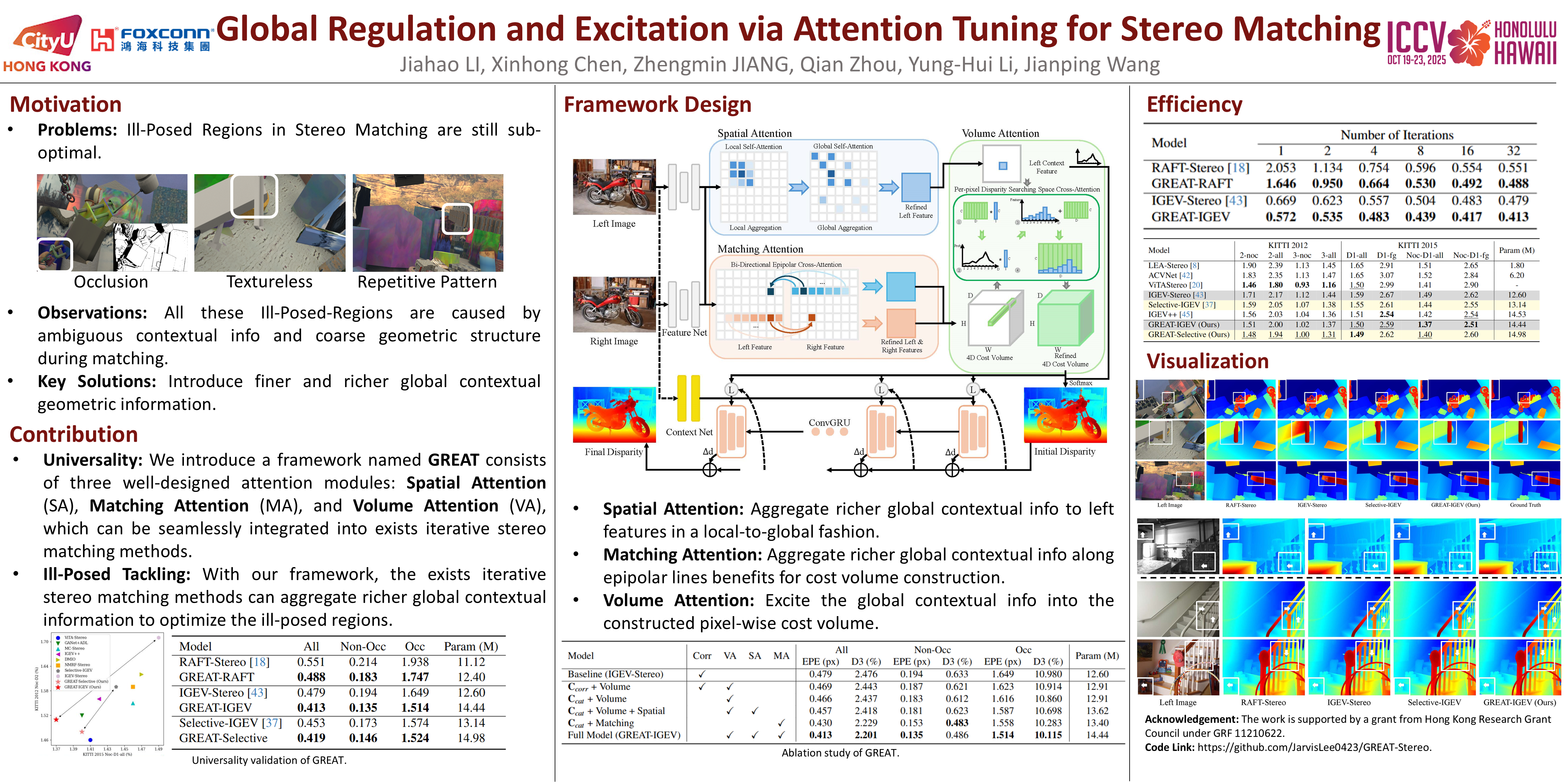 Stereo matching achieves significant progress with iterative algorithms like RAFT-Stereo and IGEV-Stereo. However, these methods struggle in ill-posed regions with occlusions, textureless, or repetitive patterns, due to lacking global context and geometric information for effective iterative refinement. To enable the existing iterative approaches to incorporate global context, we propose the Global Regulation and Excitation via Attention Tuning (GREAT) framework which encompasses three attention modules. Specifically, Spatial Attention (SA) captures the global context within the spatial dimension, Matching Attention (MA) extracts global context along epipolar lines, and Volume Attention (VA) works in conjunction with SA and MA to construct a more robust cost-volume excited by global context and geometric details. To verify the universality and effectiveness of this framework, we integrate it into several representative iterative stereo-matching methods and validate it through extensive experiments, collectively denoted as GREAT-Stereo. This framework demonstrates superior performance in challenging ill-posed regions. Applied to IGEV-Stereo, among all published methods, our GREAT-IGEV ranks first on the Scene Flow test set, KITTI 2015, and ETH3D leaderboards, and achieves second on the Middlebury benchmark. Code for reproducibility will be available in the future.