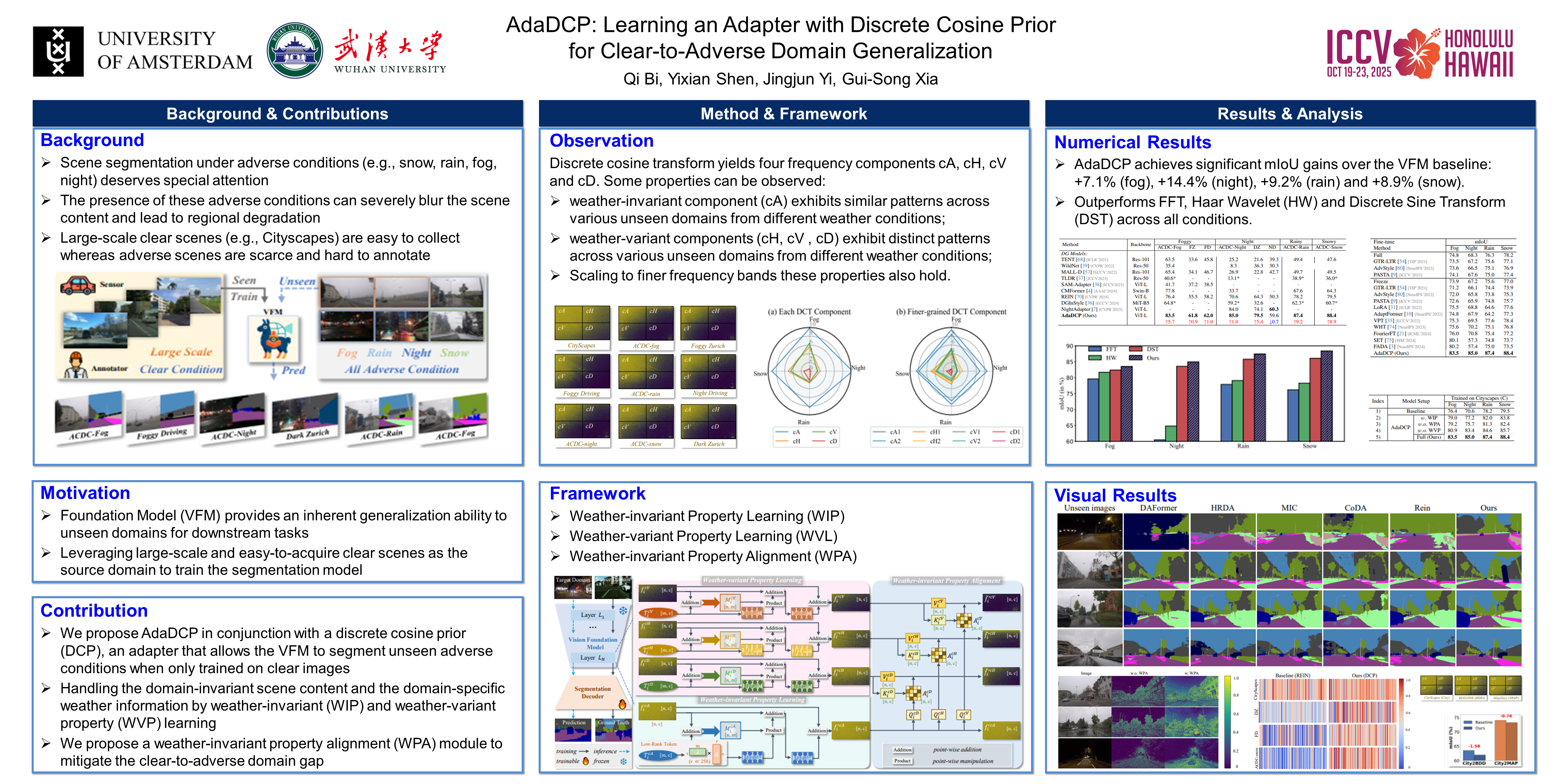 Vision Foundation Model (VFM) provides an inherent generalization ability to unseen domains for downstream tasks.However, fine-tuning VFM to parsing various adverse scenes (\eg, fog, snow, night) is particularly challenging, as these samples are difficult to collect and annotate.Using easy-to-acquire clear scenes as the source domain is a feasible solution, but a huge domain gap exists between them and clear scenes due to dramatically different scene appearance.In this paper, we propose \texttt{AdaDCP} to effectively fine-tune a VFM for adverse scene segmentation, by only generalizing from a clear source domain. Interestingly, the frequency bands from a VFM exhibit either variant or invariant properties on various adverse weather conditions after discerete cosine transform. Therefore, our \texttt{AdaDCP} is enpowered by three key components: (1) weather-invariant band adapation that provides a foundation to enhance the robustness to adverse scenes; (2) weather-variant band adapation that preceives the weather-specific information from each type of adverse scenes; (3) weather-invariant band alignment that implictly enforces the weather-variant bands to progressively incoperate the weather-invariant information, therefore mitigating the clear-to-adverse domain gap.Experiments conducted on eight unseen adverse scene segmentation datasets show its state-of-the-art performance.