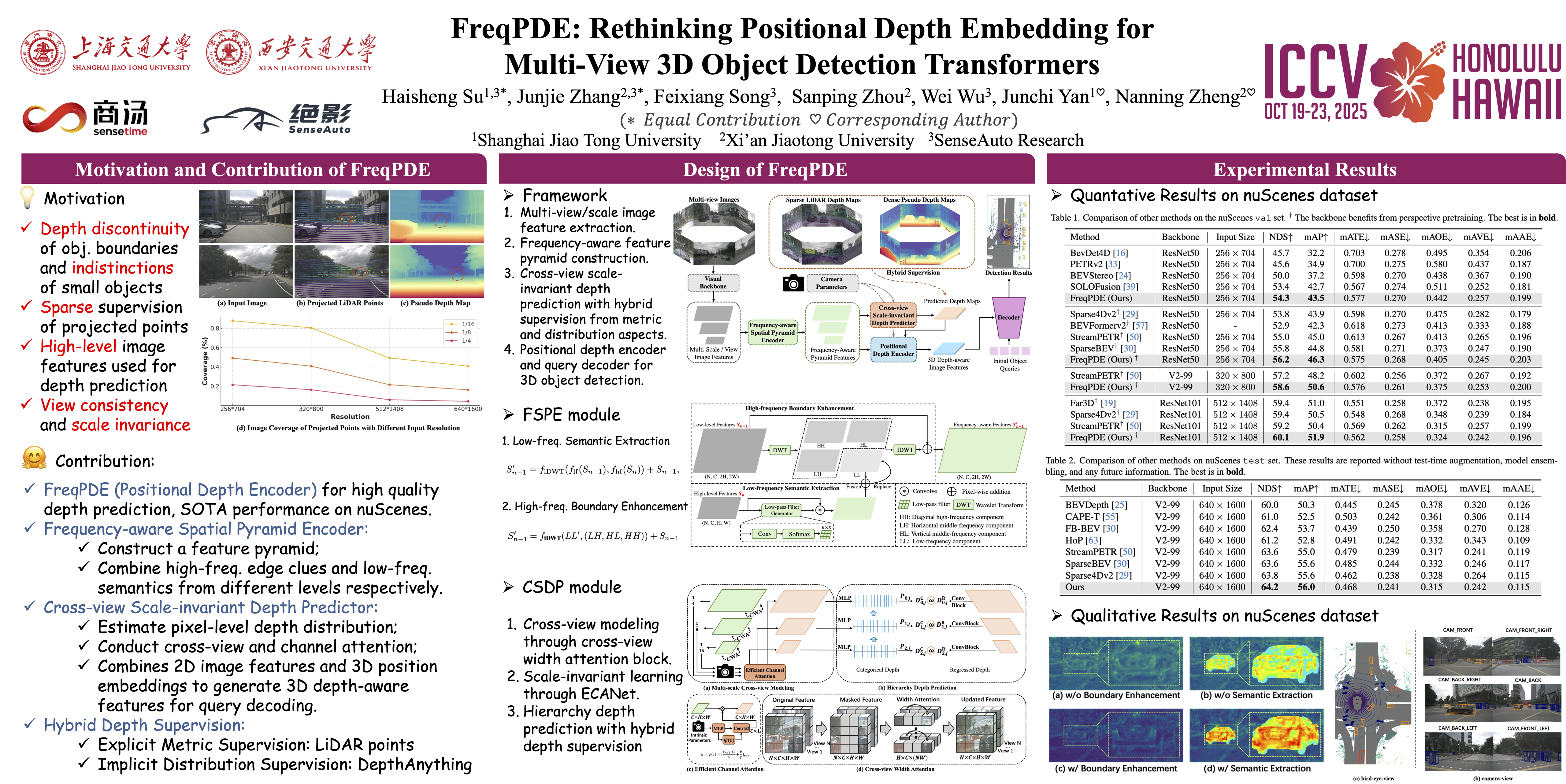 Detecting 3D objects accurately from multi-view 2D images is a challenging yet essential task in the field of autonomous driving. Current methods resort to integrating depth prediction to recover the spatial information for object query decoding, which necessitates explicit supervision from LiDAR points during the training phase. However, the predicted depth quality is still unsatisfactory such as depth discontinuity of object boundaries and indistinction of small objects, which are mainly caused by the sparse supervision of projected points and the use of high-level image features for depth prediction. Besides, cross-view consistency and scale invariance are also overlooked in previous methods. In this paper, we introduce Frequency-aware Positional Depth Embedding (FreqPDE) to equip 2D image features with spatial information for 3D detection transformer decoder, which can be obtained through three main modules. Specifically, the Frequency-aware Spatial Pyramid Encoder (FSPE) constructs a feature pyramid by combining high-frequency edge clues and low-frequency semantics from different levels respectively. Then the Cross-view Scale-invariant Depth Predictor (CSDP) estimates the pixel-level depth distribution with cross-view and efficient channel attention mechanism. Finally, the Positional Depth Encoder (PDE) combines the 2D image features and 3D position embeddings to generate the 3D depth-aware features for query decoding. Additionally, hybrid depth supervision is adopted for complementary depth learning from both metric and distribution aspects. Extensive experiments conducted on the nuScenes dataset demonstrate the effectiveness and superiority of our proposed method.