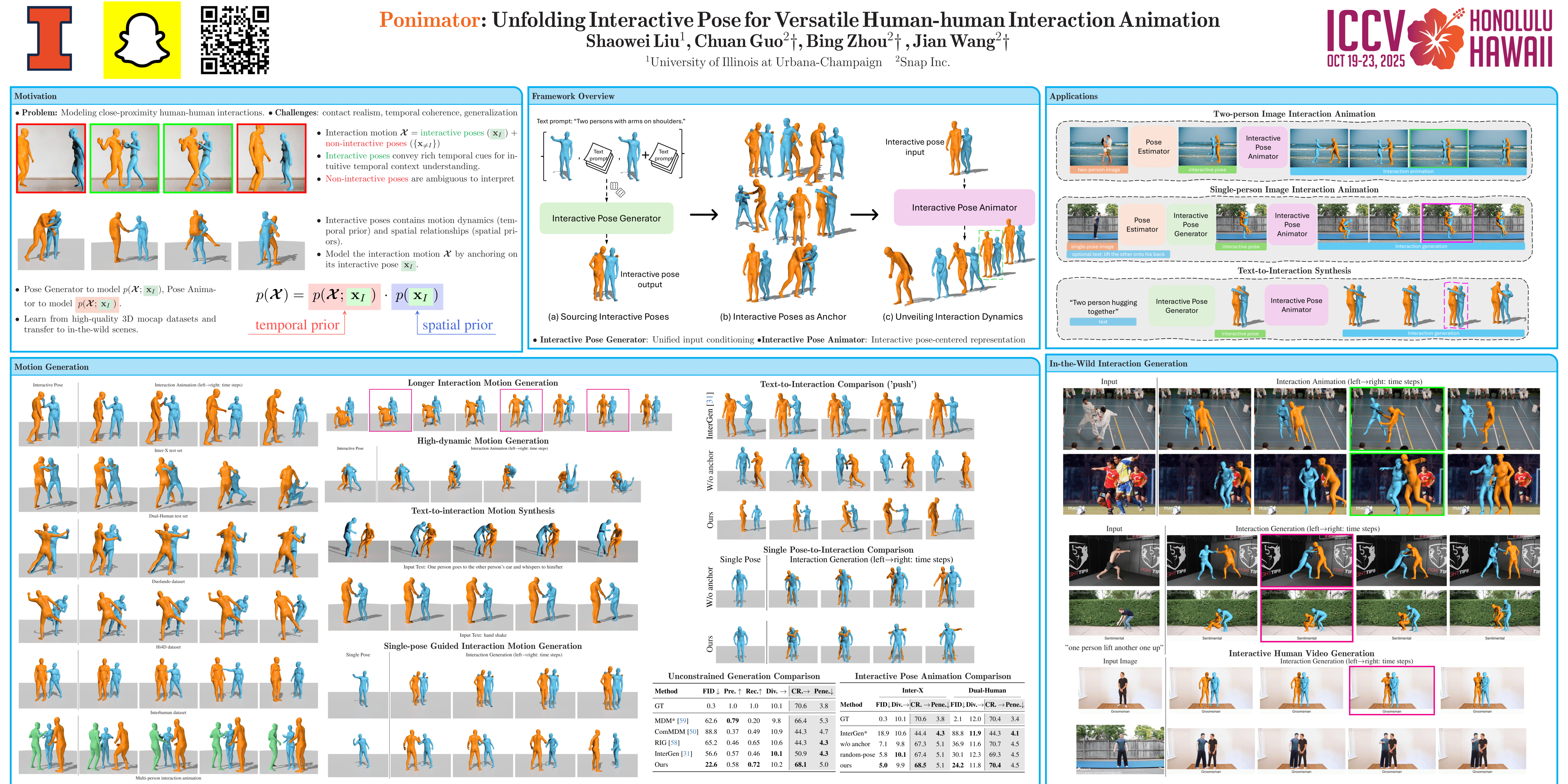 Close-proximity human-human interactive poses convey rich contextual information about interaction dynamics. Given such poses, humans can intuitively infer the context and anticipate possible past and future dynamics, drawing on strong priors of human behavior. Inspired by this observation, we propose Ponimator, a simple framework anchored on proximal interactive poses for versatile interaction animation. Our training data consists of close-contact two-person poses and their surrounding temporal context from motion-capture interaction datasets. Leveraging interactive pose priors, Ponimator employs two conditional diffusion models: (1) a pose animator that uses the temporal prior to generate dynamic motion sequences from interactive poses, and (2) a pose generator that applies the spatial prior to synthesize interactive poses from a single pose, text, or both when interactive poses are unavailable. Collectively, Ponimator supports diverse tasks, including image-based interaction animation, reaction animation, and text-to-interaction synthesis, facilitating the transfer of interaction knowledge from high-quality mocap data to open-world scenarios. Empirical experiments across diverse datasets and applications demonstrate the universality of the pose prior and the effectiveness and robustness of our framework.