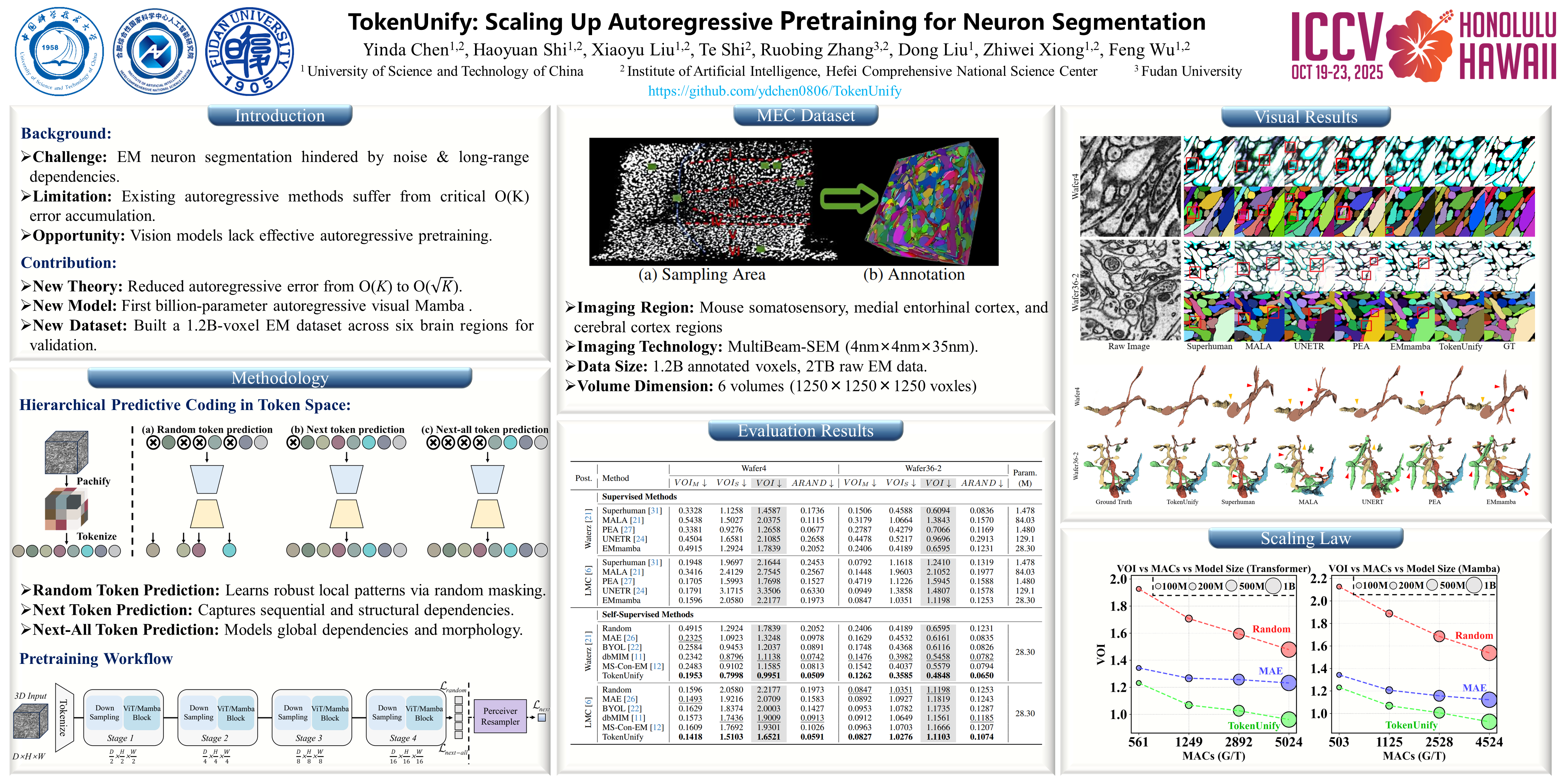 Neuron segmentation from electron microscopy (EM) volumes is crucial for understanding brain circuits, yet the complex neuronal structures in high-resolution EM images present significant challenges. Inspired by autoregressive pretraining in language models, we propose TokenUnify, a hierarchical predictive coding framework that captures multi-scale dependencies through complementary learning objectives. TokenUnify integrates random token prediction, next-token prediction, and next-all token prediction to create a comprehensive representational space with emergent properties. From an information-theoretic perspective, these three tasks are complementary and provide optimal coverage of visual data structure. We also introduce a large-scale EM dataset with 1.2 billion annotated voxels, offering ideal long-sequence visual data with spatial continuity. Leveraging the Mamba architecture's linear-time sequence modeling capabilities, TokenUnify achieves a 45\% performance improvement on downstream neuron segmentation and outperforms MAE by 21\%. Our approach demonstrates superior scaling properties as model size increases, effectively bridging the gap between pretraining strategies for language and vision models.