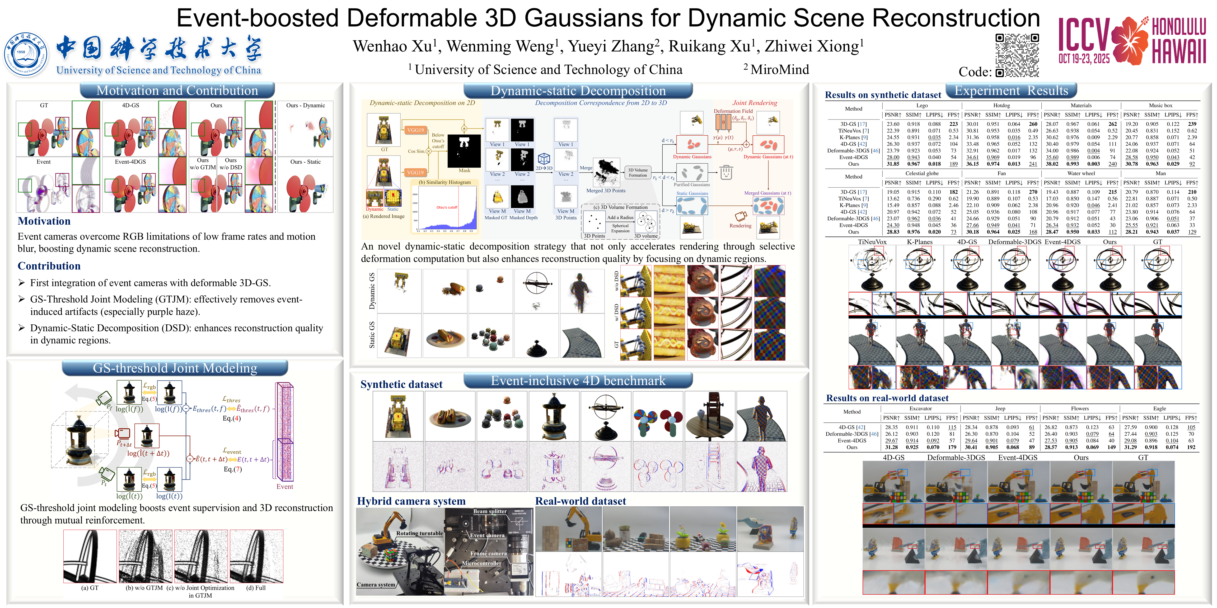 Deformable 3D Gaussian Splatting (3D-GS) is limited by missing intermediate motion information due to the low temporal resolution of RGB cameras. To address this, we introduce the first approach combining event cameras, which capture high-temporal-resolution, continuous motion data, with deformable 3D-GS for dynamic scene reconstruction. We observe that threshold modeling for events plays a crucial role in achieving high-quality reconstruction. Therefore, we propose a GS-Threshold Joint Modeling strategy, creating a mutually reinforcing process that greatly improves both 3D reconstruction and threshold modeling. Moreover, we introduce a Dynamic-Static Decomposition strategy that first identifies dynamic areas by exploiting the inability of static Gaussians to represent motions, then applies a buffer-based soft decomposition to separate dynamic and static areas. This strategy accelerates rendering by avoiding unnecessary deformation in static areas, and focuses on dynamic areas to enhance fidelity. Additionally, we contribute the first event-inclusive 4D benchmark with synthetic and real-world dynamic scenes, on which our method achieves state-of-the-art performance.