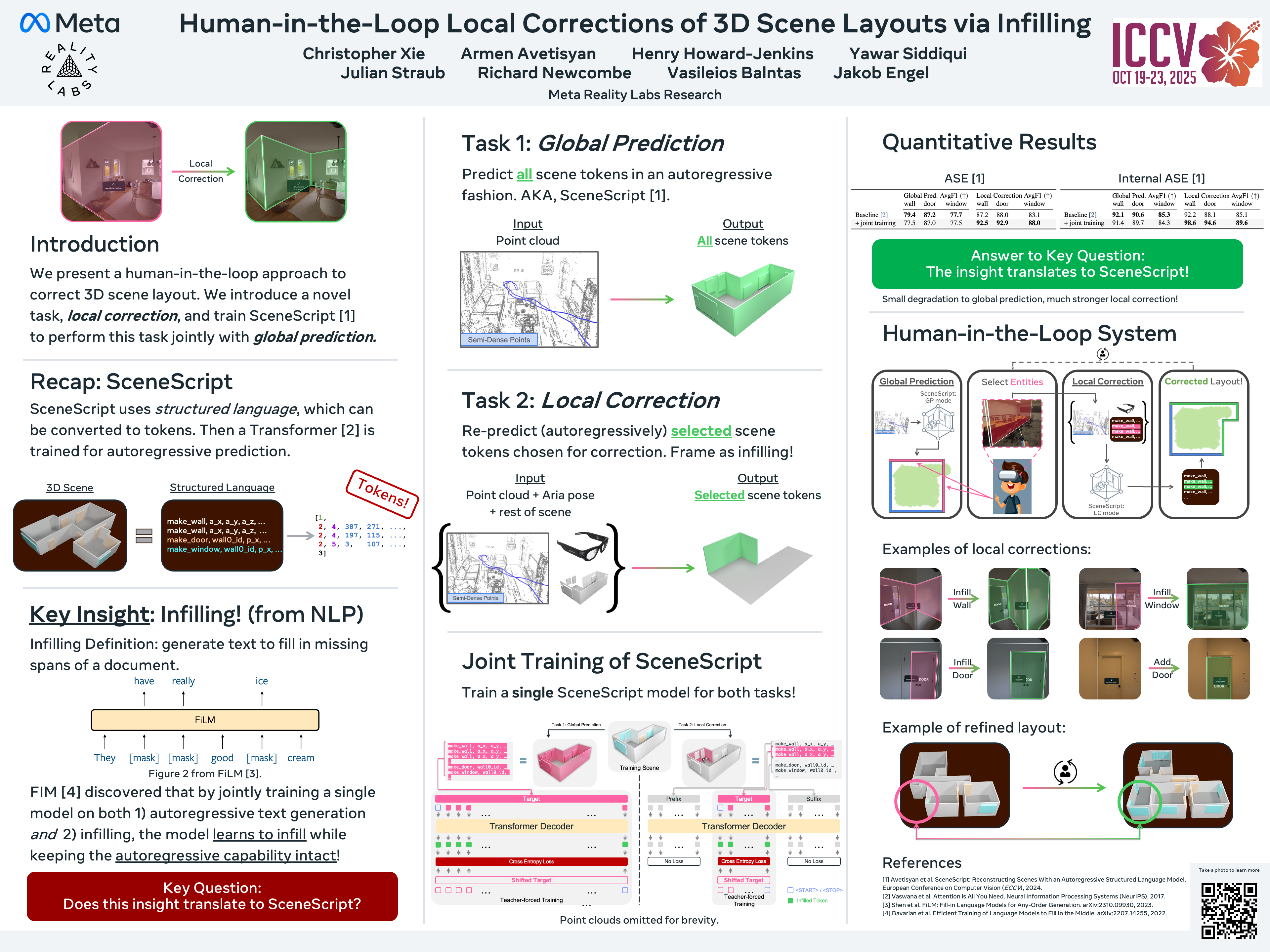 We present a novel human-in-the-loop approach to estimate 3D scene layout that uses human feedback from an egocentric standpoint. We study this approach through introduction of a novel local correction task, where users identify local errors and prompt a model to automatically correct them. Building on SceneScript, a state-of-the-art framework for 3D scene layout estimation that leverages structured language, we propose a solution that structures this problem as "infilling", a task studied in natural language processing. We train a multi-task version of SceneScript that maintains performance on global predictions while significantly improving its local correction ability. We integrate this into a human-in-the-loop system, enabling a user to iteratively refine scene layout estimates via a low-friction "one-click fix'' workflow. Our system enables the final refined layout to diverge from the training distribution, allowing for more accurate modelling of complex layouts.