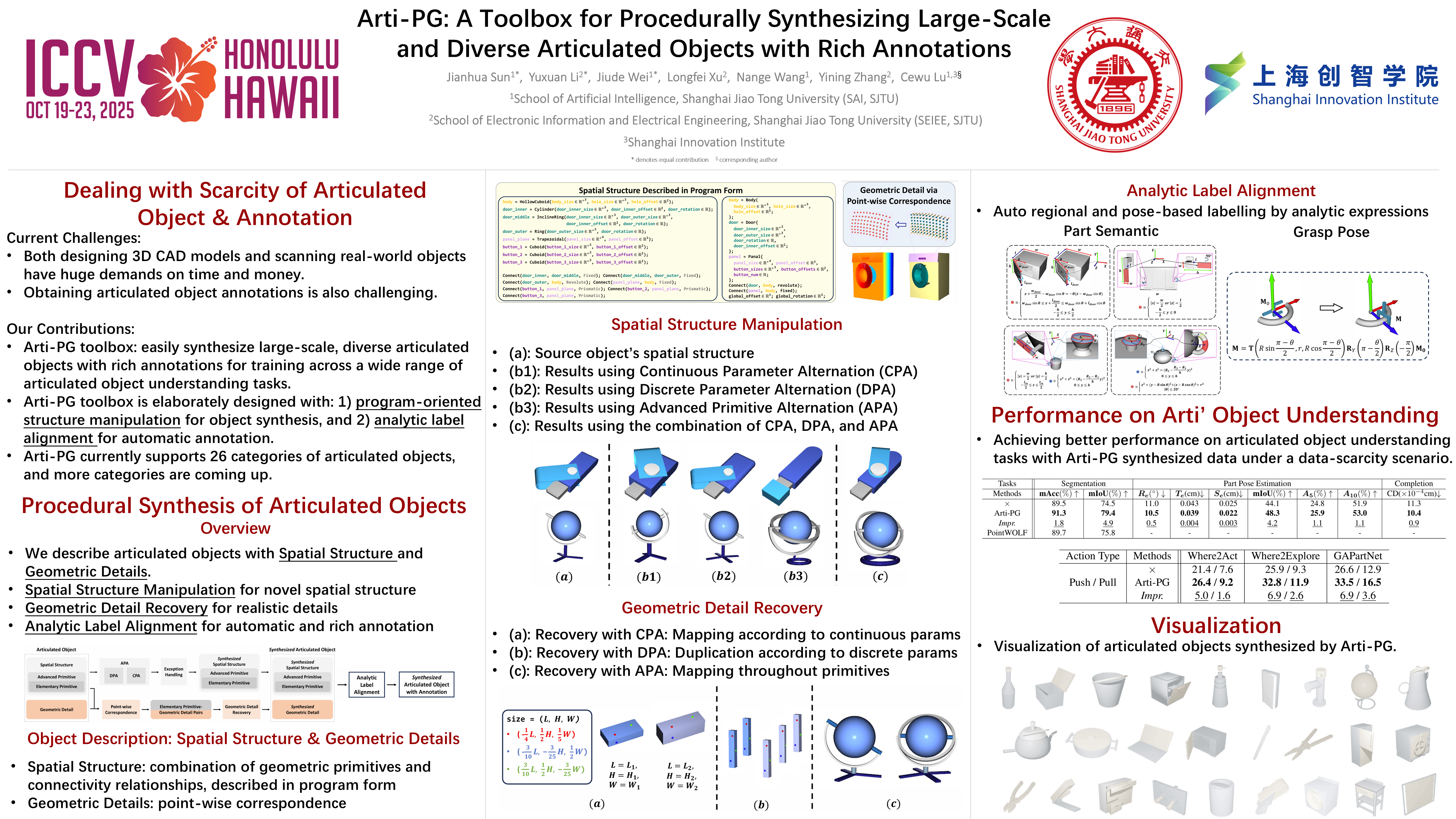 The acquisition of substantial volumes of 3D articulated object data is expensive and time-consuming, and consequently the scarcity of 3D articulated object data becomes an obstacle for deep learning methods to achieve remarkable performance in various articulated object understanding tasks. Meanwhile, pairing these object data with detailed annotations to enable training for various tasks is also difficult and labor-intensive to achieve. In order to expeditiously gather a significant number of 3D articulated objects with comprehensive and detailed annotations for training, we propose Articulated Object Procedural Generation toolbox, a.k.a. Arti-PG toolbox. Arti-PG toolbox consists of i) descriptions of articulated objects by means of a generalized structure program along with their analytic correspondence to the objects’ point cloud, ii) procedural rules about manipulations on the structure program to synthesize large-scale and diverse new articulated objects, and iii) mathematical descriptions of knowledge (e.g. affordance, semantics, etc.) to provide annotations to the synthesized object. Arti-PG has two appealing properties for providing training data for articulated object understanding tasks: i) objects are created with unlimited variations in shape through program-oriented structure manipulation, ii) Arti-PG is widely applicable to diverse tasks by easily providing comprehensive and detailed annotations. Arti-PG now supports the procedural generation of 26 categories of articulate objects and provides annotations across a wide range of both vision and manipulation tasks, and we provide exhaustive experiments which fully demonstrate its advantages. We will make Arti-PG toolbox publicly available for the community to use. More details, analysis and discussions are provided in the supplementary materials.