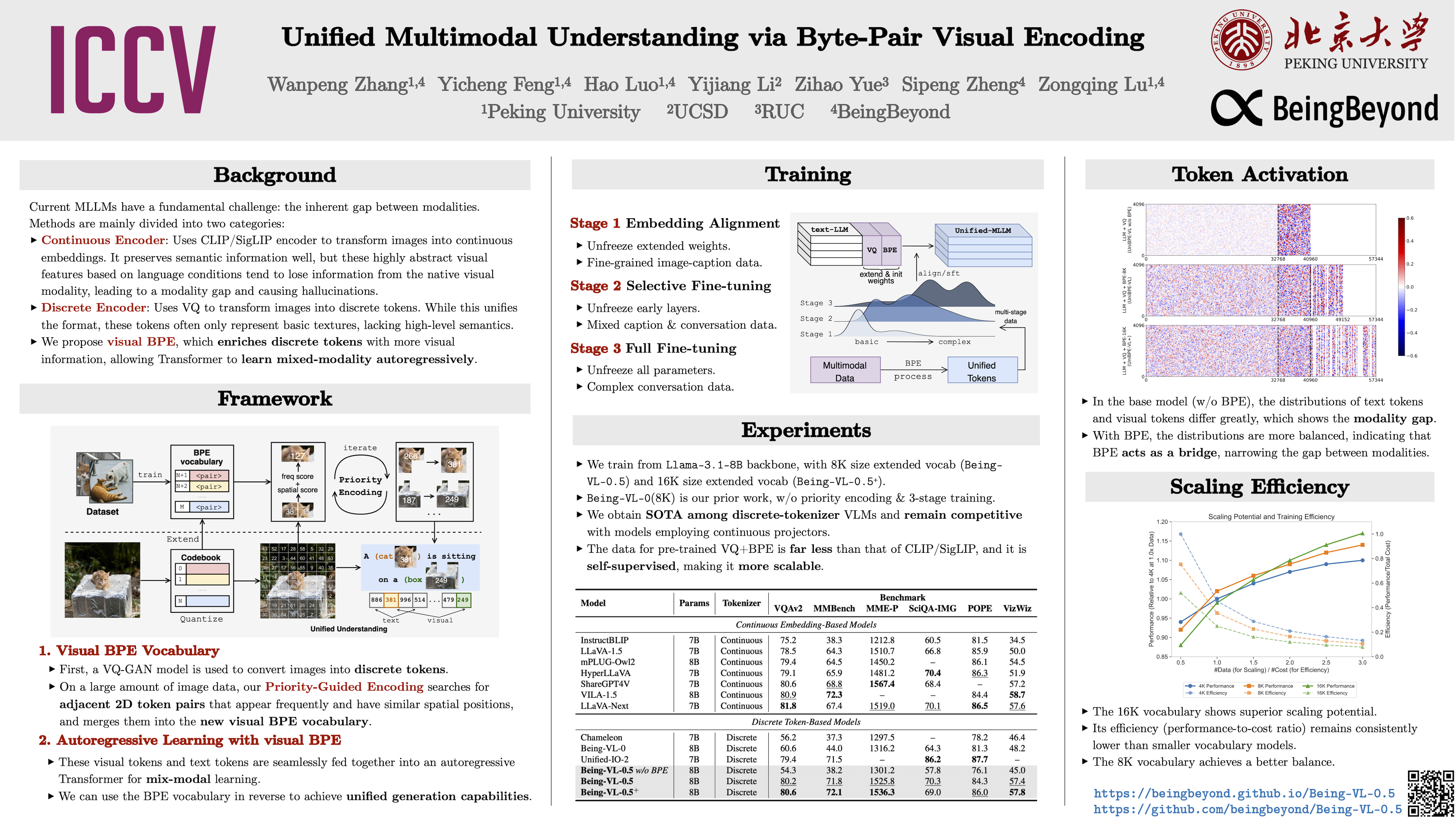 Multimodal large language models (MLLMs) have made significant progress in vision-language understanding, yet effectively aligning different modalities remains a fundamental challenge. We present a framework that unifies multimodal understanding by applying byte-pair encoding to visual tokens. Unlike conventional approaches that rely on modality-specific encoders, our method directly incorporates structural information into visual tokens, mirroring successful tokenization strategies in text-only language models. We introduce a priority-guided encoding scheme that considers both frequency and spatial consistency, coupled with a multi-stage training procedure based on curriculum-driven data composition. These enhancements enable the transformer model to better capture cross-modal relationships and reason with visual information. Comprehensive experiments demonstrate improved performance across diverse vision-language tasks. By bridging the gap between visual and textual representations, our approach contributes to the advancement of more capable and efficient multimodal foundation models.