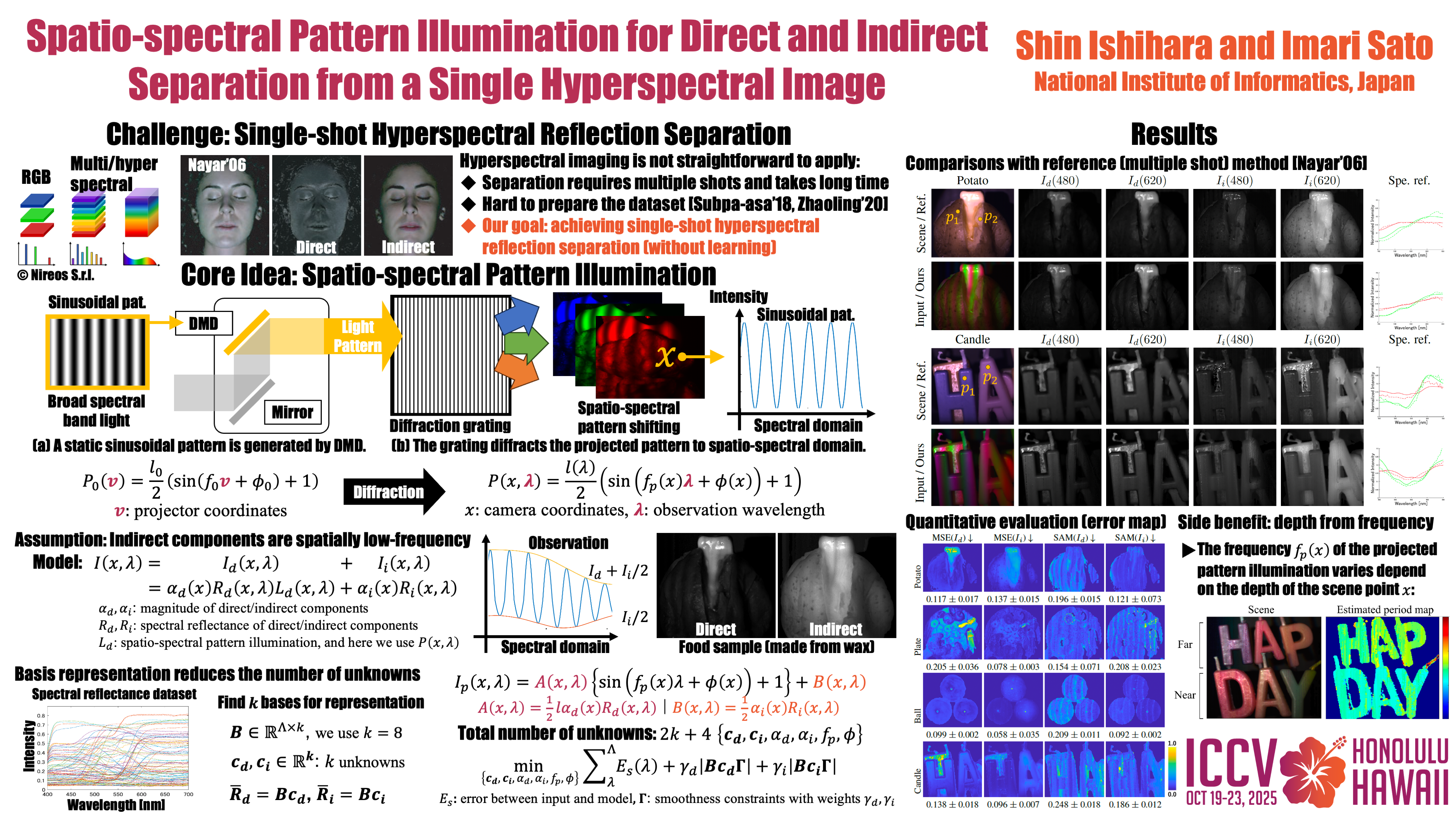 Hyperspectral imaging has proven effective for appearance inspection because it can identify material compositions and reveal hidden features. Similarly, direct/indirect separation provides essential information about surface appearance and internal conditions, including layer structures and scattering behaviors. This paper presents a novel illumination system incorporating dispersive optics to unify both advantages for scene analyses. In general, achieving distinct direct/indirect separation requires multiple images with varying patterns. In a hyperspectral scenario, using a hyperspectral camera or tunable filters extends exposure and measurement times, hindering practical application.Our proposed system enables the illumination of a wavelength-dependent, spatially shifted pattern. With proper consideration of reflectance differences, we demonstrate robust separation of direct and indirect components for each wavelength can be achieved using a single hyperspectral image taken under one illumination pattern. Furthermore, we demonstrate analyzing the observed differences across wavelengths contributes to estimating depth.