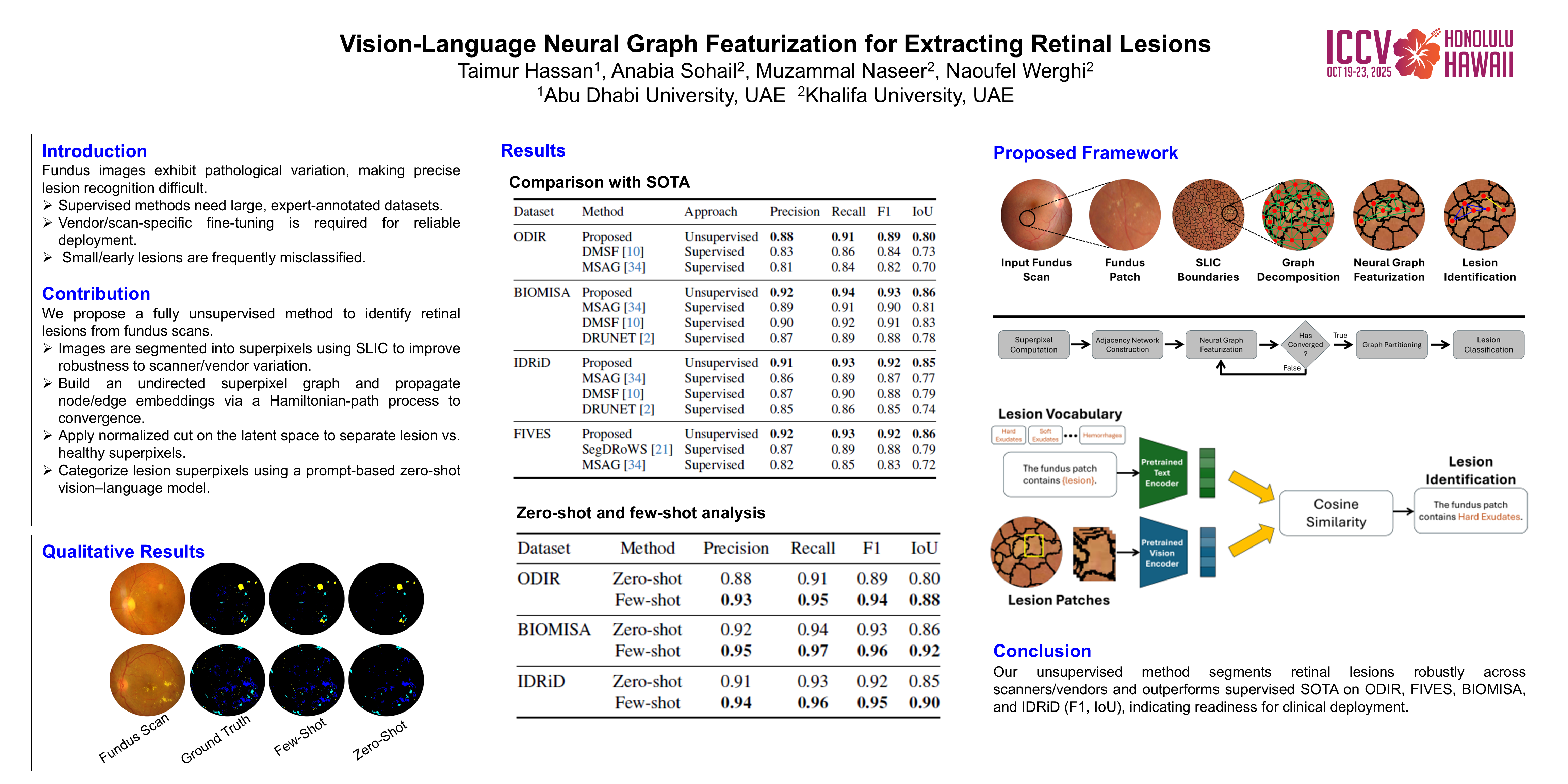 Retinopathy comprises a group of retinal disorders that can lead to severe visual impairment or blindness. The heterogeneous morphology of lesions poses a significant challenge in developing robust diagnostic systems. Supervised approaches rely on large labeled datasets and often struggle with generalization. To address these limitations, we propose an unsupervised vision-language neural graph featurization method. This method first segments fundus images into a set of super-pixels via Simple Linear Iterative Clustering (SLIC). The super-pixel regions are then decomposed into an undirected graph where each super-pixel serve as a node, and spatially adjacent nodes are connected by edges. A Hamiltonian path systematically traverses the graph and iteratively update and propagate node and edge latent space embeddings throughout the graph until convergence is achieved. Then, a normalized cut separates the converged embeddings into two clusters within a latent space that represent the lesion and healthy super-pixel regions of the input scans. The lesion super-pixels are further classified into lesion categories using prompt-based zero-shot vision-language model. The proposed method is rigorously tested on three public datasets, dubbed ODIR, BIOMISA, and IDRiD, achieving F1-scores of 0.89, 0.93, and 0.92, respectively, with significant performance gains over state-of-the-art methods.