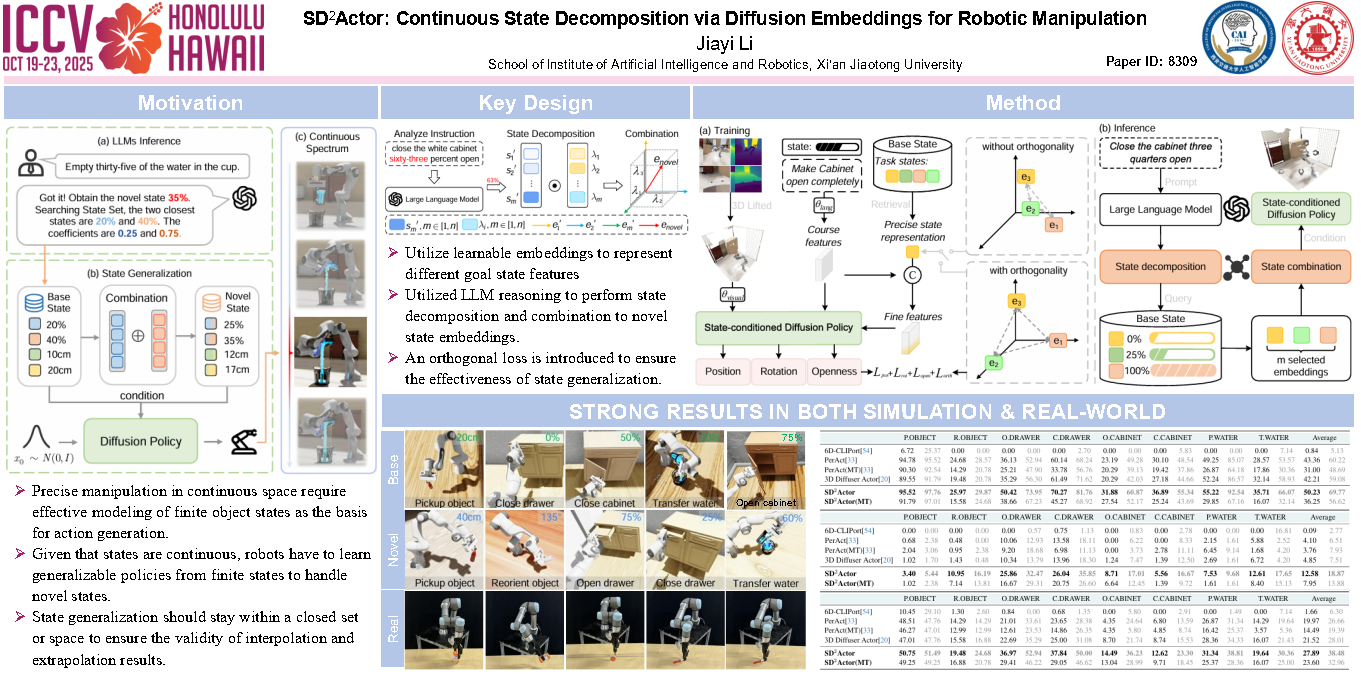 Language-conditioned robot manipulation in the continuous spectrum presents a persistent challenge due to the difficult of mapping states to target actions. Previous methods face limitations in effectively modeling object states, primarily due to their reliance on executing ambiguous instructions devoid of explicit state information. In response, we present SD$^2$Actor, a zero-shot robotic manipulation framework that possesses the capability to generate precise actions in continuous states. Specifically, given the novel instructions, we aim to generate instruction-following and accurate robot manipulation actions. Instead of time-consuming optimization and finetuning, our zero-shot method generalizes to any object state with a wide range of translations and versatile rotations. At its core, we quantify multiple base states in the training set and utilize their combination to refine the target action generated by the diffusion model. To obtain novel state representations, we initially employ LLMs to extract the novel state from the instruction and decompose it into multiple learned base states. We then employ the linear combination of base state embeddings to produce novel state features. Moreover, we introduce the orthogonalization loss to constrain the state embedding space, which ensures the validity of linear interpolation. Experiments demonstrate that SD$^2$Actor outperforms state-of-the-art methods across a diverse range of manipulation tasks in ARNOLD Benchmark. Moreover, SD$^2$Actor can effectively learn generalizable policies from a limited number of human demonstrations, achieving promising accuracy in a variety of real-world manipulation tasks.