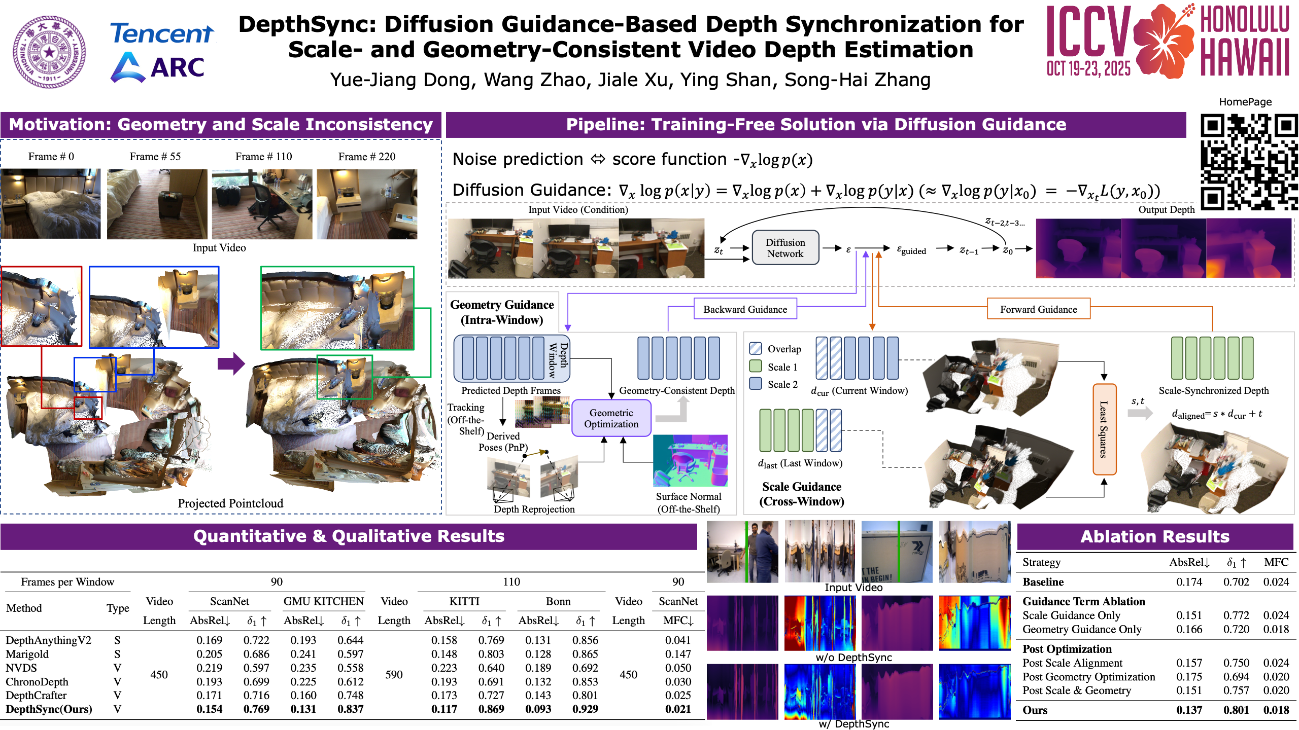 Diffusion-based video depth estimation methods have achieved remarkable success with strong generalization ability. However, predicting depth for long videos remains challenging. Existing methods typically split videos into overlapping sliding windows, leading to accumulated scale discrepancies across different windows, particularly as the number of windows increases. Additionally, these methods rely solely on 2D diffusion priors, overlooking the inherent 3D geometric structure of video depths, which results in geometrically inconsistent predictions.In this paper, we propose DepthSync, a novel, training-free framework using diffusion guidance to achieve scale- and geometry-consistent depth predictions for long videos. Specifically, we introduce \textbf{scale guidance} to synchronize the depth scale \textbf{across windows} and \textbf{geometry guidance} to enforce geometric alignment \textbf{within windows} based on the inherent 3D constraints in video depths. These two terms work synergistically, steering the denoising process toward consistent depth predictions. Experiments on various datasets validate the effectiveness of our method in producing depth estimates with improved scale and geometry consistency, particularly for long videos.